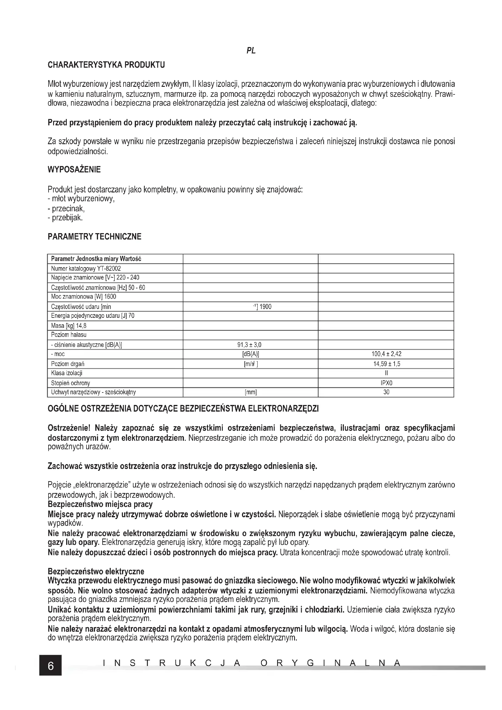 CHARAKTERYSTYKA PRODUKTU Młot wyburzeniowy jest narzędziem zwykłym, II klasy izolacji, przeznaczonym do wykonywania prac wyburzeniowych i dłutowania w kamieniu naturalnym, sztucznym, marmurze itp. za pomocą narzędzi roboczych wyposażonych w chwyt sześciokątny. Prawi- dłowa, niezawodna i bezpieczna praca elektronarzędzia jest zależna od właściwej eksploatacji, dlatego: Przed przystąpieniem do pracy produktem należy przeczytać całą instrukcję i zachować ją. Za szkody powstałe w wyniku nie przestrzegania przepisów bezpieczeństwa i zaleceń niniejszej instrukcji dostawca nie ponosi odpowiedzialności. WYPOSAŻENIE Produkt jest dostarczany jako kompletny, w opakowaniu powinny się znajdować: - młot wyburzeniowy, - przecinak, - przebijak. PARAMETRY TECHNICZNE Parametr Jednostka miary Wartość Numer katalogowy YT-82002 Napięcie znamionowe [V~] 220 - 240 Częstotliwość znamionowa [Hz] 50 - 60 Moc znamionowa [W] 1600 Częstotliwość udaru [min