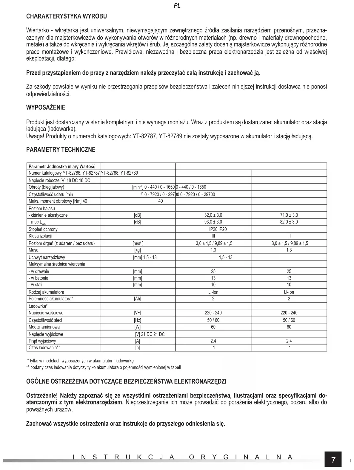 CHARAKTERYSTYKA WYROBU Wiertarko - wkrętarka jest uniwersalnym, niewymagającym zewnętrznego źródła zasilania narzędziem przenośnym, przezna- czonym dla majsterkowiczów do wykonywania otworów w różnorodnych materiałach (np. drewno i materiały drewnopochodne, metale) a także do wkręcania i wykręcania wkrętów i śrub. Jej szczególne zalety docenią majsterkowicze wykonujący różnorodne prace montażowe i wykończeniowe. Prawidłowa, niezawodna i bezpieczna praca elektronarzędzia jest zależna od właściwej eksploatacji, dlatego: Przed przystąpieniem do pracy z narzędziem należy przeczytać całą instrukcję i zachować ją. Za szkody powstałe w wyniku nie przestrzegania przepisów bezpieczeństwa i zaleceń niniejszej instrukcji dostawca nie ponosi odpowiedzialności. WYPOSAŻENIE Produkt jest dostarczany w stanie kompletnym i nie wymaga montażu. Wraz z produktem są dostarczane: akumulator oraz stacja ładująca (ładowarka). Uwaga! Produkty o numerach katalogowych: YT-82787, YT-82789 nie zostały wyposa żone w akumulator i stację ładującą. PARAMETRY TECHNICZNE Parametr Jednostka miary Wartość Numer katalogowy YT-82786, YT-82787 YT-82788, YT-82789 Napięcie robocze [V] 18 DC 18 DC Obroty (bieg jałowy) [min