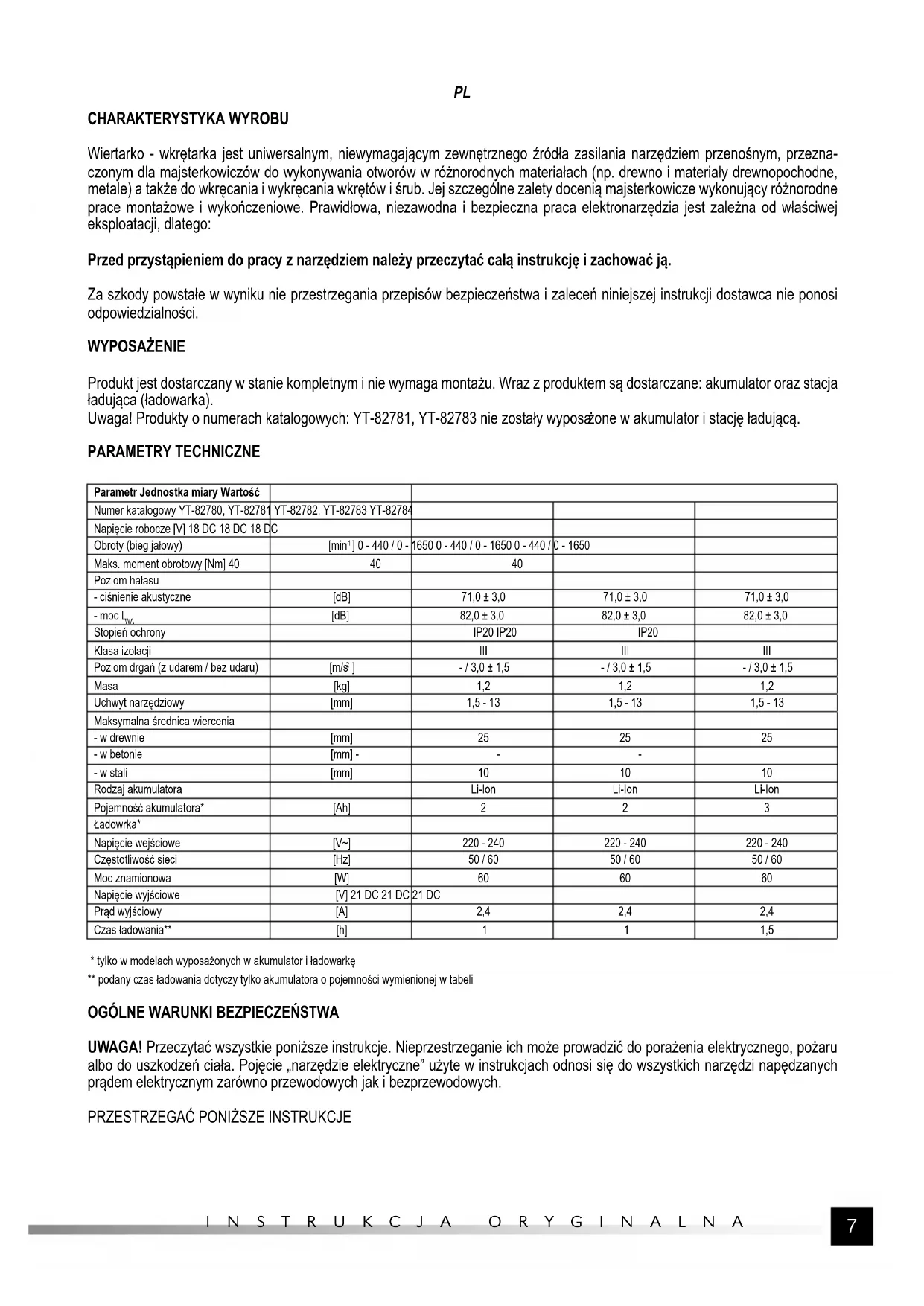 CHARAKTERYSTYKA WYROBU Wiertarko - wkrętarka jest uniwersalnym, niewymagającym zewnętrznego źródła zasilania narzędziem przenośnym, przezna- czonym dla majsterkowiczów do wykonywania otworów w różnorodnych materiałach (np. drewno i materiały drewnopochodne, metale) a także do wkręcania i wykręcania wkrętów i śrub. Jej szczególne zalety docenią majsterkowicze wykonujący różnorodne prace montażowe i wykończeniowe. Prawidłowa, niezawodna i bezpieczna praca elektronarzędzia jest zależna od właściwej eksploatacji, dlatego: Przed przystąpieniem do pracy z narzędziem należy przeczytać całą instrukcję i zachować ją. Za szkody powstałe w wyniku nie przestrzegania przepisów bezpieczeństwa i zaleceń niniejszej instrukcji dostawca nie ponosi odpowiedzialności. WYPOSAŻENIE Produkt jest dostarczany w stanie kompletnym i nie wymaga montażu. Wraz z produktem są dostarczane: akumulator oraz stacja ładująca (ładowarka). Uwaga! Produkty o numerach katalogowych: YT-82781, YT-82783 nie zostały wyposa żone w akumulator i stację ładującą. PARAMETRY TECHNICZNE Parametr Jednostka miary Wartość Numer katalogowy YT-82780, YT-82781 YT-82782, YT-82783 YT-82784 Napięcie robocze [V] 18 DC 18 DC 18 DC Obroty (bieg jałowy) [min