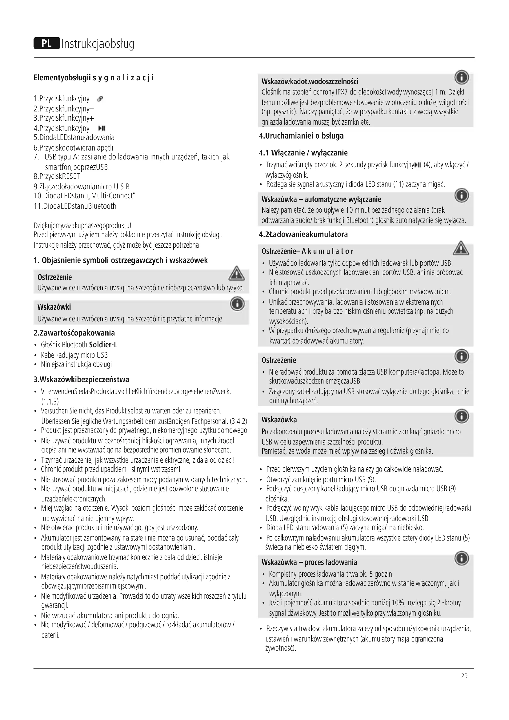 - Nie modykować /deformować /podgrzewać /rozkładać akumulatorów/ baterii. Wskazówka dot. wodoszczelności Głośnik ma stopień ochronyIPX7 do głębokości wody wynoszącej 1m.Dzięki temumożliwejestbezproblemowe stosowanie wotoczeniu odużej wilgotności (np.prysznic). Należypamiętać, żewprzypadkukontaktu zwodą wszystkie gniazda ładowania muszą być zamknięte.