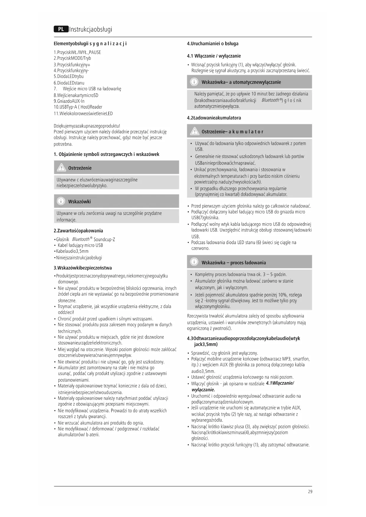 - Przed pierwszym użyciem głośnika należygocałkowicie naładować.