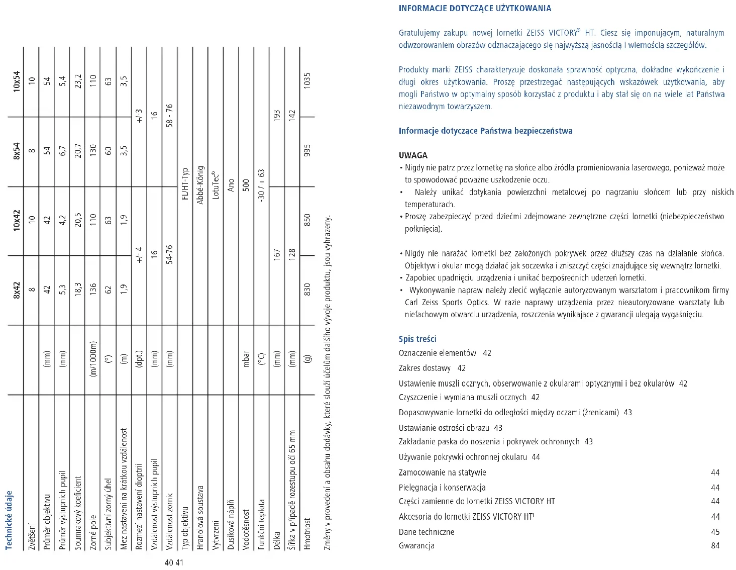 HT. Ciesz się imponującym, naturalnym odwzorowaniem obrazów odznaczającego się najwyższą jasnością i wiernością szczegółów. Produkty marki ZEISS charakteryzuje doskonała sprawność optyczna, dokładne wykończenie i długi okres użytkowania. Proszę przestrzegać następujących wskazówek użytkowania, aby mogli Państwo w optymalny sposób korzystać z produktu i aby stał się on na wiele lat Państwa niezawodnym towarzyszem. Informacje dotyczące Państwa bezpieczeństwa UWAGA Nigdy nie patrz przez lornetkę na słońce albo źródła promieniowania laserowego, ponieważ może to spowodować poważne uszkodzenie oczu. Należy unikać dotykania powierzchni metalowej po nagrzaniu słońcem lub przy niskich temperaturach. Proszę zabezpieczyć przed dziećmi zdejmowane zewnętrzne części lornetki (niebezpieczeństwo połknięcia). Nigdy nie narażać lornetki bez założonych pokrywek przez dłuższy czas na działanie słońca. Objektyw i okular mogą działać jak soczewka i zniszczyć części znajdujące się wewnątrz lornetki. Zapobiec upadnięciu urządzenia i unikać bezpośrednich uderzeń lornetki. Wykonywanie napraw należy zlecić wyłącznie autoryzowanym warsztatom i pracownikom firmy Carl Zeiss Sports Optics. W razie naprawy urządzenia przez nieautoryzowane warsztaty lub niefachowym otwarciu urządzenia, roszczenia wynikające z gwarancji ulegają wygaśnięciu. Spis treści Oznaczenie elementów 42 Zakres dostawy 42 Ustawienie muszli ocznych, obserwowanie z okularami optycznymi i bez okularów 42 Czyszczenie i wymiana muszli ocznych 42 Dopasowywanie lornetki do odległości między oczami (źrenicami) 43 Ustawianie ostrości obrazu 43 Zakładanie paska do noszenia i pokrywek ochronnych 43 Używanie pokrywki ochronnej okularu 44 Zamocowanie na statywie 44 Pielęgnacja i konserwacja 44 Części zamienne do lornetki ZEISS VICTORY HT 44 Akcesoria do lornetki ZEISS VICTORY HT