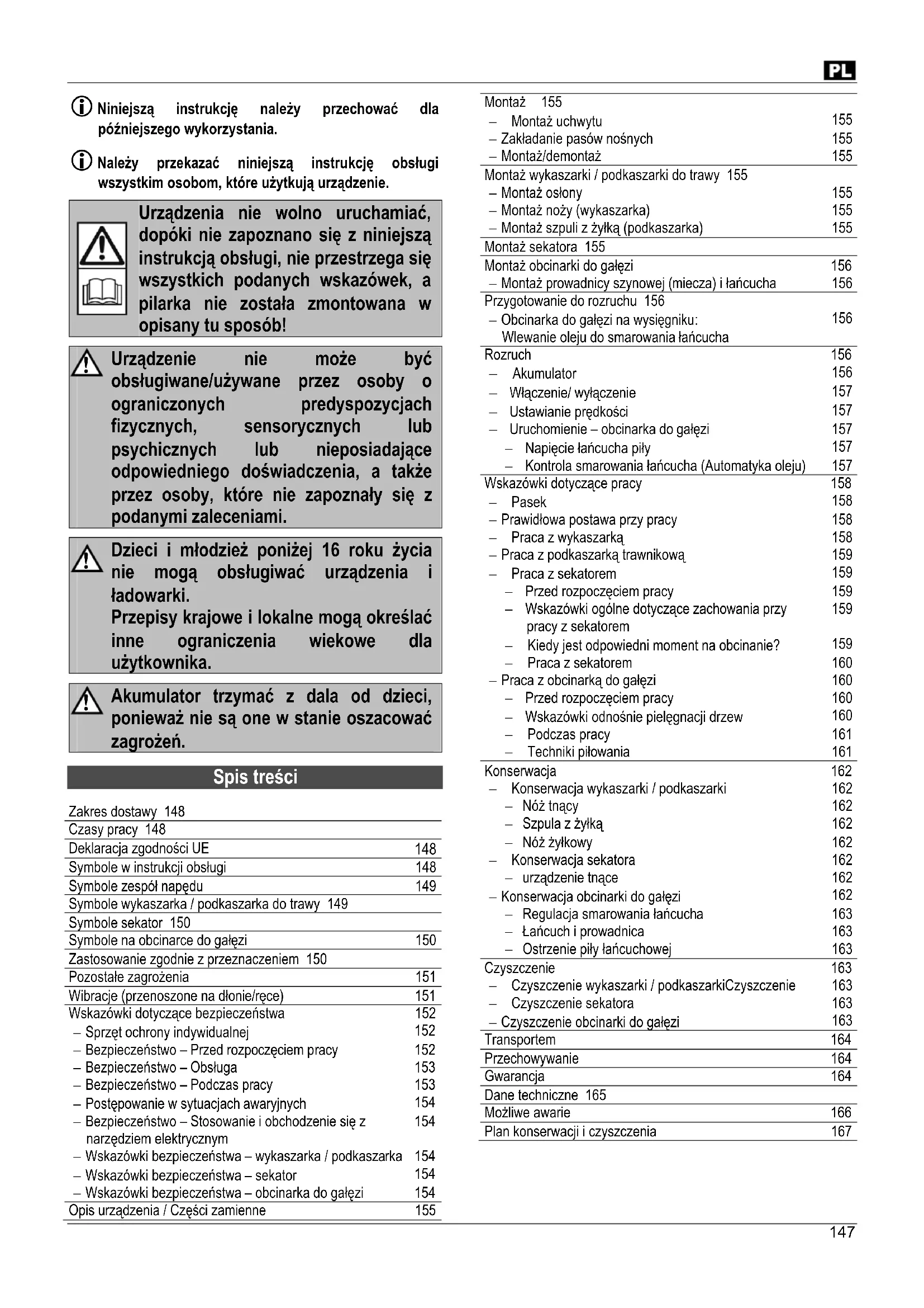Niniejszą instrukcję należy przechować dla późniejszego wykorzystania. Należy przekazać niniejszą instrukcję obsługi wszystkim osobom, które użytkują urządzenie. Urządzenia nie wolno uruchamiać, dopóki nie zapoznano się z niniejszą instrukcją obsługi, nie przestrzega się wszystkich podanych wskazówek, a pilarka nie została zmontowana w opisany tu sposób! Urządzenie nie może być obsługiwane/używane przez osoby o ograniczonych predyspozycjach fizycznych, sensorycznych lub psychicznych lub nieposiadające odpowiedniego doświadczenia, a także przez osoby, które nie zapoznały się z podanymi zaleceniami. Dzieci i młodzież poniżej 16 roku życia nie mogą obsługiwać urządzenia i ładowarki. Przepisy krajowe i lokalne mogą określać inne ograniczenia wiekowe dla użytkownika. Akumulator trzymać z dala od dzieci, ponieważ nie są one w stanie oszacować zagrożeń. Spis treści Zakres dostawy 148 Czasy pracy 148 Deklaracja zgodności UE Symbole w instrukcji obsługi 148 Symbole zespół napędu 149 Symbole wykaszarka / podkaszarka do trawy 149 Symbole sekator 150 Symbole na obcinarce do gałęzi 150 Zastosowanie zgodnie z przeznaczeniem 150 Pozostałe zagrożenia 151 Wibracje (przenoszone na dłonie/ręce) 151 Wskazówki dotyczące bezpieczeństwa 152 Sprzęt ochrony indywidualnej