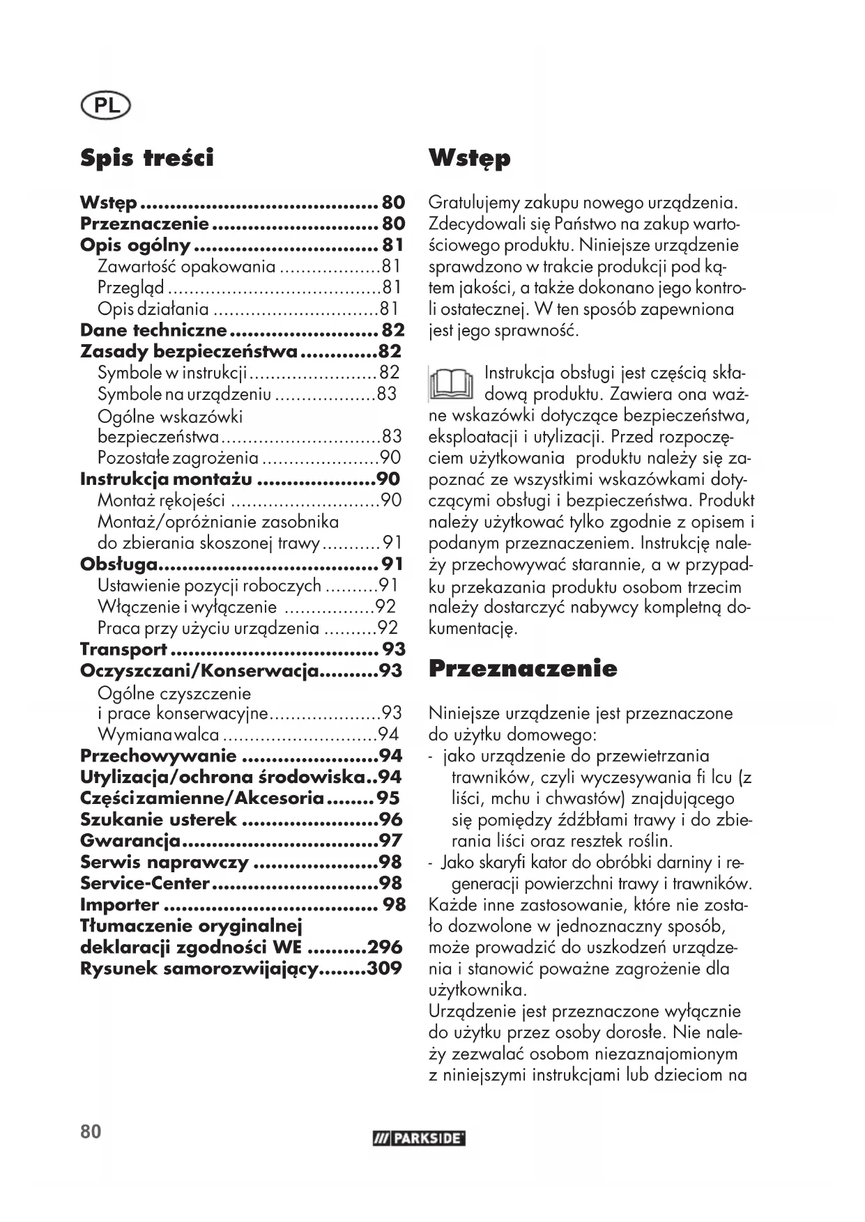 - Wstęp Gratulujemy zakupu nowego urządzenia. Zdecydowali się Państwo na zakup warto- ściowego produktu. Niniejsze urządzenie sprawdzono w trakcie produkcji pod ką- tem jakości, a także dokonano jego kontro- li ostatecznej. W ten sposób zapewniona jest jego sprawność. Instrukcja obsługi jest częścią skła- dową produktu. Zawiera ona waż- ne wskazówki dotyczące bezpieczeństwa, eksploatacji i utylizacji. Przed rozpoczę- ciem użytkowania produktu należy się za- poznać ze wszystkimi wskazówkami doty- czącymi obsługi i bezpieczeństwa. Produkt należy użytkować tylko zgodnie z opisem i podanym przeznaczeniem. Instrukcję nale- ży przechowywać starannie, a w przypad- ku przekazania produktu osobom trzecim należy dostarczyć nabywcy kompletną do- kumentację. Przeznaczenie Niniejsze urządzenie jest przeznaczone do użytku domowego: - jako urządzenie do przewietrzania trawników, czyli wyczesywania lcu (z liści, mchu i chwastów) znajdującego się pomiędzy źdźbłami trawy i do zbie- rania liści oraz resztek roślin. - Jako skary kator do obróbki darniny i re- generacji powierzchni trawy i trawników. Każde inne zastosowanie, które nie zosta- ło dozwolone w jednoznaczny sposób, może prowadzić do uszkodzeń urządze- nia i stanowić poważne zagrożenie dla użytkownika. Urządzenie jest przeznaczone wyłącznie do użytku przez osoby dorosłe. Nie nale- ży zezwalać osobom niezaznajomionym z niniejszymi instrukcjami lub dzieciom na Tłumaczenie oryginalnej deklaracji zgodności WE p. 296