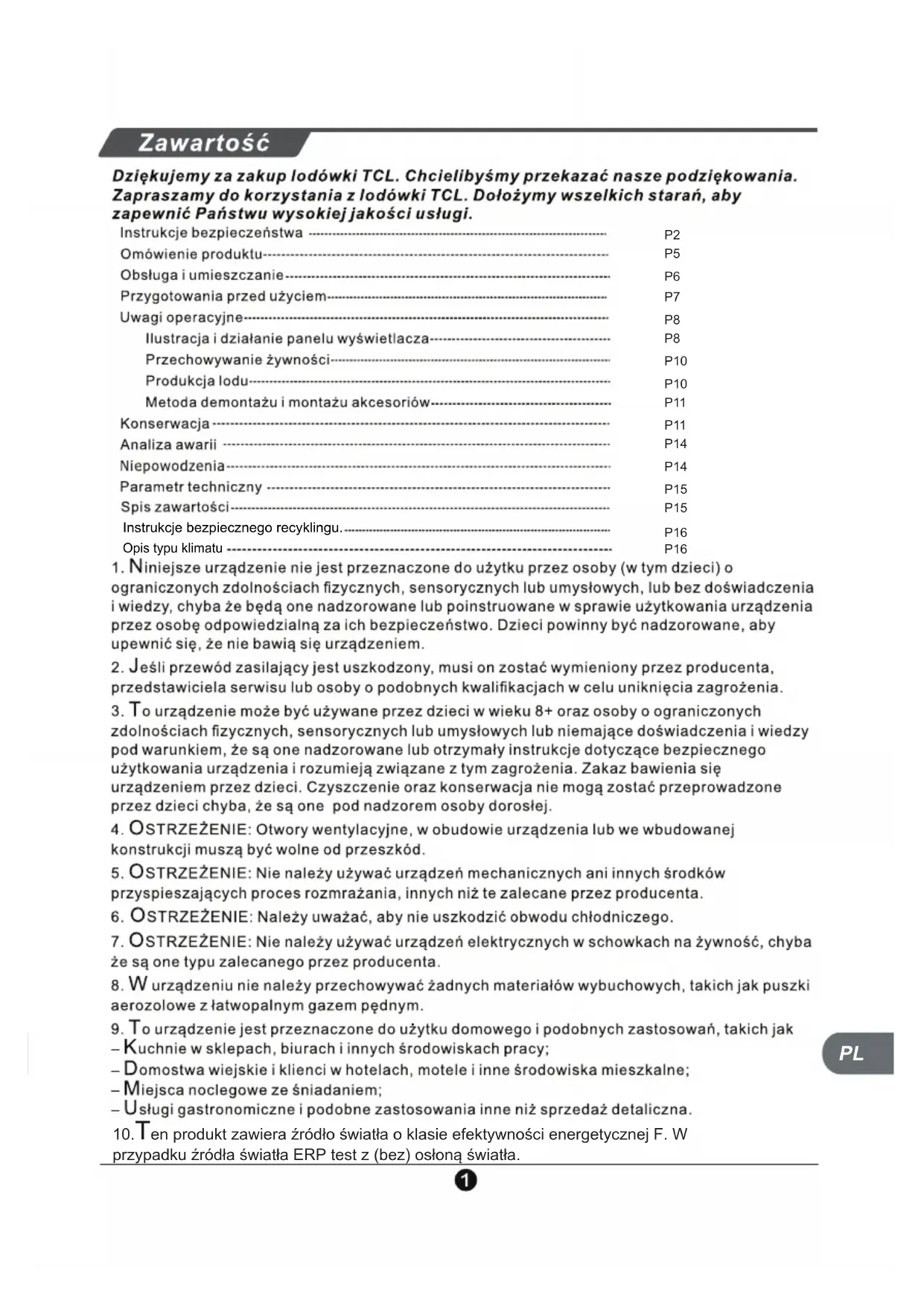 SN + 10 to + 32+ 16 to + 32+ 16 to + 38+ 16 to + 43TKlasa Rozszerzony umiarkowanyUmiarkowany SubtropikalnyTropikalny Tabela 1 Klasy klimatyczne Rozszerzona temperatura: „to urz ądzenie chłodnicze jest przeznaczone do użytku w temperaturze otoczenia w zakresie od 10 ° C do 32 ° C”; umiarkowany: „niniejsze urządzenie chłodnicze jest przeznaczone do użytku w temperaturze otoczenia w zakresie od 16 ° C do 32 ° C”; Subtropikalne: „to urządzenie chłodnicze jest przeznaczone do użytku w temperaturach otoczenia w zakresie od 16 ° C do 38 ° C”; Tropical: „to urządzenie chłodnicze jest przeznaczone do użytku w temperaturach otoczenia w zakresie od 16 ° C do 43 ° C”; Opis typu klimatu Szanowny Kliencie Szanowny Kliencie, jeśli potrzebujesz obsługi klienta, sprawdź kartę gwarancyjną, aby uzyskać dalsze informacje Sprzedaż:Stare urządzenia nadal mają wartość dodatkową. Podejście przyjazne dla środowiska zapewni recykling cennych surowców.Czynniki chłodnicze stosowane w lodówce i materiały izolacyjne wymagają specjalnych procedur obsługi. Przed przystąpieniem do obsługi upewnij się, że z tyłu lodówki nie ma uszkodzeń rur. Aktualne informacje na temat możliwości utylizacji starej lodówki i opakowań starego sprzętu można uzyskać w lokalnym urzędzie gminy.Prawidłowa utylizacja tego produktu:Wskazuje, że tego produktu nie należy wyrzucać razem z innymi odpadami domowymi w całej UE. Aby zapobiec możliwym szkodom dla środowiska lub zdrowia ludzkiego w wyniku niekontrolowanego usuwania odpadów, poddaj je recyklingowi w sposób odpowiedzialny, aby promować zrównoważone ponowne wykorzystanie zasobów materialnych. Aby zwrócić zużyte urządzenie, skorzystaj z systemów zwrotu i odbioru lub skontaktuj się ze sprzedawcą, u którego produkt został zakupiony. Mogą zabrać ten produkt do bezpiecznego dla środowiska recyklingu.Instrukcje bezpiecznego recyklingu. 6■Пожалуйста, прочтите настоящее Руководство по эксплуатации до включения прибора и неукоснительно соблюдайте их. ■В прибор могут быть внесены изменения без предварительного уведомления. TCL Home Appliances (Hefei) Co., Ltd. Адрес: 10, дорога Юнху, Зона экономического развития, город Хэфэй, провинция Аньхой, Китай Двухдверный домашний холодильник