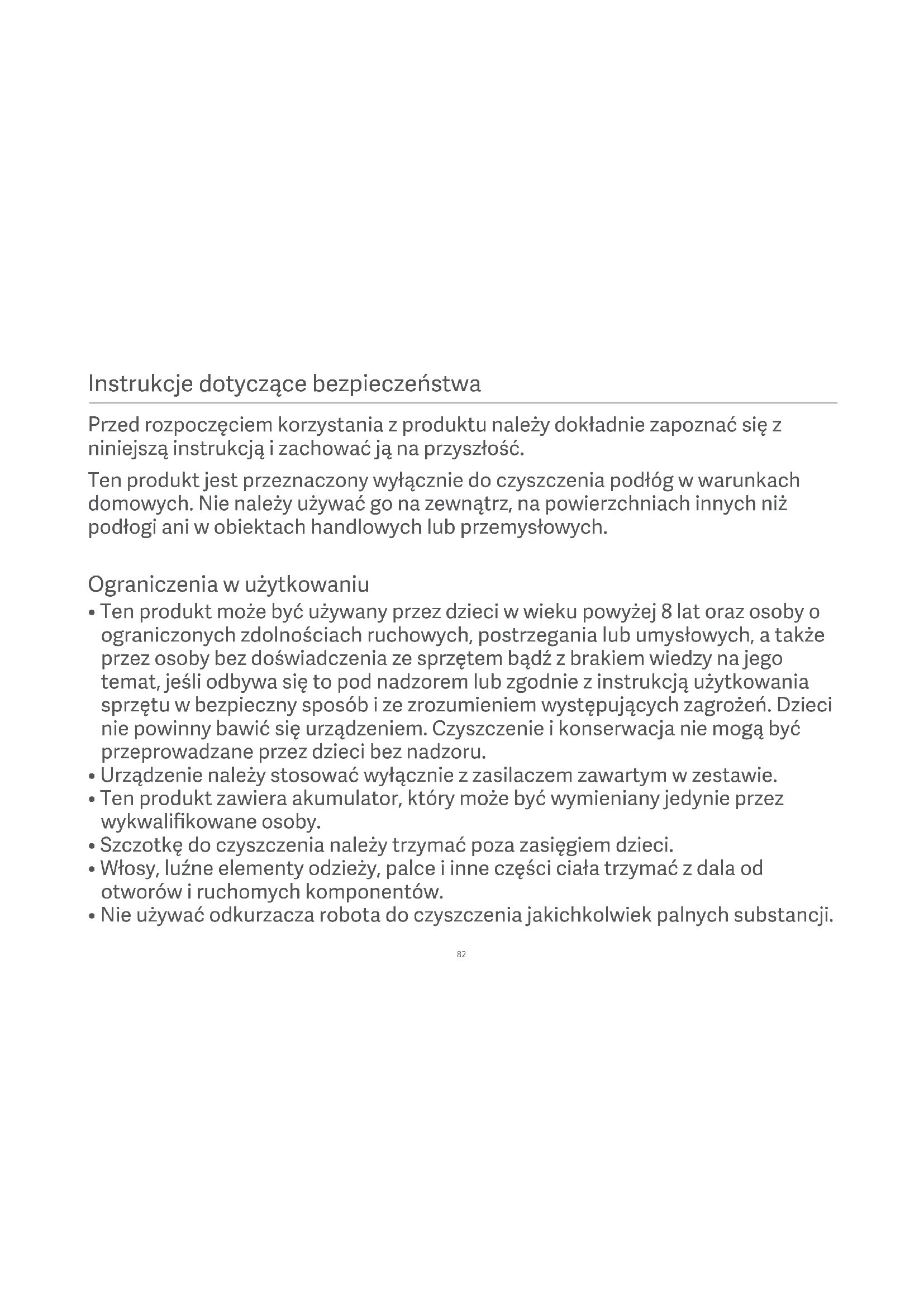 - Nie używać odkurzacza robota do czyszczenia jakichkolwiek palnych substancji. Przed rozpoczęciem korzystania z produktu należy dokładnie zapoznać się z niniejszą instrukcją i zachować ją na przyszłość. Ten produkt jest przeznaczony wyłącznie do czyszczenia podłóg w warunkach domowych. Nie należy używać go na zewnątrz, na powierzchniach innych niż podłogi ani w obiektach handlowych lub przemysłowych.83