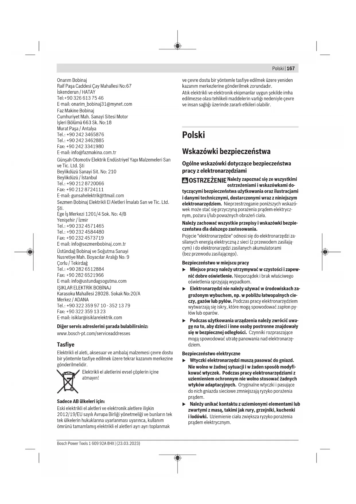 Karasoku Mahallesi 28028. Sokak No:20/A Merkez / ADANA Tel.: +903223599710 -3521379 Fax: +903223591323 E-mail: isiklar@isiklarelektrik.com Diğer servis adreslerini şurada bulabilirsiniz: www.bosch-pt.com/serviceaddresses Tasfiye Elektrikli el aleti, aksesuar ve ambalaj malzemesi çevre dostu bir yöntemle tasfiye edilmek üzere tekrar kazanım merkezine gönderilmelidir. Elektrikli el aletlerini evsel çöplerin içine atmayın! Sadece AB ülkeleri için: Eski elektrikli el aletleri ve elektronik aletlere ilişkin 2012/19/EU sayılı Avrupa Birliği yönetmeliği ve bunların tek tek ülkelerin hukuklarına uyarlanması uyarınca, kullanım ömrünü tamamlamış elektrikli el aletleri ayrı ayrı toplanmak ve çevre dostu bir yöntemle tasfiye edilmek üzere yeniden kazanım merkezlerine gönderilmek zorundadır. Atık elektrikli ve elektronik ekipmanlar uygun şekilde imha edilmezse olası tehlikeli maddelerin varlığı nedeniyle çevre ve insan sağlığı üzerinde zararlı etkileri olabilir. Polski Wskazówki bezpieczeństwa Ogólne wskazówki dotyczące bezpieczeństwa pracy z elektronarzędziami OSTRZEŻENIE Należy zapoznać się ze wszystkimi ostrzeżeniami i wskazówkami do- tyczącymi bezpieczeństwa użytkowania oraz ilustracjami i danymi technicznymi, dostarczonymi wraz z niniejszym elektronarzędziem. Nieprzestrzeganie poniższych wskazó- wek może stać się przyczyną porażenia prądem elektrycz- nym, pożaru i/lub poważnych obrażeń ciała. Należy zachować wszystkie przepisy i wskazówki bezpie- czeństwa dla dalszego zastosowania. Pojęcie "elektronarzędzie" odnosi się do elektronarzędzi za- silanych energią elektryczną z sieci (z przewodem zasilają- cym) i do elektronarzędzi zasilanych akumulatorami (bezprzewodu zasilającego). Bezpieczeństwo w miejscu pracy u Miejsce pracy należy utrzymywać w czystości i zapew- nić dobre oświetlenie. Nieporządek i brak właściwego oświetlenia sprzyjają wypadkom. u Elektronarzędzi nie należy używać w środowiskach za- grożonym wybuchem, np. w pobliżu łatwopalnych cie- czy, gazów lub pyłów. Podczas pracy elektronarzędziem wytwarzają się iskry, które mogą spowodować zapłon py- łów lub oparów. u Podczas użytkowania urządzenia należy zwrócić uwa- gę na to, aby dzieci i inne osoby postronne znajdowały się w bezpiecznej odległości. Czynniki rozpraszające mogą spowodować utratę panowania nad elektronarzę- dziem. Bezpieczeństwo elektryczne u Wtyczki elektronarzędzi muszą pasować do gniazd. Nie wolno w żadnej sytuacji i w żaden sposób modyfi- kować wtyczek. Podczas pracy elektronarzędziami z uziemieniem ochronnym nie wolno stosować żadnych wtyków adaptacyjnych. Oryginalne wtyczki i pasujące do nich gniazda sieciowe zmniejszają ryzyko porażenia prądem. u Należy unikać kontaktu z uziemionymi elementami lub zwartymi z masą, takimi jak rury, grzejniki, kuchenki ilodówki. Uziemienie ciała zwiększa ryzyko porażenia prądem elektrycznym. Bosch Power Tools 1 609 92A 8HX | (23.03.2023)168 | Polski u Elektronarzędzi nie wolno narażać na kontakt z desz- czem ani wilgocią. Przedostanie się wody do wnętrza obudowy zwiększa ryzyko porażenia prądem elektrycz- nym. u Nie używać przewodu zasilającego do innych celów. Nie wolno używać przewodu do przenoszenia ani prze- suwania elektronarzędzia; nie wolno też wyjmować wtyczki z gniazda, pociągając za przewód. Przewód należy chronić przed wysokimi temperaturami, należy go trzymać zdala od oleju, ostrych krawędzi i rucho- mych części urządzenia. Uszkodzone lub splątane prze- wody zwiększają ryzyko porażenia prądem elektrycznym. u Używając elektronarzędzia na świeżym powietrzu, na- leży upewnić się, że przedłużacz jest przeznaczony do pracy na zewnątrz. Użycie przedłużacza przeznaczone- go do pracy na zewnątrz zmniejsza ryzyko porażenia prą- dem elektrycznym. u Jeżeli nie ma innej możliwości, niż użycie elektrona- rzędzia w wilgotnym otoczeniu, należy podłączyć je do źródła zasilania wyposażonego w wyłącznik ochronny różnicowoprądowy. Zastosowanie wyłącznika ochron- nego różnicowoprądowego zmniejsza ryzyko porażenia prądem elektrycznym. Bezpieczeństwo osób u Podczas pracy z elektronarzędziem należy zachować czujność, każdą czynność wykonywać ostrożnie i z rozwagą. Nie przystępować do pracy elektronarzę- dziem w stanie zmęczenia lub będąc pod wpływem narkotyków, alkoholu lub leków. Chwila nieuwagi pod- czas pracy może grozić bardzo poważnymi obrażeniami ciała. u Stosować środki ochrony osobistej. Należy zawsze nosić okulary ochronne. Środki ochrony osobistej, np. maska przeciwpyłowa, antypoślizgowe obuwie, kask ochronny czy ochraniacze na uszy, w określonych warun- kach pracy obniżają ryzyko obrażeń ciała. u Należy unikać niezamierzonego uruchomienia narzę- dzia. Przed podłączeniem elektronarzędzia do źródła zasilania i/lub podłączeniem akumulatora, podniesie- niem albo transportem urządzenia, należy upewnić się, że włącznik elektronarzędzia znajduje się w pozy- cji wyłączonej. Przenoszenie elektronarzędzia z palcem opartym na włączniku/wyłączniku lub włożenie do gniaz- da sieciowego wtyczki włączonego narzędzia, może stać się przyczyną wypadków. u Przed włączeniem elektronarzędzia należy usunąć wszystkie narzędzia nastawcze i klucze maszynowe. Narzędzia lub klucze, pozostawione wruchomych czę- ściach urządzenia, mogą spowodować obrażenia ciała. u Należy unikać nienaturalnych pozycji przy pracy. Na- leży dbać o stabilną pozycję przy pracy i zachowanie równowagi. Dzięki temu można będzie łatwiej zapano- wać nad elektronarzędziem w nieprzewidzianych sytu- acjach. u Należy nosić odpowiednią odzież. Nie należy nosić luźnej odzieży ani biżuterii. Włosy i odzież należy trzy- mać z dala od ruchomych części. Luźna odzież, biżuteria lub długie