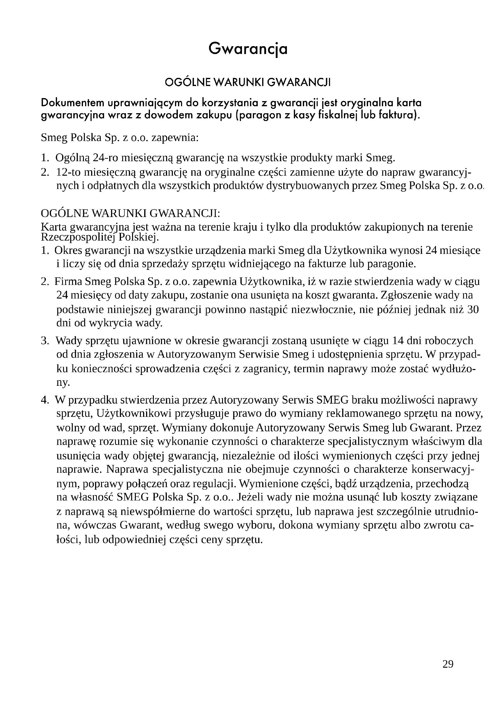 Dokumentem uprawniającym do korzystania z gwarancji jest oryginalna karta gwarancyjna wraz z dowodem zakupu (paragon z kasy fiskalnej lub faktura). Smeg Polska Sp. z o.o. zapewnia: