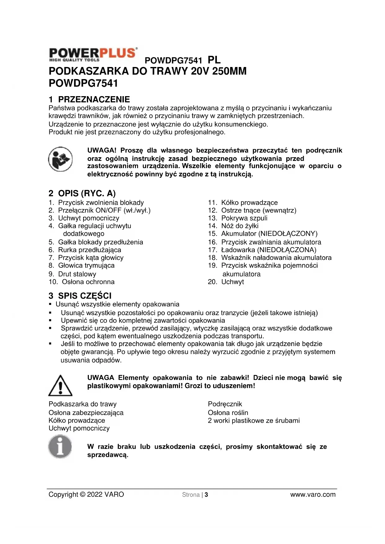- Jeśli to możliwe to przechować elementy opakowania tak długo jak urządzenie będzie objęte gwarancją. Po upływie tego okresu należy wyrzucić zgodnie z przyjętym systemem usuwania odpadów. UWAGA Elementy opakowania to nie zabawki! Dzieci nie mogą bawić się plastikowymi opakowaniami! Grozi to uduszeniem! Podkaszarka do trawy Osłona zabezpieczająca Kółko prowadzące Uchwyt pomocniczy Podręcznik Osłona roślin 2 worki plastikowe ze śrubami W razie braku lub uszkodzenia części, prosimy skontaktować się ze sprzedawcą.POWDPG7541 PL Copyright © 2022 VARO Strona | 4 www.varo.com 4 OZNACZENIA W niniejszej instrukcji i/lub na urządzeniu użyto następujących symboli: