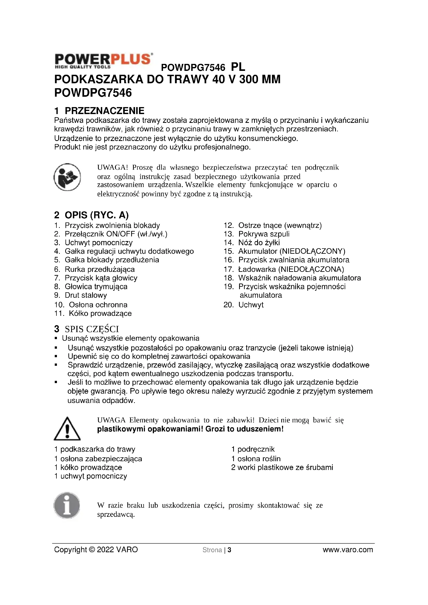 - Jeśli to możliwe to przechować elementy opakowania tak długo jak urządzenie będzie objęte gwarancją. Po upływie tego okresu należy wyrzucić zgodnie z przyjętym systemem usuwania odpadów. UWAGA Elementy opakowania to nie zabawki! Dzieci nie mogą bawić się plastikowymi opakowaniami! Grozi to uduszeniem! 1 podkaszarka do trawy 1 osłona zabezpieczająca 1 kółko prowadzące 1 uchwyt pomocniczy 1 podręcznik 1 osłona roślin 2 worki plastikowe ze śrubami W razie braku lub uszkodzenia części, prosimy skontaktować się ze sprzedawcą.POWDPG7546 PL Copyright © 2022 VARO Strona | 4 www.varo.com 4 OZNACZENIA W niniejszej instrukcji i/lub na urządzeniu użyto następujących symboli: