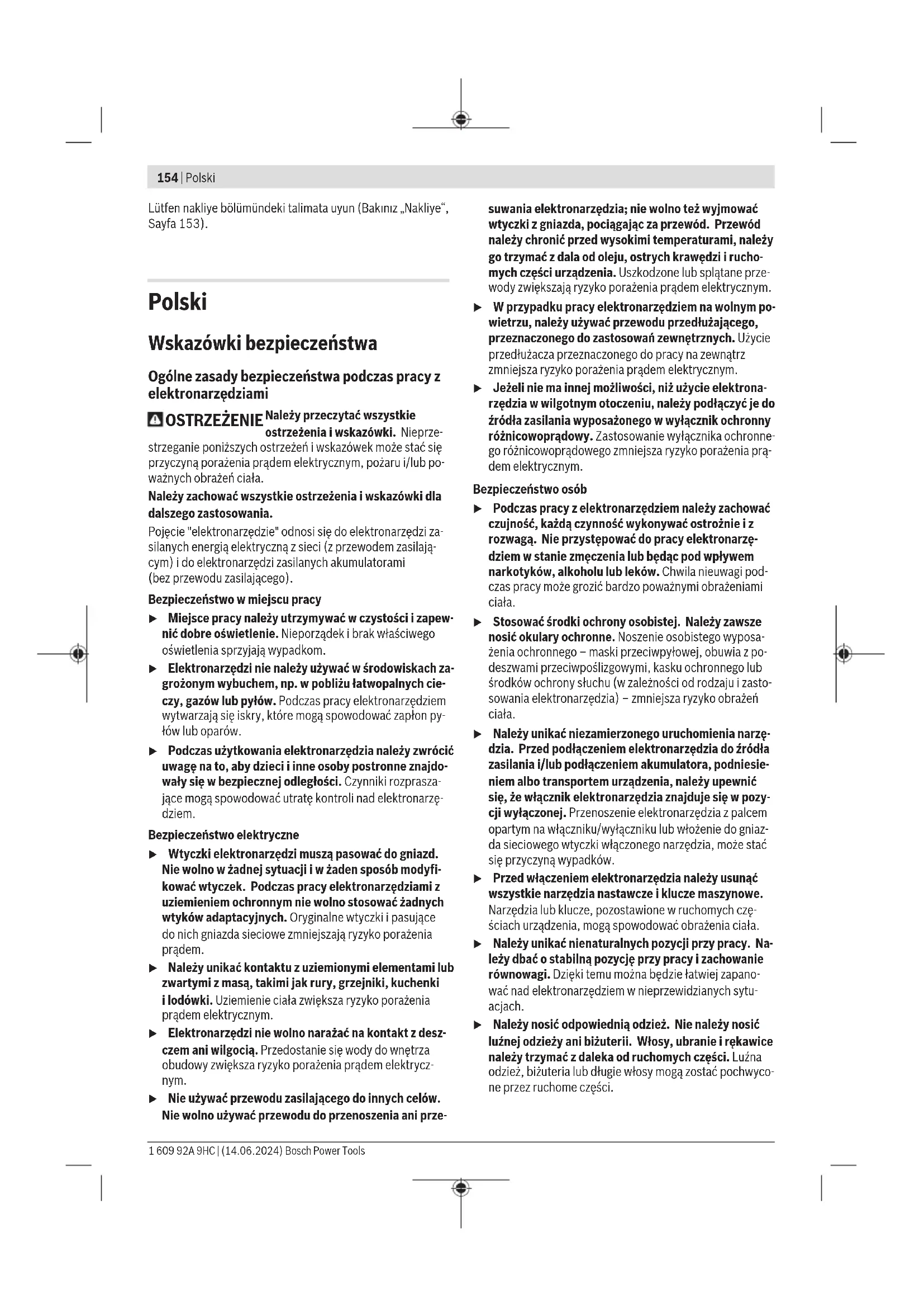 Karasoku Mahallesi 28028. Sokak No:20/A Merkez / ADANA Tel.: +903223599710 -3521379 Fax: +903223591323 E-mail: isiklar@isiklarelektrik.com Diğer servis adreslerini şurada bulabilirsiniz: www.bosch-pt.com/serviceaddresses Nakliye Önerilen Lityum İyon aküler tehlikeli madde taşıma yönetmeliği hükümlerine tabidir. Aküler kullanıcı tarafından başka bir hükme tabi olmaksızın kara yollarında taşınabilir. Üçüncü kişiler eliyle yollanma durumunda (örneğin hava yolu ile veya nakliye şirketleri ile) paketleme ve etiketlemeye ilişkin özel hükümlere uyulmalıdır. Gönderi paketlenirken bir tehlikeli madde uzmanından yardım alınmalıdır. Aküleri sadece ve ancak gövdelerinde hasar yoksa gönderin. Açık kontakları kapatın ve aküyü ambalaj içinde hareket etmeyecek biçimde paketleyin. Lütfen olası ek ulusal yönetmelik hükümlerine de uyun. Tasfiye Elektrikli el aletleri, aküler, aksesuar ve ambalaj malzemesi çevre dostu tasfiye amacıyla bir geri dönüşüm merkezine yollanmalıdır. Elektrikli el aletlerini ve aküleri/bataryaları evsel çöplerin içine atmayın! Sadece AB ülkeleri için: Artık kullanılmayan ve arızalı elektrikli el aletleri veya kullanılmış aküler/piller ayrı olarak imha edilmelidir. Belirtilen toplama sistemlerini kullanın. Atık elektrikli ve elektronik ekipmanlar uygun şekilde imha edilmezse olası tehlikeli maddelerin varlığı nedeniyle çevre ve insan sağlığı üzerinde zararlı etkileri olabilir. Aküler/bataryalar: Lityum iyon: Bosch Power Tools 1 609 92A 9HC | (14.06.2024)154 | Polski Lütfen nakliye bölümündeki talimata uyun (Bakınız „Nakliye“, Sayfa153). Polski Wskazówki bezpieczeństwa Ogólne zasady bezpieczeństwa podczas pracy z elektronarzędziami OSTRZEŻENIE Należy przeczytać wszystkie ostrzeżenia i wskazówki. Nieprze- strzeganie poniższych ostrzeżeń i wskazówek może stać się przyczyną porażenia prądem elektrycznym, pożaru i/lub po- ważnych obrażeń ciała. Należy zachować wszystkie ostrzeżenia i wskazówki dla dalszego zastosowania. Pojęcie "elektronarzędzie" odnosi się do elektronarzędzi za- silanych energią elektryczną z sieci (z przewodem zasilają- cym) i do elektronarzędzi zasilanych akumulatorami (bezprzewodu zasilającego). Bezpieczeństwo w miejscu pracy u Miejsce pracy należy utrzymywać w czystości i zapew- nić dobre oświetlenie. Nieporządek i brak właściwego oświetlenia sprzyjają wypadkom. u Elektronarzędzi nie należy używać w środowiskach za- grożonym wybuchem, np. w pobliżu łatwopalnych cie- czy, gazów lub pyłów. Podczas pracy elektronarzędziem wytwarzają się iskry, które mogą spowodować zapłon py- łów lub oparów. u Podczas użytkowania elektronarzędzia należy zwrócić uwagę na to, aby dzieci i inne osoby postronne znajdo- wały się w bezpiecznej odległości. Czynniki rozprasza- jące mogą spowodować utratę kontroli nad elektronarzę- dziem. Bezpieczeństwo elektryczne u Wtyczki elektronarzędzi muszą pasować do gniazd. Nie wolno w żadnej sytuacji i w żaden sposób modyfi- kować wtyczek. Podczas pracy elektronarzędziami z uziemieniem ochronnym nie wolno stosować żadnych wtyków adaptacyjnych. Oryginalne wtyczki i pasujące do nich gniazda sieciowe zmniejszają ryzyko porażenia prądem. u Należy unikać kontaktu z uziemionymi elementami lub zwartymi z masą, takimi jak rury, grzejniki, kuchenki ilodówki. Uziemienie ciała zwiększa ryzyko porażenia prądem elektrycznym. u Elektronarzędzi nie wolno narażać na kontakt z desz- czem ani wilgocią. Przedostanie się wody do wnętrza obudowy zwiększa ryzyko porażenia prądem elektrycz- nym. u Nie używać przewodu zasilającego do innych celów. Nie wolno używać przewodu do przenoszenia ani prze- suwania elektronarzędzia; nie wolno też wyjmować wtyczki z gniazda, pociągając za przewód. Przewód należy chronić przed wysokimi temperaturami, należy go trzymać zdala od oleju, ostrych krawędzi i rucho- mych części urządzenia. Uszkodzone lub splątane prze- wody zwiększają ryzyko porażenia prądem elektrycznym. u W przypadku pracy elektronarzędziem na wolnym po- wietrzu, należy używać przewodu przedłużającego, przeznaczonego do zastosowań zewnętrznych. Użycie przedłużacza przeznaczonego do pracy na zewnątrz zmniejsza ryzyko porażenia prądem elektrycznym. u Jeżeli nie ma innej możliwości, niż użycie elektrona- rzędzia w wilgotnym otoczeniu, należy podłączyć je do źródła zasilania wyposażonego w wyłącznik ochronny różnicowoprądowy. Zastosowanie wyłącznika ochronne- go różnicowoprądowego zmniejsza ryzyko porażenia prą- dem elektrycznym. Bezpieczeństwo osób u Podczas pracy z elektronarzędziem należy zachować czujność, każdą czynność wykonywać ostrożnie i z rozwagą. Nie przystępować do pracy elektronarzę- dziem w stanie zmęczenia lub będąc pod wpływem narkotyków, alkoholu lub leków. Chwila nieuwagi pod- czas pracy może grozić bardzo poważnymi obrażeniami ciała. u Stosować środki ochrony osobistej. Należy zawsze nosić okulary ochronne. Noszenie osobistego wyposa- żenia ochronnego – maski przeciwpyłowej, obuwia zpo- deszwami przeciwpoślizgowymi, kasku ochronnego lub środków ochrony słuchu (w zależności od rodzaju i zasto- sowania elektronarzędzia) – zmniejsza ryzyko obrażeń ciała. u Należy unikać niezamierzonego uruchomienia narzę- dzia. Przed podłączeniem elektronarzędzia do źródła zasilania i/lub podłączeniem akumulatora, podniesie- niem albo transportem urządzenia, należy upewnić się, że włącznik elektronarzędzia znajduje się w pozy- cji wyłączonej. Przenoszenie elektronarzędzia z palcem opartym na włączniku/wyłączniku lub włożenie do gniaz- da sieciowego wtyczki włączonego narzędzia, może stać się przyczyną wypadków. u Przed włączeniem elektronarzędzia należy usunąć wszystkie narzędzia nastawcze i klucze ma