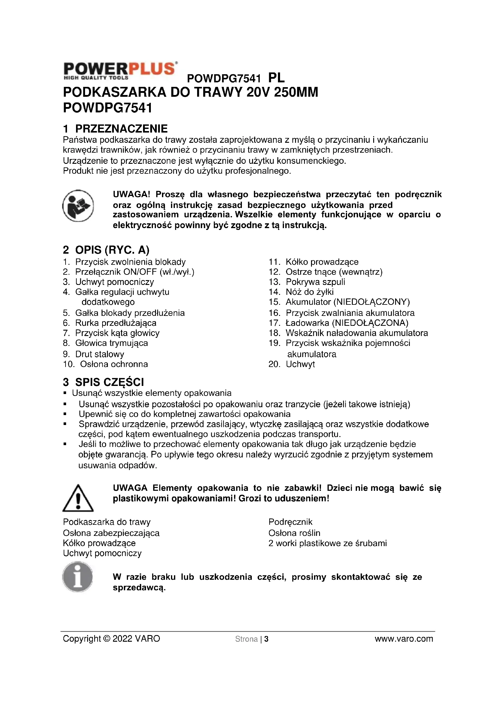 - Po ponownym uruchomieniu urządzenia żyłka zostanie automatycznie docięta do właściwej długości. PRZESTROGA! W żadnym przypadku nie nawijać dodatkowej żyłki na pustą szpulę. Zamiast tego wymienić szpulę na nową, taką samą jak oryginalna. Użycie żyłki o innych parametrach niż żyłka oryginalna może spowodować trwałe uszkodzenie podkaszarki do trawy, a także unieważnienie gwarancji.POWDPG7541 PL Copyright © 2022 VARO Strona | 11 www.varo.com