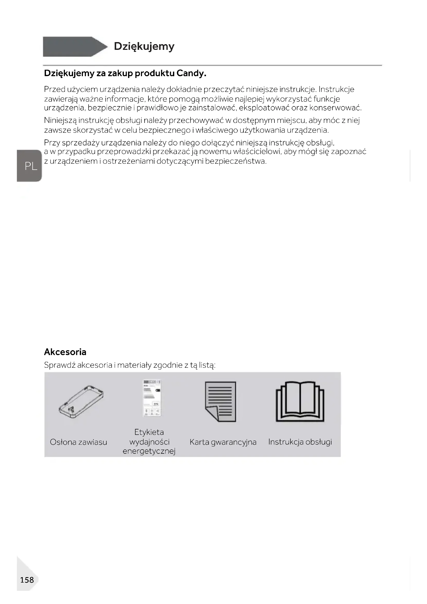 Dziękujemy za zakup produktu Candy. Przed użyciem urządzenia należy dokładnie przeczytać niniejsze instrukcje. Instrukcje zawierają ważne informacje, które pomogą możliwie najlepiej wykorzystać funkcje urządzenia, bezpiecznie i prawidłowo je zainstalować, eksploatować oraz konserwować. Niniejszą instrukcję obsługi należy przechowywać w dostępnym miejscu, aby móc z niej zawsze skorzystać w celu bezpiecznego i właściwego użytkowania urządzenia. Przy sprzedaży urządzenia należy do niego dołączyć niniejszą instrukcję obsługi, a w przypadku przeprowadzki przekazać ją nowemu właścicielowi, aby mógł się zapoznać z urządzeniem i ostrzeżeniami dotyczącymi bezpieczeństwa. Akcesoria Sprawdź akcesoria i materiały zgodnie z tą listą: