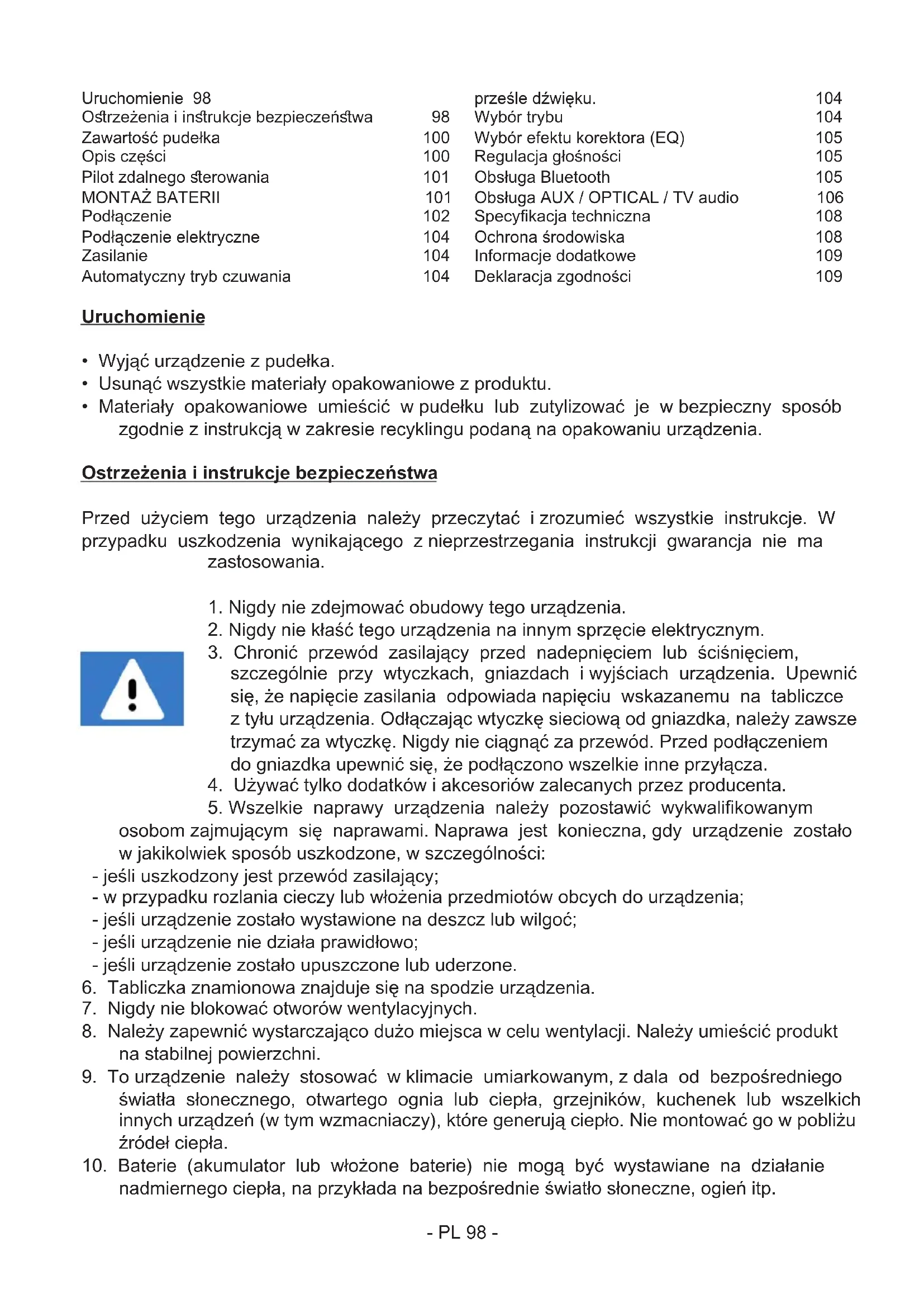 nadmiernego ciepła, na przykłada na bezpośrednie światło słoneczne, ogień itp. Uruchomienie 98 Orzeżenia i inrukcje bezpieczeńwa 98 Zawartość pudełka 100 Opis części 100 Pilot zdalnego erowania 101 MONTAŻ BATERII 101 Podłączenie 102 Podłączenie elektryczne 104 Zasilanie 104 Automatyczny tryb czuwania 104 prześle dźwięku. 104 Wybór trybu 104 Wybór efektu korektora (EQ) 105 Regulacja głośności 105 Obsługa Bluetooth 105 Obsługa AUX / OPTICAL / TV audio 106 Specykacja techniczna 108 Ochrona środowiska 108 Informacje dodatkowe 109 Deklaracja zgodności 109- PL 99 -