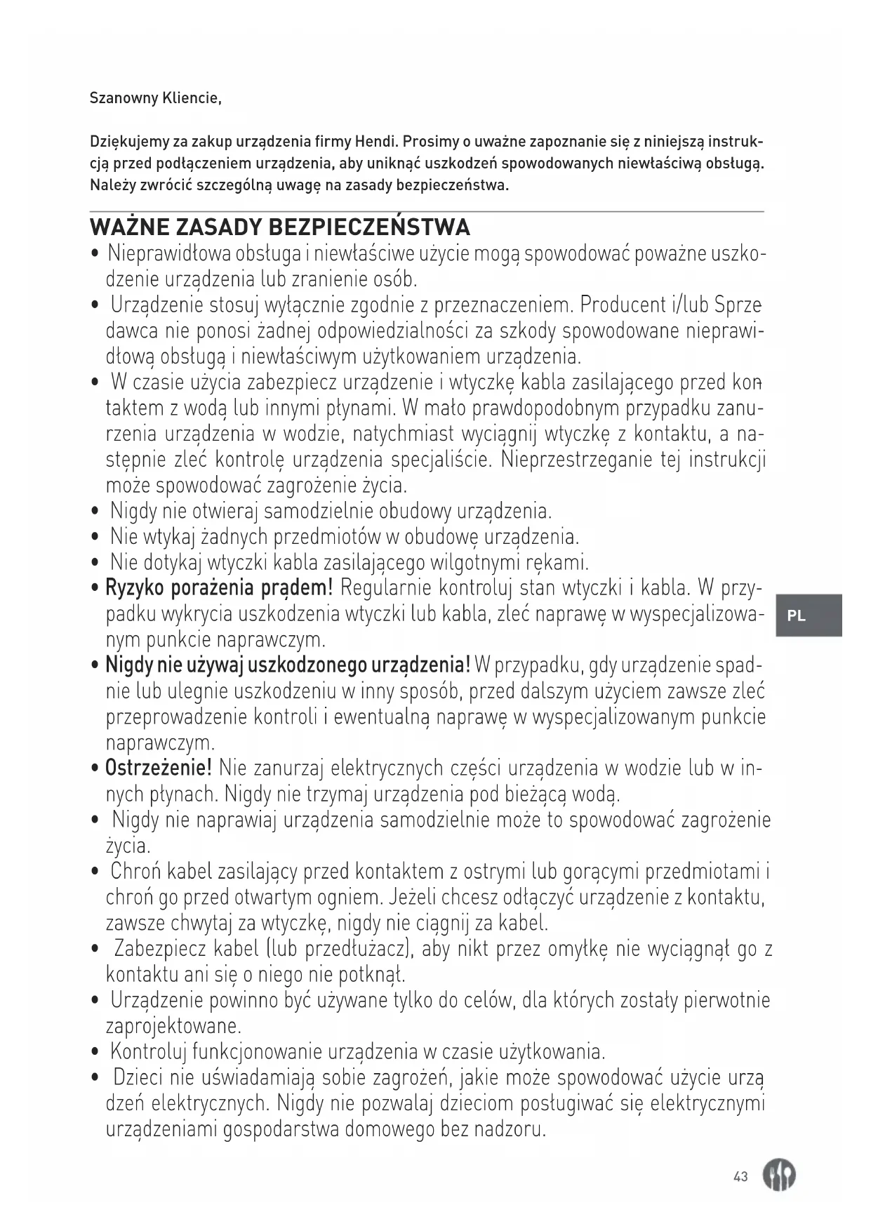 Szanowny Kliencie, Dziękujemy za zakup urządzenia firmy Hendi. Prosimy o uważne zapoznanie się z niniejszą instruk- cją przed podłączeniem urządzenia, aby uniknąć uszkodzeń spowodowanych niewłaściwą obsługą. Należy zwrócić szczególną uwagę na zasady bezpieczeństwa.