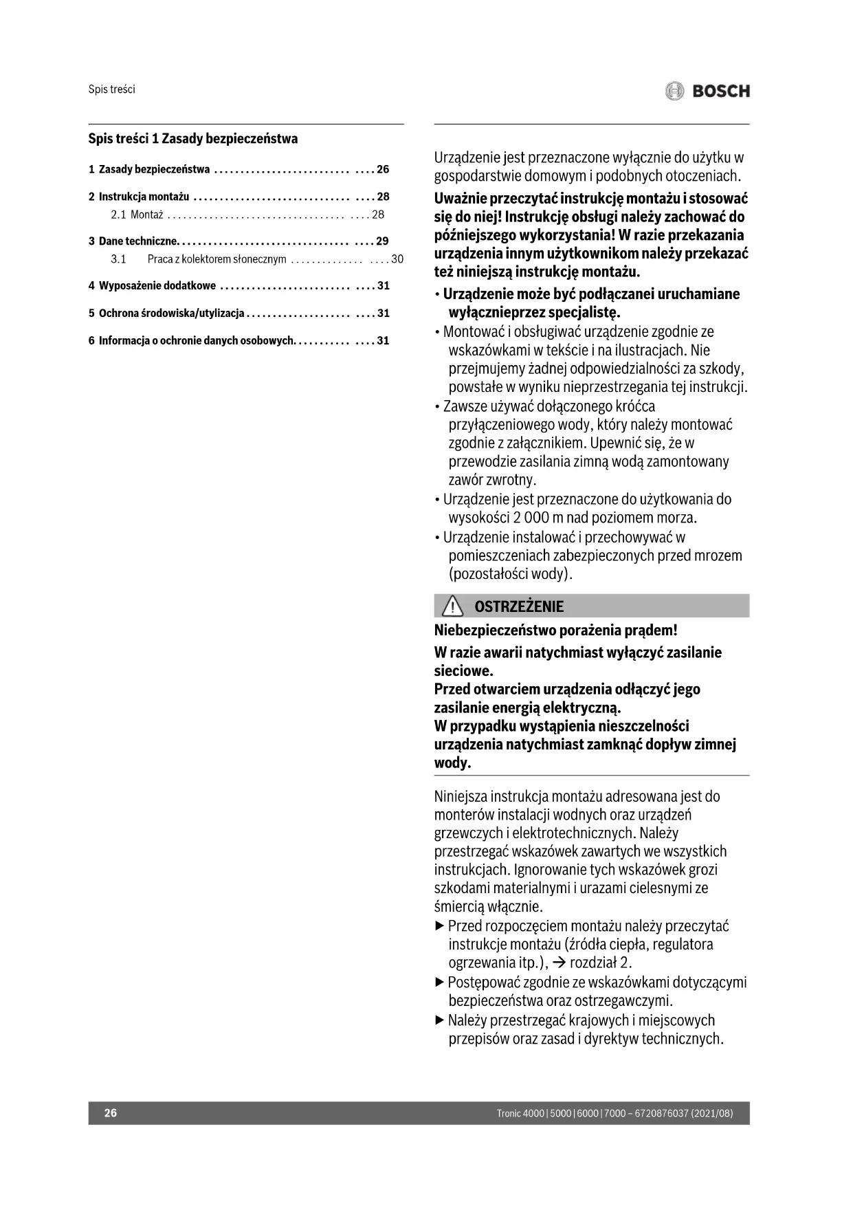 - Urządzenie instalować i przechowywać w pomieszczeniach zabezpieczonych przed mrozem (pozostałości wody). OSTRZEŻENIE Niebezpieczeństwo porażenia prądem! W razie awarii natychmiast wyłączyć zasilanie sieciowe. Przed otwarciem urządzenia odłączyć jego zasilanie energią elektryczną. W przypadku wystąpienia nieszczelności urządzenia natychmiast zamknąć dopływ zimnej wody. Niniejsza instrukcja montażu adresowana jest do monterów instalacji wodnych oraz urządzeń grzewczych i elektrotechnicznych. Należy przestrzegać wskazówek zawartych we wszystkich instrukcjach. Ignorowanie tych wskazówek grozi szkodami materialnymi i urazami cielesnymi ze śmiercią włącznie. ▶ Przed rozpoczęciem montażu należy przeczytać instrukcje montażu (źródła ciepła, regulatora ogrzewania itp.), rozdział 2. ▶ Postępować zgodnie ze wskazówkami dotyczącymi bezpieczeństwa oraz ostrzegawczymi. ▶ Należy przestrzegać krajowych i miejscowych przepisów oraz zasad i dyrektyw technicznych. 1 Zasady bezpieczeństwa . . . . . . . . . . . . . . . . . . . . . . . . . . . . . . 26 2 Instrukcja montażu . . . . . . . . . . . . . . . . . . . . . . . . . . . . . . . . . . 28