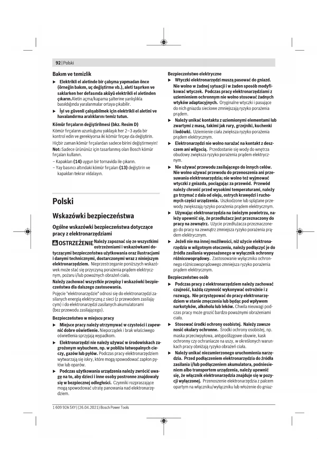 Karasoku Mahallesi 28028. Sokak No:20/A Merkez / ADANA Tel.: +903223599710 -3521379 Fax: +903223591323 E-mail: isiklar@isiklarelektrik.com Diğer servis adreslerini şurada bulabilirsiniz: www.bosch-pt.com/serviceaddresses Nakliye Alet içindeki lityum iyon (Li-Ionen) aküler tehlikeli madde taşıma yönetmeliği hükümlerine tabidir. Aküler başka bir yükümlülük olmaksızın kullanıcı tarafından caddeler üzerinde taşınabilir. Üçüncü kişiler eliyle yollanma durumunda (örneğin hava yolu ile veya nakliye şirketleri ile) paketleme ve etiketlemeye ilişkin özel hükümlere uyulmalıdır. Gönderi paketlenirken bir tehlikeli madde uzmanından yardım alınmalıdır. Aküleri sadece ve ancak gövdelerinde hasar yoksa gönderin. Açık kontakları kapatın ve aküyü ambalaj içinde hareket etmeyecek biçimde paketleyin. Lütfen olası ek ulusal yönetmelik hükümlerine de uyun. Tasfiye Elektrikli el aletleri, aküler, aksesuar ve ambalaj malzemesi çevre dostu tasfiye amacıyla bir geri dönüşüm merkezine yollanmalıdır. Elektrikli el aletlerini ve aküleri/bataryaları evsel çöplerin içine atmayın! Sadece AB ülkeleri için: 2012/19/EU yönetmeliği uyarınca kullanım ömrünü tamamlamış elektrikli el aletleri ve 2006/66/EC yönetmeliği uyarınca arızalı veya kullanım ömrünü tamamlamış aküler/ bataryalar ayrı ayrı toplanmak ve çevre dostu tasfiye için bir geri dönüşüm merkezine yollanmak zorundadır. Aküler/bataryalar: Lityum iyon: Lütfen nakliye bölümündeki talimata uyun (Bakınız „Nakliye“, Sayfa91). Bosch Power Tools 1 609 92A 5XY | (26.04.2021)92 | Polski Bakım ve temizlik u Elektrikli el aletinde bir çalışma yapmadan önce (örneğin bakım, uç değiştirme vb.), aleti taşırken ve saklarken her defasında aküyü elektrikli el aletinden çıkarın.Aletin açma/kapama şalterine yanlışlıkla basıldığında yaralanmalar ortaya çıkabilir. u İyi ve güvenli çalışabilmek için elektrikli el aletini ve havalandırma aralıklarını temiz tutun. Kömür fırçaların değiştirilmesi (bkz.ResimD) Kömür fırçaların uzunluğunu yaklaşık her 2–3 ayda bir kontrol edin ve gerekiyorsa iki kömür fırçayı da değiştirin. Hiçbir zaman kömür fırçalardan sadece birini değiştirmeyin! Not: Sadece ürününüz için tasarlanmış olan Bosch kömür fırçaları kullanın. – Kapakları (14) uygun bir tornavida ile çıkarın. – Yay basıncı altındaki kömür fırçaları (13) değiştirin ve kapakları tekrar vidalayın. Polski Wskazówki bezpieczeństwa Ogólne wskazówki bezpieczeństwa dotyczące pracy z elektronarzędziami OSTRZEŻENIE Należy zapoznać się ze wszystkimi ostrzeżeniami i wskazówkami do- tyczącymi bezpieczeństwa użytkowania oraz ilustracjami i danymi technicznymi, dostarczonymi wraz z niniejszym elektronarzędziem. Nieprzestrzeganie poniższych wskazó- wek może stać się przyczyną porażenia prądem elektrycz- nym, pożaru i/lub poważnych obrażeń ciała. Należy zachować wszystkie przepisy i wskazówki bezpie- czeństwa dla dalszego zastosowania. Pojęcie "elektronarzędzie" odnosi się do elektronarzędzi za- silanych energią elektryczną z sieci (z przewodem zasilają- cym) i do elektronarzędzi zasilanych akumulatorami (bezprzewodu zasilającego). Bezpieczeństwo w miejscu pracy u Miejsce pracy należy utrzymywać w czystości i zapew- nić dobre oświetlenie. Nieporządek i brak właściwego oświetlenia sprzyjają wypadkom. u Elektronarzędzi nie należy używać w środowiskach za- grożonym wybuchem, np. w pobliżu łatwopalnych cie- czy, gazów lub pyłów. Podczas pracy elektronarzędziem wytwarzają się iskry, które mogą spowodować zapłon py- łów lub oparów. u Podczas użytkowania urządzenia należy zwrócić uwa- gę na to, aby dzieci i inne osoby postronne znajdowały się w bezpiecznej odległości. Czynniki rozpraszające mogą spowodować utratę panowania nad elektronarzę- dziem. Bezpieczeństwo elektryczne u Wtyczki elektronarzędzi muszą pasować do gniazd. Nie wolno w żadnej sytuacji i w żaden sposób modyfi- kować wtyczek. Podczas pracy elektronarzędziami z uziemieniem ochronnym nie wolno stosować żadnych wtyków adaptacyjnych. Oryginalne wtyczki i pasujące do nich gniazda sieciowe zmniejszają ryzyko porażenia prądem. u Należy unikać kontaktu z uziemionymi elementami lub zwartymi z masą, takimi jak rury, grzejniki, kuchenki ilodówki. Uziemienie ciała zwiększa ryzyko porażenia prądem elektrycznym. u Elektronarzędzi nie wolno narażać na kontakt z desz- czem ani wilgocią. Przedostanie się wody do wnętrza obudowy zwiększa ryzyko porażenia prądem elektrycz- nym. u Nie używać przewodu zasilającego do innych celów. Nie wolno używać przewodu do przenoszenia ani prze- suwania elektronarzędzia; nie wolno też wyjmować wtyczki z gniazda, pociągając za przewód. Przewód należy chronić przed wysokimi temperaturami, należy go trzymać zdala od oleju, ostrych krawędzi i rucho- mych części urządzenia. Uszkodzone lub splątane prze- wody zwiększają ryzyko porażenia prądem elektrycznym. u Używając elektronarzędzia na świeżym powietrzu, na- leży upewnić się, że przedłużacz jest przeznaczony do pracy na zewnątrz. Użycie przedłużacza przeznaczone- go do pracy na zewnątrz zmniejsza ryzyko porażenia prą- dem elektrycznym. u Jeżeli nie ma innej możliwości, niż użycie elektrona- rzędzia w wilgotnym otoczeniu, należy podłączyć je do źródła zasilania wyposażonego w wyłącznik ochronny różnicowoprądowy. Zastosowanie wyłącznika ochron- nego różnicowoprądowego zmniejsza ryzyko porażenia prądem elektrycznym. Bezpieczeństwo osób u Podczas pracy z elektronarzędziem należy zachować czujność, każdą czynność wykonywać ostrożnie i z rozwagą. Nie przystępować do pracy elektronarzę- dziem w stanie zmęczenia lub będąc pod wpływem narkotyków, alkoholu lub leków. Chwila