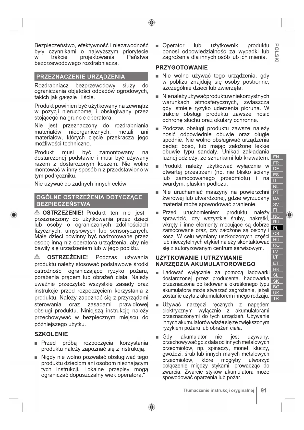 BEZPRZEWODOWEGO ■ Konfigurując produkt przed rozpoczęciem pracy należy upewnić się, że jest on zabezpieczony przed przewróceniem się. Jeśli produkt zostanie wyłączony zbyt szybko, pozostałe kawałki materiału mogą zatkać zespół ostrza i zatrzymać silnik po ponownym włączeniu produktu. ■ Przed uruchomieniem produktu należy zajrzeć do kosza załadowczego, aby upewnić się, że jest pusty. ■ Trzymać twarz i całe ciało z dala od otworu załadunkowego. ■ Nie zbliżać rąk, stóp ani żadnej innej części ciała ani odzieży do komory załadunkowej, zsuwni ani żadnej ruchomej części. ■ Zawsze zwracać uwagę na zachowanie bezpiecznej odległości stóp od urządzenia. Należy cały czas pewnie opierać stopy i utrzymywać równowagę. Nie sięgać zbyt daleko. Podczas wprowadzania materiału do produktu nigdy nie stawać na poziomie wyższym niż podstawa produktu. Podczas pracy należy chodzić, nie wolno biegać. ■ Podczas pracy z produktem należy zawsze trzymać się z dala od strefy wyładowczej. ■ Podczas wprowadzania materiału do produktu należy zachować szczególną ostrożność, pilnując, aby nie znalazły się w nim kawałki metalu, kamienie, butelki, puszki lub inne niepożądane przedmioty. ■ Jeśli mechanizm tnący uderzy w jakiekolwiek ciała obce lub jeśli zacznie wydawać nietypowe odgłosy bądź wibrować, należy wyłączyć produkt i odczekać, aż ostrza się całkowicie zatrzymają. Wyjąć akumulator. Wykonać następujące czynności: ● Starannie sprawdzić produkt pod kątem ewentualnych uszkodzeń. ● Sprawdzić i dokręcić wszelkie luźne części produktu. ● wymienić lub naprawić wszystkie uszkodzone elementy ■ Nie należy dopuścić do gromadzenia się materiału w wyrzutniku, ponieważ może to uniemożliwiać prawidłowe odprowadzanie materiału i może doprowadzić do odskoku materiału przez otwór podający. ■ Jeśli w produkcie wystąpi zator, należy go wyłączyć i całkowicie zatrzymać noże tnące. Przed przystąpieniem do oczyszczenia z pozostałości należy wymontować akumulator. ■ Nigdy nie wolno używać produktu, jeśli osłony, pokrywy, kosz lub inne elementy zabezpieczające są uszkodzone, nie znajdują się na swoim miejscu lub nie są w dobrym stanie. ■ Nie należy przenosić lub transportować pracującego produktu. ■ Wyłączyć zasilanie i wymontować akumulator. Upewnić się, że wszystkie elementy ruchome zostały całkowicie zatrzymane: ● przed pozostawieniem produktu bez nadzoru ● przed usunięciem zatoru ● przed sprawdzeniem, czyszczeniem i użytkowaniem produktu, ■ Nie przechylać pracującego produktu.