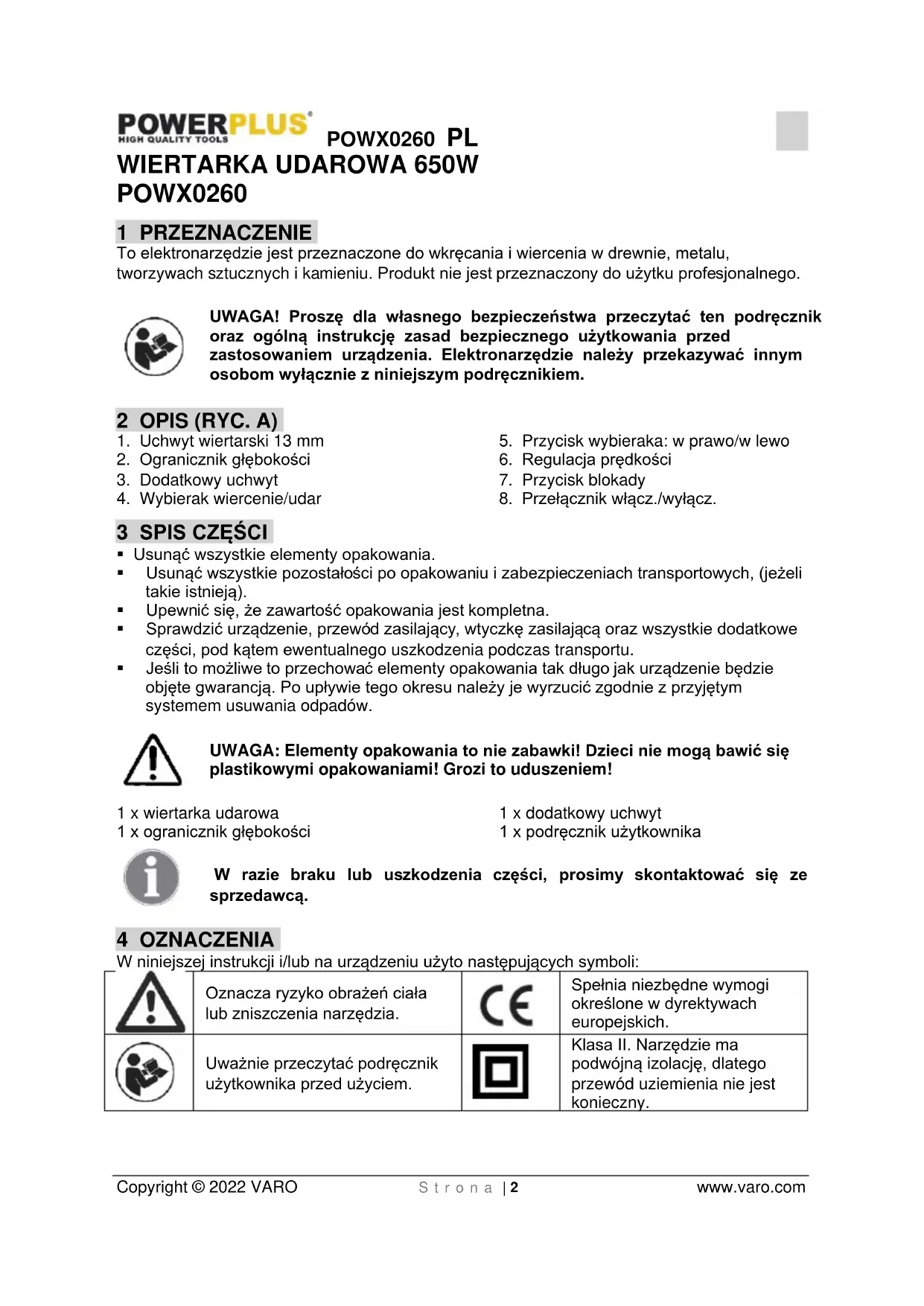 Klasa II. Narzędzie ma podwójną izolację, dlatego przewód uziemienia nie jest konieczny.POWX0260 PL Copyright © 2022 VARO S t r o n a | 3 www.varo.com
