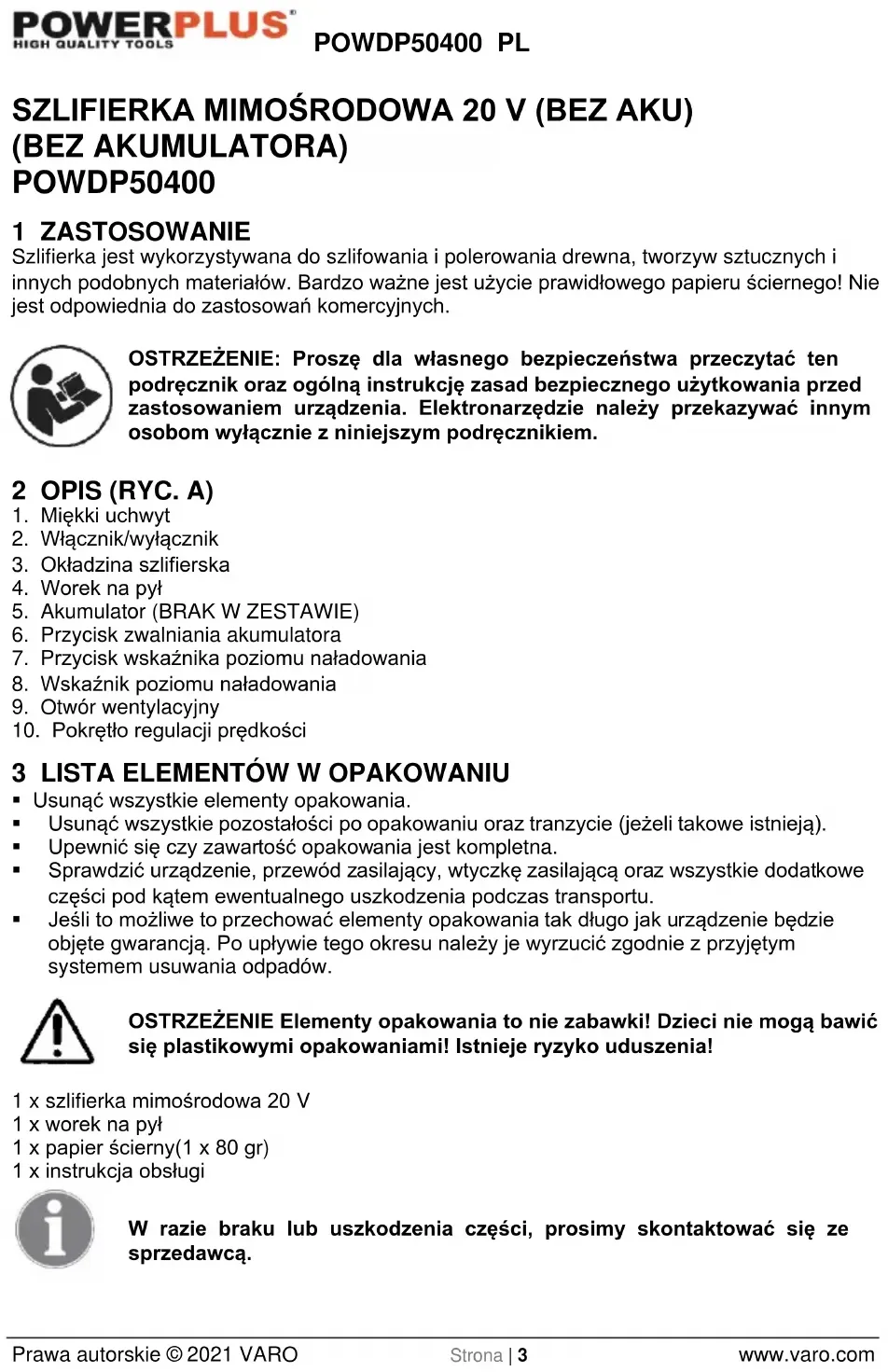 Prawa autorskie © 2021 VARO Strona | 3 www.varo.com SZLIFIERKA MIMOŚRODOWA 20 V (BEZ AKU) (BEZ AKUMULATORA) POWDP50400 1 ZASTOSOWANIE Szlifierka jest wykorzystywana do szlifowania i polerowania drewna, tworzyw sztucznych i innych podobnych materiałów. Bardzo ważne jest użycie prawidłowego papieru ściernego! Nie jest odpowiednia do zastosowań komercyjnych. OSTRZEŻENIE: Proszę dla własnego bezpieczeństwa przeczytać ten podręcznik oraz ogólną instrukcję zasad bezpiecznego użytkowania przed zastosowaniem urządzenia. Elektronarzędzie należy przekazywać innym osobom wyłącznie z niniejszym podręcznikiem. 2 OPIS (RYC. A)