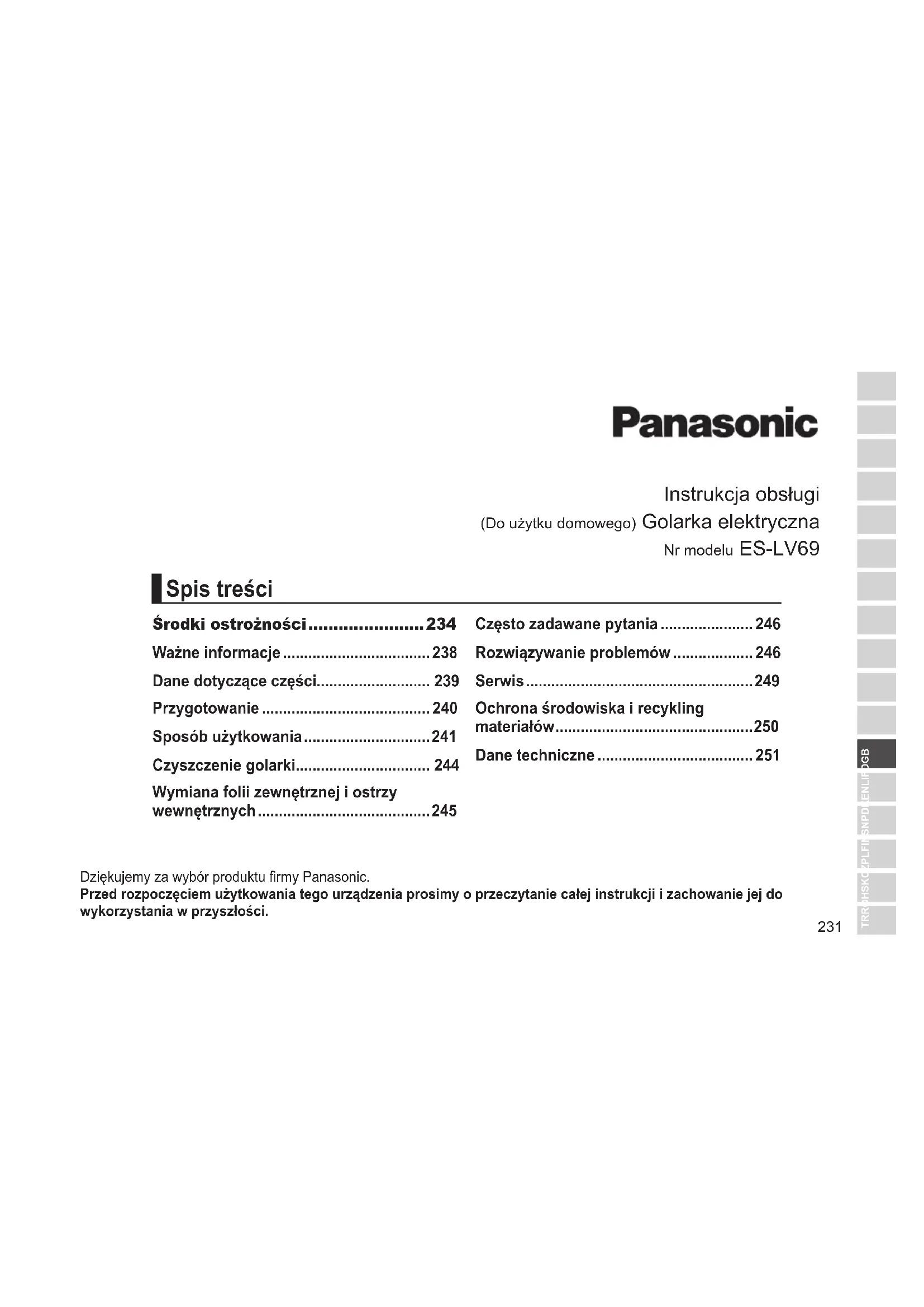 Tekniset tiedot Virtalähde Katso verkkolaitteen arvokilvestä. (automaattinen jännitteenvalinta) Moottorin jännite 3,6 V Latausaika Noin 1 tunti Ilmassa kantautuva melu parranajo: 62 (dB (A) re 1 pW) trimmerin käyttö: 62 (dB (A) re 1 pW) Tämä tuote on tarkoitettu vain kotitalouskäyttöön. Lisätietoa tuotteen energiatehokkuudesta saat nettisivuiltamme, osoitteessa, www.panasonic.com, syöttämällä hakukuvaan mallinumeron. Maahantuoja: Panasonic Marketing Europe GmbH Valtuutettu edustaja EU:ssa: Panasonic Testing Centre Winsbergring 15, 22525 Hampuri, Saksa Valmistaja: Panasonic Corporation 1006, Oaza Kadoma, Kadoma‑kaupunki, Osaka, Japani231 TR RO H SK CZ PL FIN S N P DK E NL I F D GB Dziękujemy za wybór produktu rmy Panasonic. Przed rozpoczęciem użytkowania tego urządzenia prosimy o przeczytanie całej instrukcji i zachowanie jej do wykorzystania w przyszłości. Instrukcja obsługi (Do użytku domowego) Golarka elektryczna Nr modelu ES‑LV69 Środki ostrożności ....................... 234 Ważne informacje 238 Dane dotyczące części 239 Przygotowanie 240 Sposób użytkowania 241 Czyszczenie golarki 244 Wymiana folii zewnętrznej i ostrzy wewnętrznych 245 Często zadawane pytania 246 Rozwiązywanie problemów 246 Serwis 249 Ochrona środowiska i recykling materiałów 250 Dane techniczne 251 Spis treści232 OSTRZEŻENIE