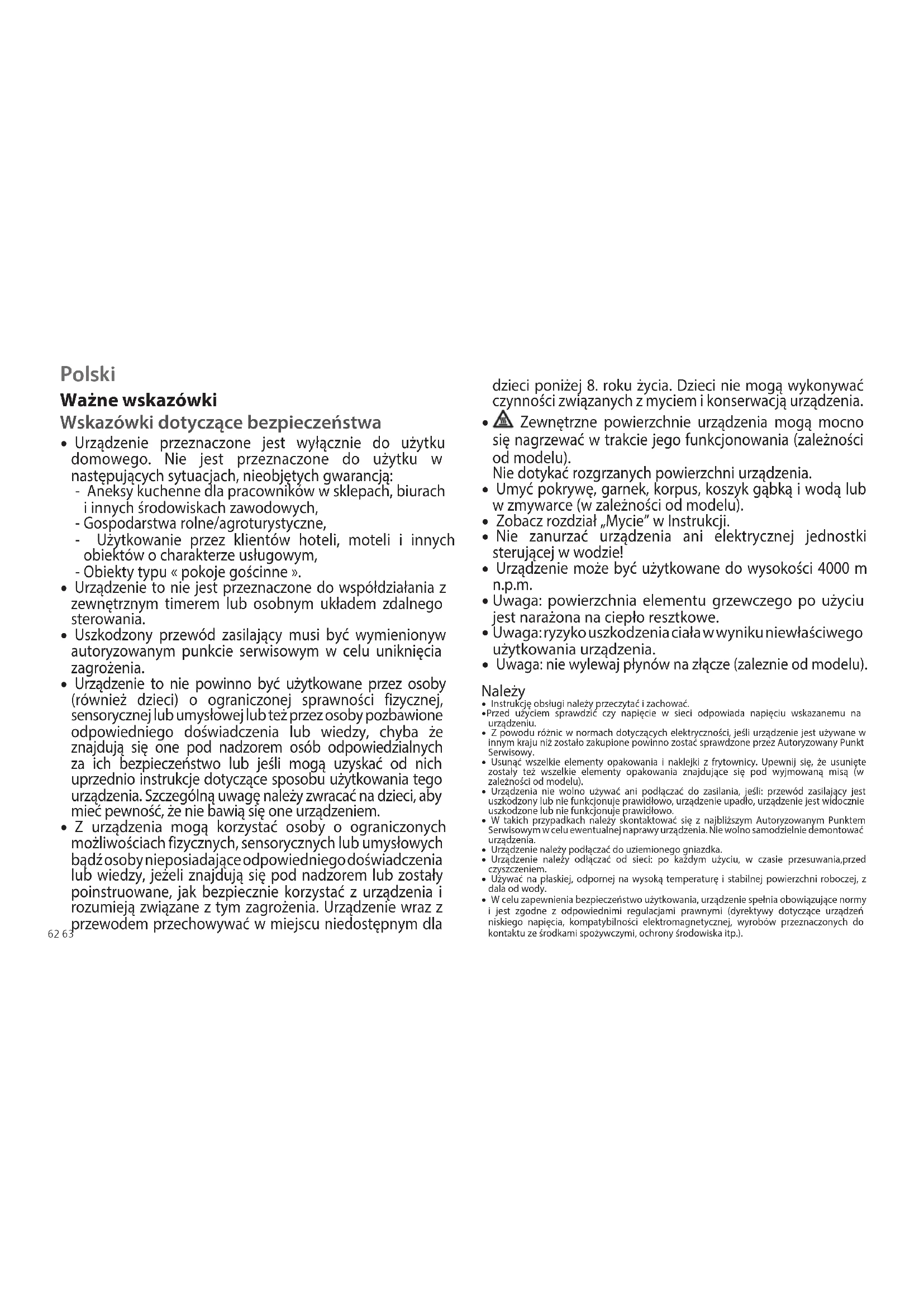 - Z urządzenia mogą korzystać osoby o ograniczonych możliwościach fizycznych, sensorycznych lub umysłowych bądź osoby nieposiadające odpowiedniego doświadczenia lub wiedzy, jeżeli znajdują się pod nadzorem lub zostały poinstruowane, jak bezpiecznie korzystać z urządzenia i rozumieją związane z tym zagrożenia. Urządzenie wraz z przewodem przechowywać w miejscu niedostępnym dla Polski dzieci poniżej 8. roku życia. Dzieci nie mogą wykonywać czynności związanych z myciem i konserwacją urządzenia.