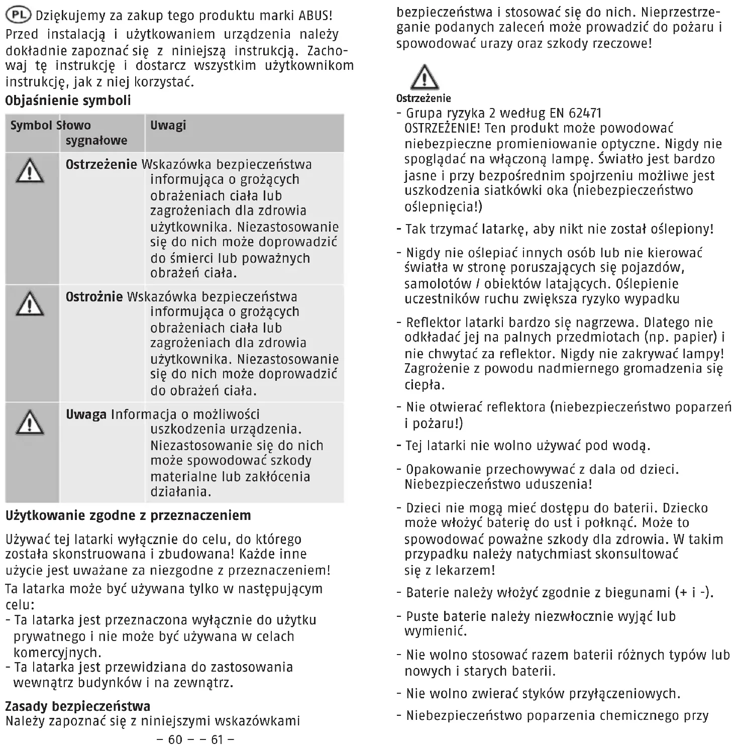vähäinen kirkkaus > sammutus. Kun paristojen varaus alkaa loppua, valo alkaa väristä ja sen teho heikentyä. Vaihda paristot viipymättä ja vaihda ne 2 uuteen 1,5 voltin AA-alkaliparistoon. On suositeltavaa käyttää laadukkaan merkkisiä paristoja, kuten Panasonic, Varta tai Duracell. Tekniset tiedot Paristojen tyyppi 2x 1,5 V alkali AA Kotelointiluokka IP44 Käyttötila Voimakas / vähäinen / sammutus Valaistuksen kesto 200 lumen: n. 3h, 40 lumen: n. 7h Maks. valon kantomatka 150 m Varastoinnin lämpötila-alue +10° ... +35° C Käyttölämpötila-alue -20° ... +40° C Materiaali Alumiini ja PC Mitat n. 149 x 19 x 26,5 mm Nettopaino n. 95 g (ilman paristoja) Vaatimustenmukaisuusvakuutus ABUS August Bremicker Söhne KG vakuuttaa, että laite TL-515 vastaa direktiivejä 2014/30/EU ja 2011/65/EU. Koko EU-vaatimustenmukaisuusvakuutuksen voi tilata sähköpostitse osoitteesta info@abus.de Hävittäminen Hävitä pakkaus samankaltaisten jätteiden kanssa. Toimita pahvi ja kartonki pahvinkeräykseen, kalvot ja muoviosat hyötyjätekeräykseen. Tässä tuotteessa on arvokkaita raaka-aineita. Hävitä tuote sen käyttöiän päätyttyä voimassa olevien lakimääräysten mukaisesti. Sähkölaitteita, akkuja ja paristoja ei saa hävittää kotitalousjätteen mukana. Hävittämisessä tulee noudattaa sähkö- ja elektroniikkalaiteromusta annettua direktiiviä 2012/19/ EU (WEEE) tai paristoista ja akuista sekä käytetyistä paristoista ja akuista annettua direktiiviä 2006/66/ EY. Paristot on poistettava sähkölaitteista ennen hävittämistä ja hävitettävä erikseen. Jos sinulla on kysyttävää hävittämisestä, käänny vastaavan paikallisen viranomaisen puoleen. Tietoa käytöstä poistettuja laitteita vastaanottavista tahoista saat esim. omasta kunnastasi, paikallisesta jätehuoltoyrityksestä tai liikkeestä, josta olet tuotteen ostanut. Takuu ABUS-tuotteet on suunniteltu ja valmistettu erittäin huolellisesti ja testattu voimassa olevien määräysten mukaisesti. Takuu koskee ainoastaan vikoja, joiden voidaan katsoa johtuvan materiaali- tai valmistusvioista. Jos kyse on materiaali- tai valmistusviasta, tuote korjataan tai vaihdetaan ABUSin harkinnan mukaan. Takuu päättyy näissä tapauksissa alkuperäisen takuuajan päättyessä. Tätä laajemmat vaatimukset on nimenomaisesti suljettu pois. ABUS ei vastaa vioista eikä vaurioista, jotka johtuvat ulkoisista vaikutuksista (esim. kuljetuksesta, liiallisesta voimankäytöstä), epäasianmukaisesta käytöstä, normaalista kulumisesta tai tämän ohjeen noudattamatta jättämisestä. Takuuvaatimuksen voimaansaattamiseksi valituksen kohteena olevan tuotteen mukaan on liitettävä alkuperäinen ostokuitti, josta käy ilmi ostopäivä, ja lyhyt kirjallinen kuvaus viasta. Oikeus teknisiin muutoksiin pidätetään. Virheistä ja painovirheistä ei oteta vastuuta. WEEE-Reg.-Nr. DE79663011– 60 – – 61 – Dziękujemy za zakup tego produktu marki ABUS! Przed instalacją i użytkowaniem urządzenia należy dokładnie zapoznać się z niniejszą instrukcją. Zacho- waj tę instrukcję i dostarcz wszystkim użytkownikom instrukcję, jak z niej korzystać. Symbol Słowo sygnałowe Uwagi Ostrzeżenie Wskazówka bezpieczeństwa informująca o grożących obrażeniach ciała lub zagrożeniach dla zdrowia użytkownika. Niezastosowanie się do nich może doprowadzić do śmierci lub poważnych obrażeń ciała. Ostrożnie Wskazówka bezpieczeństwa informująca o grożących obrażeniach ciała lub zagrożeniach dla zdrowia użytkownika. Niezastosowanie się do nich może doprowadzić do obrażeń ciała. Uwaga Informacja o możliwości uszkodzenia urządzenia. Niezastosowanie się do nich może spowodować szkody materialne lub zakłócenia działania. Objaśnienie symboli Użytkowanie zgodne z przeznaczeniem Używać tej latarki wyłącznie do celu, do którego została skonstruowana i zbudowana! Każde inne użycie jest uważane za niezgodne z przeznaczeniem! Ta latarka może być używana tylko w następującym celu: - Ta latarka jest przeznaczona wyłącznie do użytku prywatnego i nie może być używana w celach komercyjnych. - Ta latarka jest przewidziana do zastosowania wewnątrz budynków i na zewnątrz. Zasady bezpieczeństwa Należy zapoznać się z niniejszymi wskazówkami Ostrzeżenie bezpieczeństwa i stosować się do nich. Nieprzestrze- ganie podanych zaleceń może prowadzić do pożaru i spowodować urazy oraz szkody rzeczowe! - Grupa ryzyka 2 według EN 62471 OSTRZEŻENIE! Ten produkt może powodować niebezpieczne promieniowanie optyczne. Nigdy nie spoglądać na włączoną lampę. Światło jest bardzo jasne i przy bezpośrednim spojrzeniu możliwe jest uszkodzenia siatkówki oka (niebezpieczeństwo oślepnięcia!) - Tak trzymać latarkę, aby nikt nie został oślepiony! - Nigdy nie oślepiać innych osób lub nie kierować światła w stronę poruszających się pojazdów, samolotów / obiektów latających. Oślepienie uczestników ruchu zwiększa ryzyko wypadku - Reektor latarki bardzo się nagrzewa. Dlatego nie odkładać jej na palnych przedmiotach (np. papier) i nie chwytać za reektor. Nigdy nie zakrywać lampy! Zagrożenie z powodu nadmiernego gromadzenia się ciepła. - Nie otwierać reektora (niebezpieczeństwo poparzeń i pożaru!) - Tej latarki nie wolno używać pod wodą. - Opakowanie przechowywać z dala od dzieci. Niebezpieczeństwo uduszenia! - Dzieci nie mogą mieć dostępu do baterii. Dziecko może włożyć baterię do ust i połknąć. Może to spowodować poważne szkody dla zdrowia. W takim przypadku należy natychmiast skonsultować się z lekarzem! - Baterie należy włożyć zgodnie z biegunami (+ i -). - Puste baterie należy niezwłocznie wyjąć lub wymienić. - Nie wolno stosować razem baterii różnych typów lub nowych i starych baterii. - Nie wolno zwierać styków przyłączeniowych. - Niebezpieczeństwo poparzenia chemicznego przy– 62 – – 63 – kontakcie z wyciekającymi lub