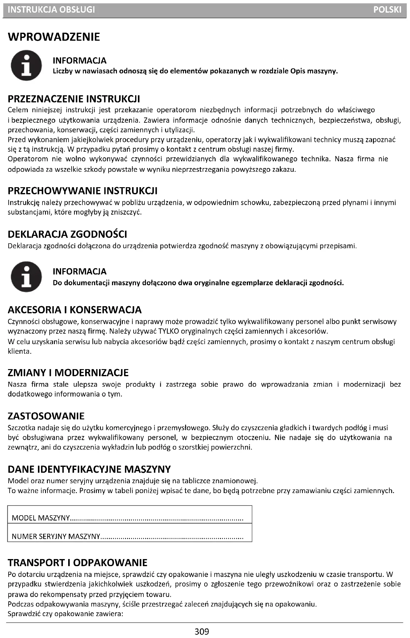AKCESSORIA/OPCJE ........................................................................................................................................................... 328 USUWANIE USTEREK ................................................................................................................ 328 UTYLIZACJA .............................................................................................................................. 330INSTRUKCJA OBSŁUGI POLSKI WPROWADZENIE INFORMACJA Liczby w nawiasach odnoszą się do elementów pokazanych w rozdziale Opis maszyny. PRZEZNACZENIE INSTRUKCJI Celem niniejszej instrukcji jest przekazanie operatorom niezbędnych informacji potrzebnych do właściwego i bezpiecznego użytkowania urządzenia. Zawiera informacje odnośnie danych technicznych, bezpieczeństwa, obsługi, przechowania, konserwacji, części zamiennych i utylizacji. Przed wykonaniem jakiejkolwiek procedury przy urządzeniu, operatorzy jak i wykwalifikowani technicy muszą zapoznać się z tą instrukcją. W przypadku pytań prosimy o kontakt z centrum obsługi naszej firmy. Operatorom nie wolno wykonywać czynności przewidzianych dla wykwalifikowanego technika. Nasza firma nie odpowiada za wszelkie szkody powstałe w wyniku nieprzestrzegania powyższego zakazu. PRZECHOWYWANIE INSTRUKCJI Instrukcję należy przechowywać w pobliżu urządzenia, w odpowiednim schowku, zabezpieczoną przed płynami i innymi substancjami, które mogłyby ją zniszczyć.