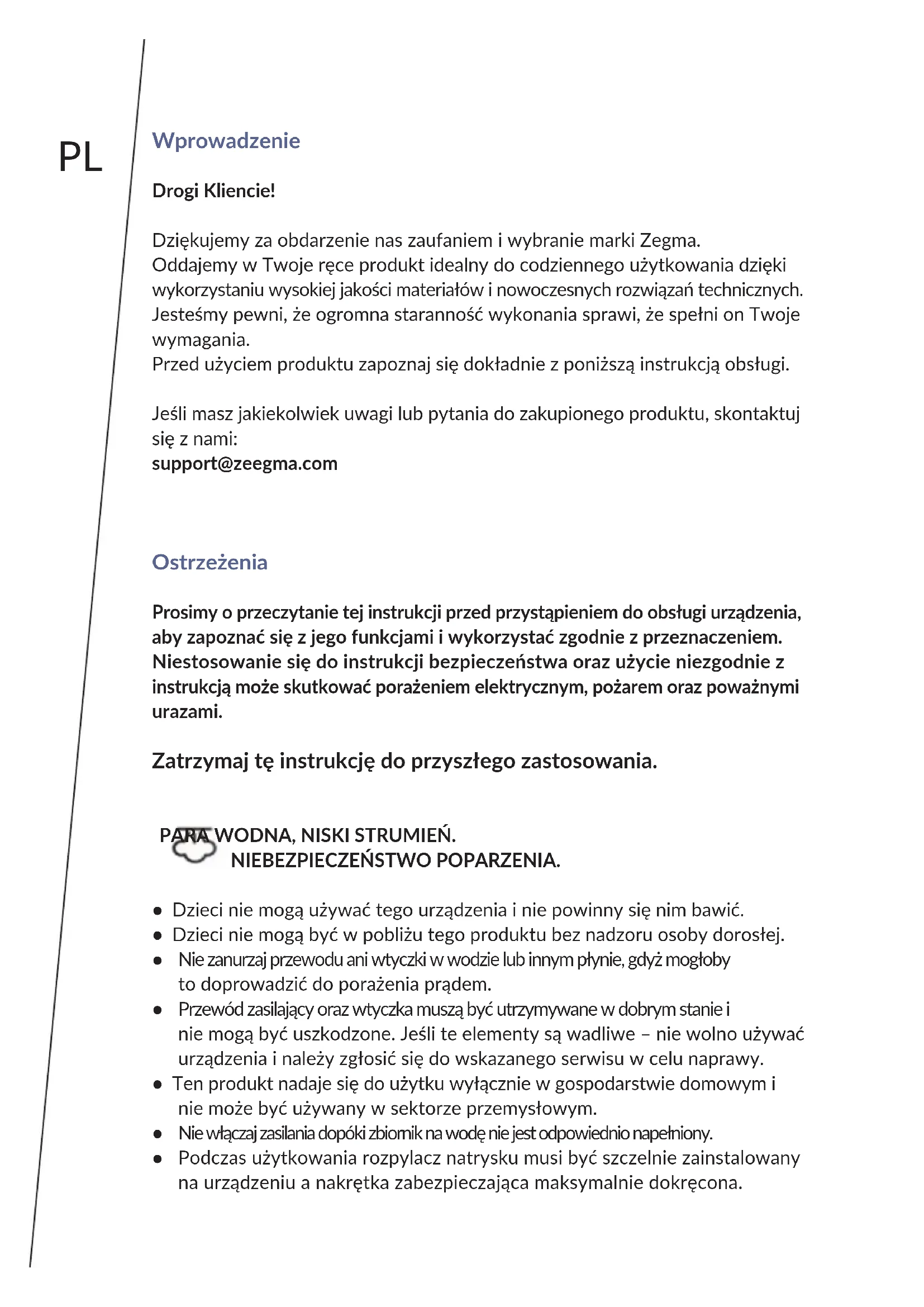Wsadź wszystkie elementy zestawu z powrotem do opakowania. Przechowuj je w suchym, dobrze wentylowanym miejscu. Do napełnienia zbiornika można użyć zwykłej wody z kranu. Jeśli woda w miejscu Twojego zamieszkania jest twarda, korzystanie z wody z kranu może spowodować szybsze zakamienienie myjki parowej a w efekcie skrócić jej żywotność. W takiej sytuacji produkt należy uzupełniać wodą destylowaną. Po każdym użyciu należy opróżnić zbiornik na wodę aby nie dopuścić do wytworzenia się kamienia. Nie dodawaj żadnych płynów do zawartości zbiornika i nie używaj wody z suszarek do ubrań, wody zapachowej lub zmiękczonej, wody z lodówek, klimatyzatorów i wody deszczowej. Zawierają one odpady organiczne i pierwiastki mineralne, które podczas ogrzewania mogą wchodzić w reakcje chemiczne i powodować uszkodzenia natrysku, brązowe zabrudzenia lub przedwczesne zużycie się sprzętu. Użycie niedozwolonych typów wody unieważni gwarancję producenta. Nie używaj gąbki ściernej do czyszczenia urządzenia. Urządzenie należy dokładnie czyścić po każdym dziesiątym użyciu.PL Rozwiązywanie problemów Problem Możliwa przyczyna Rozwiązanie Nie ma pary Brak zasilania Sprawdź czy gniazdko działa i czy sprzęt jest poprawnie podłączony Brak wody w zbiorniku Brak wody w zbiorniku Uzupełnij wodę zgodnie z zaleceniami w instrukcji (sprawdź rozdział Użytkowanie produktu) Pary jest zbyt mało Napięcie jest zbyt niskie lub zbyt mało stabilne Sprawdź czy gniazdko działa i czy sprzęt jest poprawnie podłączony Zbyt mało wody w zbiorniku Uzupełnij wodę zgodnie z zaleceniami w instrukcji (sprawdź rozdział Użytkowanie produktu) Zamiast pary z dyszy wycieka woda Za dużo wody w zbiorniku Wylej trochę wody ze zbiornika. Sugerowana ilość wynosi 250 ml Produkt podczas użytkowania jest nachylany zbyt mocno Podczas pracy korpus maszyny nie może być nachylony pod kątem większym niż 45 stopni. Nie nachylaj sprzętu zbyt mocno podczas pracy Urządzenie zbyt długo się nagrzewa Napięcie jest zbyt niskie lub zbyt mało stabilne Sprawdź czy gniazdko działa i czy sprzęt jest poprawnie podłączony Produkt zgodny z wymaganiami dyrektyw Unii Europejskiej. Zgodnie z Dyrektywą 2012/19/UE, niniejszy produkt podlega zbiórce selektywnej. Produktu nie należy wyrzucać wraz z odpadami komunalnymi, gdyż może stanowić on zagrożenie dla środowiska i zdrowia ludzi. Zużyty produkt należy oddać do punktu recyklingu urządzeń elektrycznych i elektronicznych. Zdjęcia mają charakter poglądowy, rzeczywisty wygląd produktów może różnić się od prezentowanego na zdjęciach.IT Introduzione Genle Cliente! Grazie per aver riposto in noi la Vostra ducia e aver scelto un marchio Zeegma. Vi oriamo il prodoo ideale per l’uso quodiano grazie all’ulizzo di materiali di alta qualità e soluzioni tecniche moderne.Siamo sicuri che una grande cura nella lavorazione lo renderà conforme alle vostre esigenze.Prima di ulizzare il prodoo, leggere aentamente il presente manuale. In caso di un qualsiasi commento o domanda sul prodoo acquistato, non esitate a contaarci: support@zeegma.com Avvermen Si prega di leggere questo manuale prima di ulizzare il disposivo per scoprire le sue funzioni e ulizzarlo per lo scopo previsto. La mancata osservanza delle istruzioni di sicurezza e l’uso non conforme alle istruzioni può causare scosse eleriche, incendi e gravi lesioni. Conservare questa istruzione per futuri ulizzi. VAPORE, FLUSSO BASSO. PERICOLO DI USTIONI.