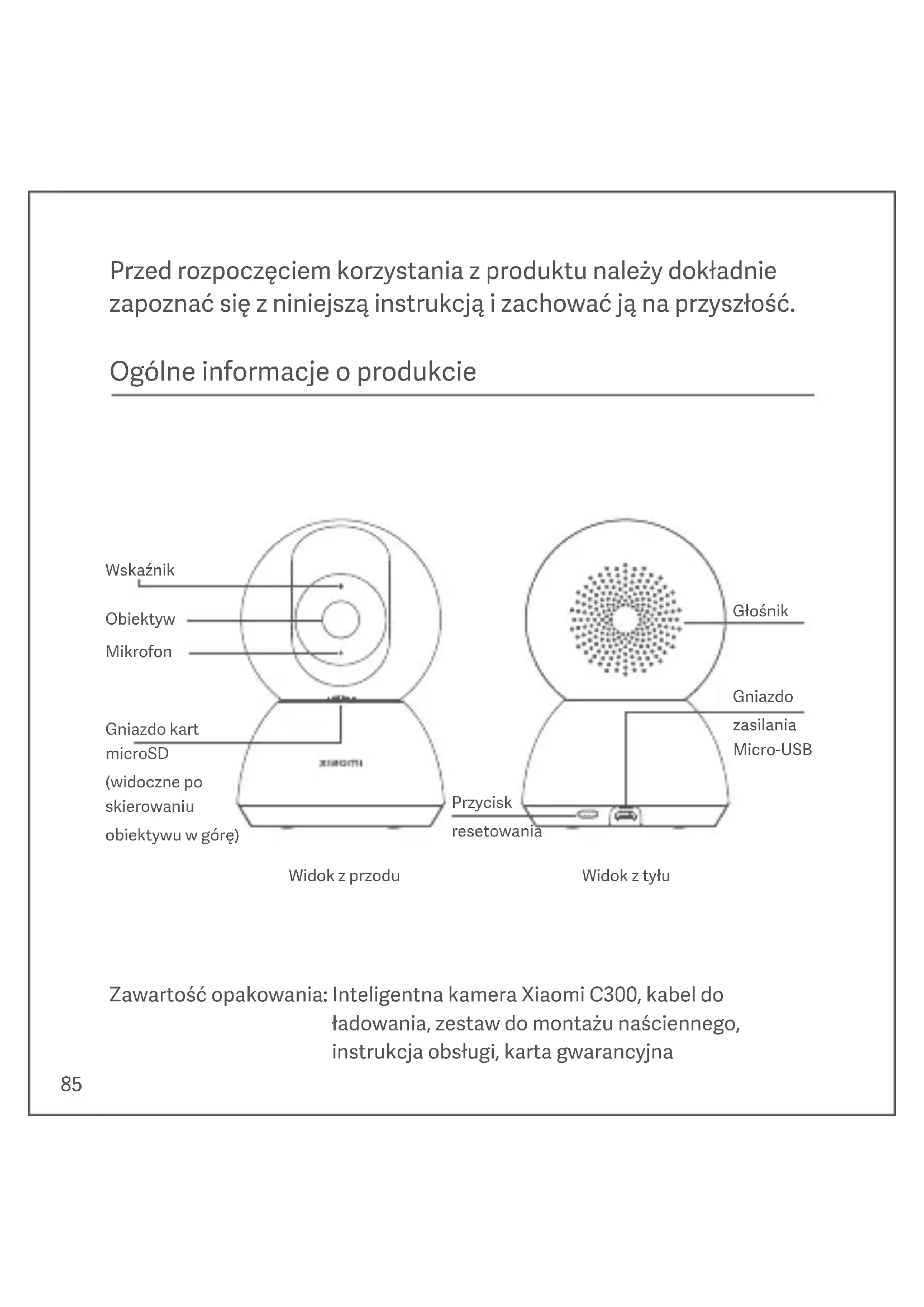제조업체: Xiaomi Communications Co., Ltd. 주소: #019, 9th Floor, Building 6, 33 Xi'erqi Middle Road, Haidian District, Beijing, China 제품 관련 정보는 www.mi.com/kr/ 사용 설명서 버전: V1.0 를 방문해 주시기 바랍니다.Ogólne informacje o produkcie Głośnik Wskaźnik Obiektyw Mikrofon RESETUJ Przed rozpoczęciem korzystania z produktu należy dokładnie zapoznać się z niniejszą instrukcją i zachować ją na przyszłość. Gniazdo kart microSD (widoczne po skierowaniu obiektywu w górę) Gniazdo zasilania Micro-USB Przycisk resetowania Widok z przodu Widok z tyłu Zawartość opakowania: Inteligentna kamera Xiaomi C300, kabel do ładowania, zestaw do montażu naściennego, instrukcja obsługi, karta gwarancyjna