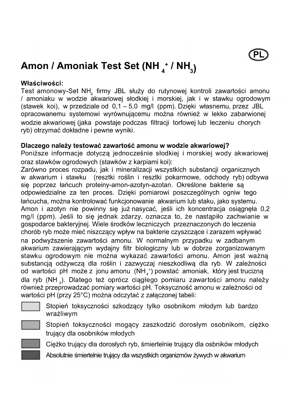 ). Dlatego też oprócz ciągłego pomiaru zawartości amonu należy również przeprowadzać pomiary wartości pH. Toksyczność amonu w zależności od wartości pH (przy 25°C) można odczytać z załączonej tabeli: Stopień toksyczności szkodzący tylko osobnikom młodym lub bardzo wrażliwym Stopień toksyczności mogący zaszkodzić dorosłym osobnikom, ciężko trujący dla osobników młodych Ciężko trujący dla dorosłych ryb, śmiertelnie trujący dla osbników młodych Absolutnie śmiertelnie trujący dla wszystkich organizmów żywych w akwariumPL Wskazówka dotycząca utrzymania właściwej zawartości amonu: Rozwiązanie krótkoterminowe (tylko w akwarium): ok. 50%-towa wymiana wody, przy czym wartość pH świeżej wody nie może być w żadnym wypadku wyższa niż wody w akwarium. Rozwiązanie na dłuższy okres czasu: Akwarium: Dostarczenie bakterii czyszczących za pomocą produktu JBL Denitrol lub JBL FilterStart. Poza tym używanie odpowiedniego, biologicznego ltra, ograniczenie karmienia, ewentualnie zredukowanie zarybienia. Stawek ogrodowy: Dostarczenie bakterii czyszczących za pomocą JBL BactoPond i JBL FilterStart Pond. Jeśli to nie możliwe: montaż wydajnego ltra stawowego. Jeśli to konieczne nowe przemyślenie konceptu stawku ogrodowego: wystarczająca wielkość dna? Czy istnieje strefa bagienna? Itp. Instrukcja zastosowania testu:
