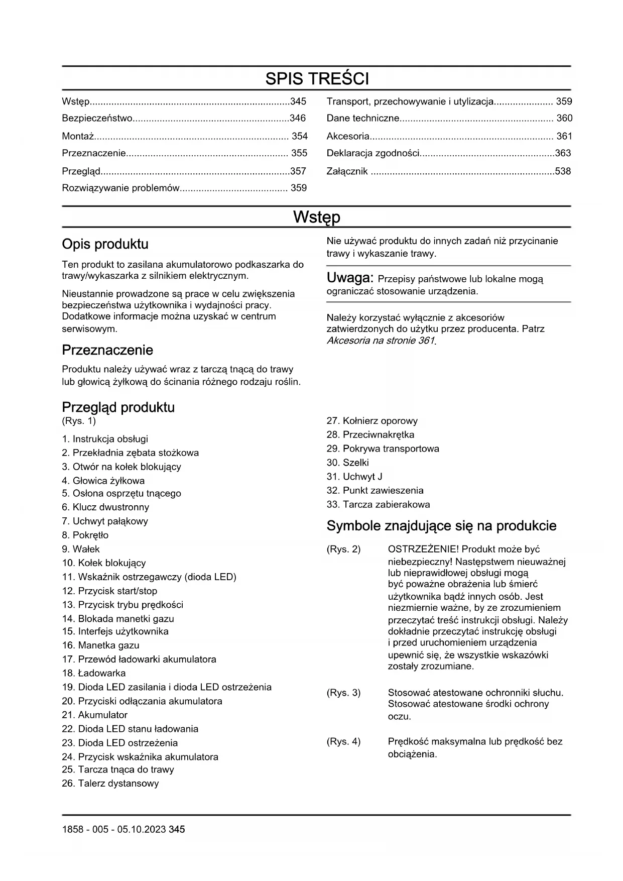 Symbole znajdujące się na produkcie (Rys. 2) OSTRZEŻENIE! Produkt może być niebezpieczny! Następstwem nieuważnej lub nieprawidłowej obsługi mogą być poważne obrażenia lub śmierć użytkownika bądź innych osób. Jest niezmiernie ważne, by ze zrozumieniem przeczytać treść instrukcji obsługi. Należy dokładnie przeczytać instrukcję obsługi i przed uruchomieniem urządzenia upewnić się, że wszystkie wskazówki zostały zrozumiane. (Rys. 3) Stosować atestowane ochronniki słuchu. Stosować atestowane środki ochrony oczu. (Rys. 4) Prędkość maksymalna lub prędkość bez obciążenia. 1858 - 005 - 05.10.2023 345XXXX/min lub min