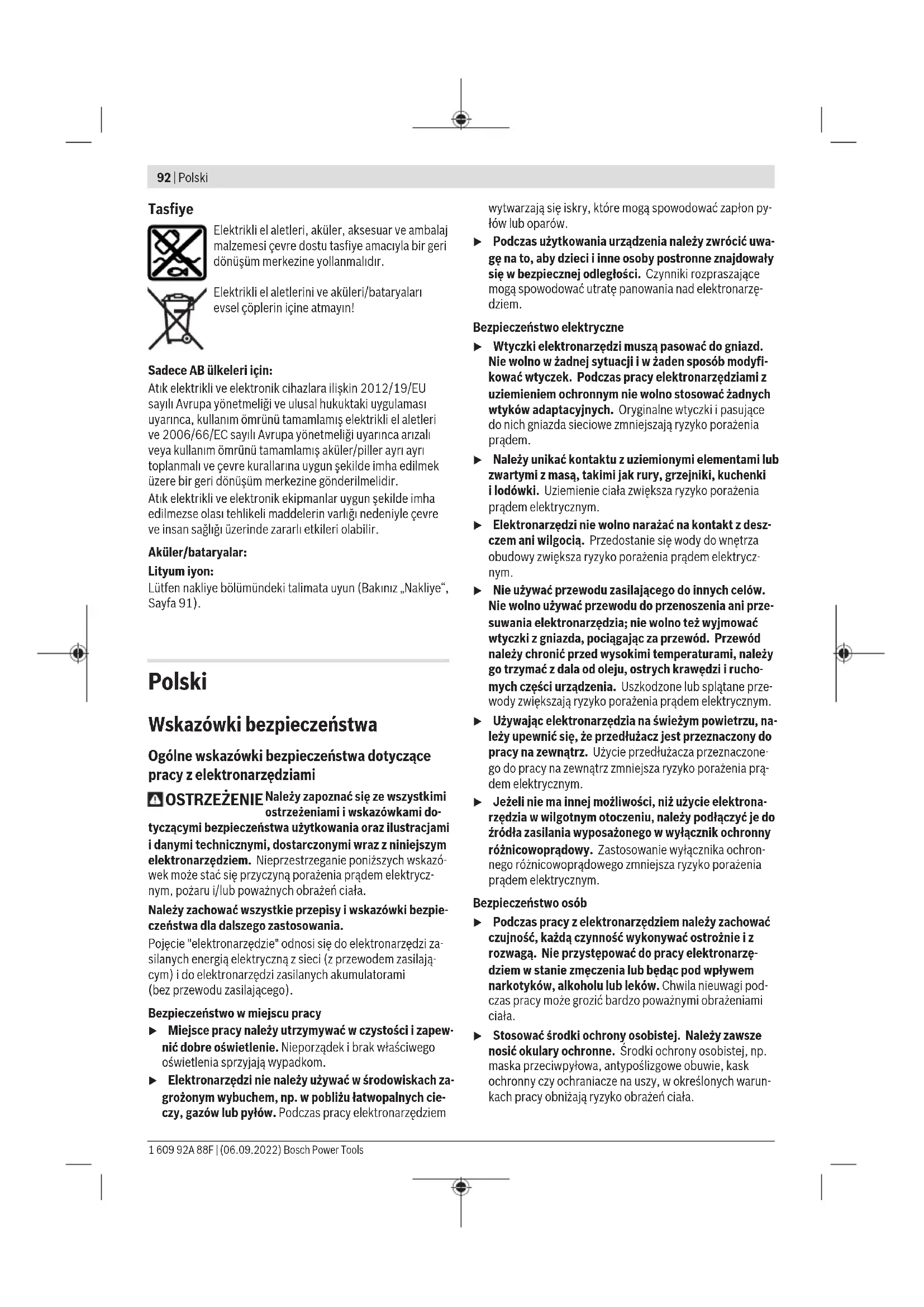 Karasoku Mahallesi 28028. Sokak No:20/A Merkez / ADANA Tel.: +903223599710 -3521379 Fax: +903223591323 E-mail: isiklar@isiklarelektrik.com Diğer servis adreslerini şurada bulabilirsiniz: www.bosch-pt.com/serviceaddresses Nakliye Önerilen Lityum İyon aküler tehlikeli madde taşıma yönetmeliği hükümlerine tabidir. Aküler başka bir yükümlülük olmaksızın kullanıcı tarafından caddeler üzerinde taşınabilir. Üçüncü kişiler eliyle yollanma durumunda (örneğin hava yolu ile veya nakliye şirketleri ile) paketleme ve etiketlemeye ilişkin özel hükümlere uyulmalıdır. Gönderi paketlenirken bir tehlikeli madde uzmanından yardım alınmalıdır. Aküleri sadece ve ancak gövdelerinde hasar yoksa gönderin. Açık kontakları kapatın ve aküyü ambalaj içinde hareket etmeyecek biçimde paketleyin. Lütfen olası ek ulusal yönetmelik hükümlerine de uyun. Bosch Power Tools 1 609 92A 88F | (06.09.2022)92 | Polski Tasfiye Elektrikli el aletleri, aküler, aksesuar ve ambalaj malzemesi çevre dostu tasfiye amacıyla bir geri dönüşüm merkezine yollanmalıdır. Elektrikli el aletlerini ve aküleri/bataryaları evsel çöplerin içine atmayın! Sadece AB ülkeleri için: Atık elektrikli ve elektronik cihazlara ilişkin 2012/19/EU sayılı Avrupa yönetmeliği ve ulusal hukuktaki uygulaması uyarınca, kullanım ömrünü tamamlamış elektrikli el aletleri ve 2006/66/EC sayılı Avrupa yönetmeliği uyarınca arızalı veya kullanım ömrünü tamamlamış aküler/piller ayrı ayrı toplanmalı ve çevre kurallarına uygun şekilde imha edilmek üzere bir geri dönüşüm merkezine gönderilmelidir. Atık elektrikli ve elektronik ekipmanlar uygun şekilde imha edilmezse olası tehlikeli maddelerin varlığı nedeniyle çevre ve insan sağlığı üzerinde zararlı etkileri olabilir. Aküler/bataryalar: Lityum iyon: Lütfen nakliye bölümündeki talimata uyun (Bakınız „Nakliye“, Sayfa91). Polski Wskazówki bezpieczeństwa Ogólne wskazówki bezpieczeństwa dotyczące pracy z elektronarzędziami OSTRZEŻENIE Należy zapoznać się ze wszystkimi ostrzeżeniami i wskazówkami do- tyczącymi bezpieczeństwa użytkowania oraz ilustracjami i danymi technicznymi, dostarczonymi wraz z niniejszym elektronarzędziem. Nieprzestrzeganie poniższych wskazó- wek może stać się przyczyną porażenia prądem elektrycz- nym, pożaru i/lub poważnych obrażeń ciała. Należy zachować wszystkie przepisy i wskazówki bezpie- czeństwa dla dalszego zastosowania. Pojęcie "elektronarzędzie" odnosi się do elektronarzędzi za- silanych energią elektryczną z sieci (z przewodem zasilają- cym) i do elektronarzędzi zasilanych akumulatorami (bezprzewodu zasilającego). Bezpieczeństwo w miejscu pracy u Miejsce pracy należy utrzymywać w czystości i zapew- nić dobre oświetlenie. Nieporządek i brak właściwego oświetlenia sprzyjają wypadkom. u Elektronarzędzi nie należy używać w środowiskach za- grożonym wybuchem, np. w pobliżu łatwopalnych cie- czy, gazów lub pyłów. Podczas pracy elektronarzędziem wytwarzają się iskry, które mogą spowodować zapłon py- łów lub oparów. u Podczas użytkowania urządzenia należy zwrócić uwa- gę na to, aby dzieci i inne osoby postronne znajdowały się w bezpiecznej odległości. Czynniki rozpraszające mogą spowodować utratę panowania nad elektronarzę- dziem. Bezpieczeństwo elektryczne u Wtyczki elektronarzędzi muszą pasować do gniazd. Nie wolno w żadnej sytuacji i w żaden sposób modyfi- kować wtyczek. Podczas pracy elektronarzędziami z uziemieniem ochronnym nie wolno stosować żadnych wtyków adaptacyjnych. Oryginalne wtyczki i pasujące do nich gniazda sieciowe zmniejszają ryzyko porażenia prądem. u Należy unikać kontaktu z uziemionymi elementami lub zwartymi z masą, takimi jak rury, grzejniki, kuchenki ilodówki. Uziemienie ciała zwiększa ryzyko porażenia prądem elektrycznym. u Elektronarzędzi nie wolno narażać na kontakt z desz- czem ani wilgocią. Przedostanie się wody do wnętrza obudowy zwiększa ryzyko porażenia prądem elektrycz- nym. u Nie używać przewodu zasilającego do innych celów. Nie wolno używać przewodu do przenoszenia ani prze- suwania elektronarzędzia; nie wolno też wyjmować wtyczki z gniazda, pociągając za przewód. Przewód należy chronić przed wysokimi temperaturami, należy go trzymać zdala od oleju, ostrych krawędzi i rucho- mych części urządzenia. Uszkodzone lub splątane prze- wody zwiększają ryzyko porażenia prądem elektrycznym. u Używając elektronarzędzia na świeżym powietrzu, na- leży upewnić się, że przedłużacz jest przeznaczony do pracy na zewnątrz. Użycie przedłużacza przeznaczone- go do pracy na zewnątrz zmniejsza ryzyko porażenia prą- dem elektrycznym. u Jeżeli nie ma innej możliwości, niż użycie elektrona- rzędzia w wilgotnym otoczeniu, należy podłączyć je do źródła zasilania wyposażonego w wyłącznik ochronny różnicowoprądowy. Zastosowanie wyłącznika ochron- nego różnicowoprądowego zmniejsza ryzyko porażenia prądem elektrycznym. Bezpieczeństwo osób u Podczas pracy z elektronarzędziem należy zachować czujność, każdą czynność wykonywać ostrożnie i z rozwagą. Nie przystępować do pracy elektronarzę- dziem w stanie zmęczenia lub będąc pod wpływem narkotyków, alkoholu lub leków. Chwila nieuwagi pod- czas pracy może grozić bardzo poważnymi obrażeniami ciała. u Stosować środki ochrony osobistej. Należy zawsze nosić okulary ochronne. Środki ochrony osobistej, np. maska przeciwpyłowa, antypoślizgowe obuwie, kask ochronny czy ochraniacze na uszy, w określonych warun- kach pracy obniżają ryzyko obrażeń ciała. 1 609 92A 88F | (06.09.2022) Bosch Power ToolsPolski | 93 u Należy unikać niezamierzonego uruchomienia narzę- dzia. Przed podłączeniem elektronarzędzia do źródła zasilania i/lub podłączeniem akumulatora, podniesie- niem albo transportem urządz