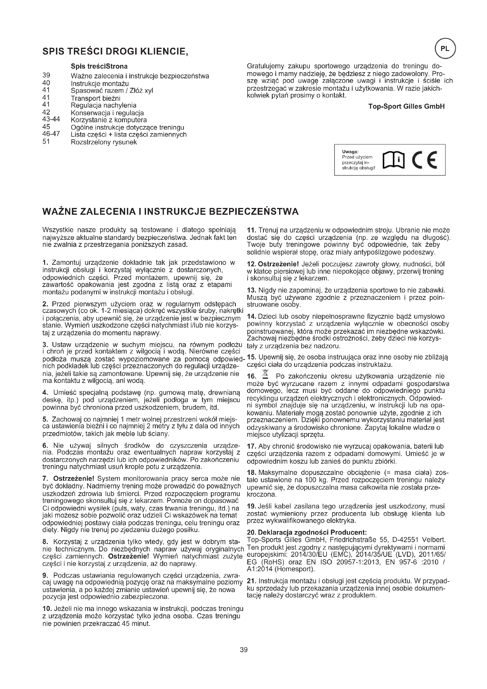 SPIS TREŚCI DROGI KLIENCIE, Gratulujemy zakupu sportowego urządzenia do treningu do- mowego i mamy nadzieję, że będziesz z niego zadowolony. Pro- szę wziąć pod uwagę załączone uwagi i instrukcje i ściśle ich przestrzegać w zakresie montażu i użytkowania. W razie jakich- kolwiek pytań prosimy o kontakt. Top-Sport Gilles GmbH Spis treściStrona Uwaga: Przed użyciem przeczytaj in- strukcję obsługi! WAŻNE ZALECENIA I INSTRUKCJE BEZPIECZEŃSTWA Wszystkie nasze produkty są testowane i dlatego spełniają najwyższe aktualne standardy bezpieczeństwa. Jednak fakt ten nie zwalnia z przestrzegania poniższych zasad.