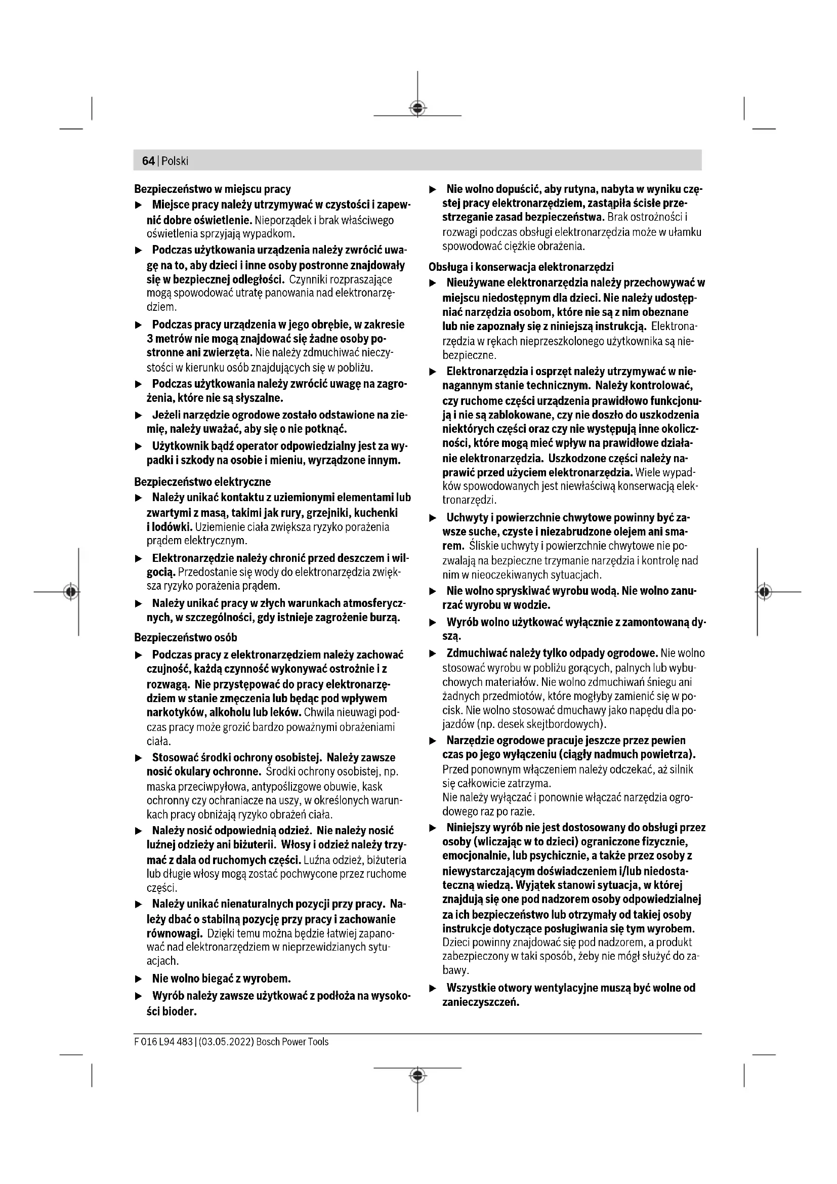 Karasoku Mahallesi 28028. Sokak No:20/A Merkez / ADANA Tel.: +903223599710 -3521379 Fax: +903223591323 E-mail: isiklar@isiklarelektrik.com Diğer servis adreslerini şurada bulabilirsiniz: www.bosch-pt.com/serviceaddresses Nakliye Önerilen Lityum İyon aküler tehlikeli madde taşıma yönetmeliği hükümlerine tabidir. Aküler başka bir yükümlülük olmaksızın kullanıcı tarafından caddeler üzerinde taşınabilir. Üçüncü kişiler eliyle yollanma durumunda (örneğin hava yolu ile veya nakliye şirketleri ile) paketleme ve etiketlemeye ilişkin özel hükümlere uyulmalıdır. Gönderi paketlenirken bir tehlikeli madde uzmanından yardım alınmalıdır. Aküleri sadece ve ancak gövdelerinde hasar yoksa gönderin. Açık kontakları kapatın ve aküyü ambalaj içinde hareket etmeyecek biçimde paketleyin. Lütfen olası ek ulusal yönetmelik hükümlerine de uyun. Tasfiye Ürünler, aküler, aksesuar ve ambalaj malzemesi çevre dostu yeniden kazanım merkezine gönderilmek zorundadır. ürünleri ve aküleri/bataryaları evsel çöplerin içine atmayın! Sadece AB ülkeleri için: 2012/19/EU yönetmeliği uyarınca kullanım ömrünü tamamlamış ürünler ve 2006/66/EC yönetmeliği uyarınca arızalı veya kullanım ömrünü tamamlamış aküler/ bataryalar ayrı ayrı toplanmak ve çevre dostu tasfiye için bir geri dönüşüm merkezine gönderilmek zorundadır. Atık elektrikli ve elektronik ekipmanlar uygun şekilde imha edilmezse olası tehlikeli maddelerin varlığı nedeniyle çevre ve insan sağlığı üzerinde zararlı etkileri olabilir. Aküler/bataryalar: Lityum iyon: Lütfen nakliye bölümündeki talimata uyun (Bakınız „Nakliye“, Sayfa63). Polski Wskazówki bezpieczeństwa Wyjaśnienie symboli umieszczonych na narzędziu ogrodowym Ogólna wskazówka ostrzegająca przed poten- cjalnym zagrożeniem. Przed przystąpieniem do pracy należy przeczy- tać niniejszą instrukcję eksploatacji. Nie stosować podczas deszczu. OSTRZEŻENIE: Należy zachować ostrożność przed odrzuconymi elementami. OSTRZEŻENIE: Osoby trzecie należy trzymać z dala od miejsca pracy. W czasie pracy wyrobu nie wolno wkładać rąk ani nóg do żadnego z jego otworów. Dmuchawa obrotowa. W czasie pracy wyrobu nie uważać, aby ęce, nogi, długie włosy lub luź- na odzież nie dostała się do znajdujących się w nim otworów. Należy stosować środki ochrony słuchu i okula- ry ochronne. OSTRZEŻENIE: Przed przystąpieniem do prac konserwacyjnych należy odciąć zasilanie aku- mulatorem. Ogólne wskazówki bezpieczeństwa dotyczące pracy z elektronarzędziami OSTRZEŻENIE Należy zapoznać się ze wszystkimi ostrzeżeniami i wskazówkami do- tyczącymi bezpieczeństwa użytkowania oraz ilustracjami i danymi technicznymi, dostarczonymi wraz z niniejszym elektronarzędziem. Nieprzestrzeganie poniższych wskazó- wek może stać się przyczyną porażenia prądem elektrycz- nym, pożaru i/lub poważnych obrażeń ciała. Należy zachować wszystkie przepisy i wskazówki bezpie- czeństwa dla dalszego zastosowania. Pojęcie "elektronarzędzie" odnosi się do elektronarzędzi za- silanych energią elektryczną z sieci (z przewodem zasilają- cym) i do elektronarzędzi zasilanych akumulatorami (bezprzewodu zasilającego). Bosch Power Tools F 016 L94 483 | (03.05.2022)64 | Polski Bezpieczeństwo w miejscu pracy u Miejsce pracy należy utrzymywać w czystości i zapew- nić dobre oświetlenie. Nieporządek i brak właściwego oświetlenia sprzyjają wypadkom. u Podczas użytkowania urządzenia należy zwrócić uwa- gę na to, aby dzieci i inne osoby postronne znajdowały się w bezpiecznej odległości. Czynniki rozpraszające mogą spowodować utratę panowania nad elektronarzę- dziem. u Podczas pracy urządzenia w jego obrębie, w zakresie 3metrów nie mogą znajdować się żadne osoby po- stronne ani zwierzęta. Nie należy zdmuchiwać nieczy- stości w kierunku osób znajdujących się w pobliżu. u Podczas użytkowania należy zwrócić uwagę na zagro- żenia, które nie są słyszalne. u Jeżeli narzędzie ogrodowe zostało odstawione na zie- mię, należy uważać, aby się o nie potknąć. u Użytkownik bądź operator odpowiedzialny jest za wy- padki i szkody na osobie i mieniu, wyrządzone innym. Bezpieczeństwo elektryczne u Należy unikać kontaktu z uziemionymi elementami lub zwartymi z masą, takimi jak rury, grzejniki, kuchenki ilodówki. Uziemienie ciała zwiększa ryzyko porażenia prądem elektrycznym. u Elektronarzędzie należy chronić przed deszczem i wil- gocią. Przedostanie się wody do elektronarzędzia zwięk- sza ryzyko porażenia prądem. u Należy unikać pracy w złych warunkach atmosferycz- nych, w szczególności, gdy istnieje zagrożenie burzą. Bezpieczeństwo osób u Podczas pracy z elektronarzędziem należy zachować czujność, każdą czynność wykonywać ostrożnie i z rozwagą. Nie przystępować do pracy elektronarzę- dziem w stanie zmęczenia lub będąc pod wpływem narkotyków, alkoholu lub leków. Chwila nieuwagi pod- czas pracy może grozić bardzo poważnymi obrażeniami ciała. u Stosować środki ochrony osobistej. Należy zawsze nosić okulary ochronne. Środki ochrony osobistej, np. maska przeciwpyłowa, antypoślizgowe obuwie, kask ochronny czy ochraniacze na uszy, w określonych warun- kach pracy obniżają ryzyko obrażeń ciała. u Należy nosić odpowiednią odzież. Nie należy nosić luźnej odzieży ani biżuterii. Włosy i odzież należy trzy- mać z dala od ruchomych części. Luźna odzież, biżuteria lub długie włosy mogą zostać pochwycone przez ruchome części. u Należy unikać nienaturalnych pozycji przy pracy. Na- leży dbać o stabilną pozycję przy pracy i zachowanie równowagi. Dzięki temu można będzie łatwiej zapano- wać nad elektronarzędziem w nieprzewidzianych sytu- acjach. u Nie wolno biegać z wyrobem. u Wyrób należy zawsze użytkować z podłoża na wysoko- ści bioder. u Nie wo