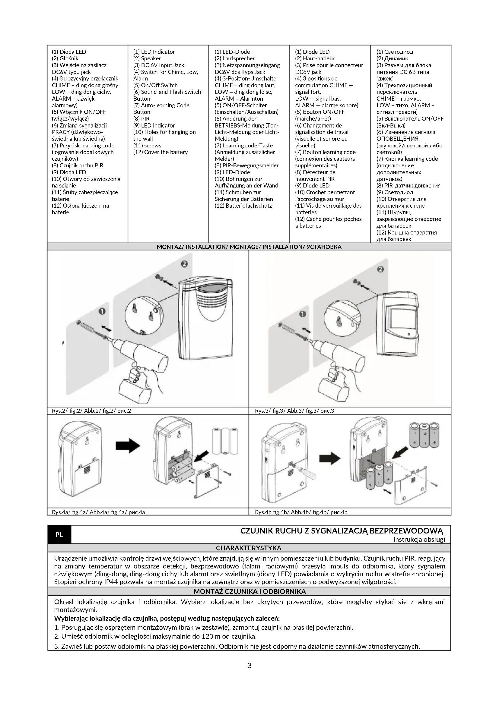 Instrukcja obsługi CHARAKTERYSTYKA Urządzenie umożliwia kontrolę drzwi wejściowych, które znajdują się w innym pomieszczeniu lub budynku. Czujnik ruchu PIR, reagujący na zmiany temperatur w obszarze detekcji, bezprzewodowo (falami radiowymi) przesyła impuls do odbiornika, który sygnałem dźwiękowym (ding-dong, ding-dong cichy lub alarm) oraz świetlnym (diody LED) powiadamia o wykryciu ruchu w strefie chronionej. Stopień ochrony IP44 pozwala na montaż czujnika na zewnątrz oraz w pomieszczeniach o podwyższonej wilgotności.