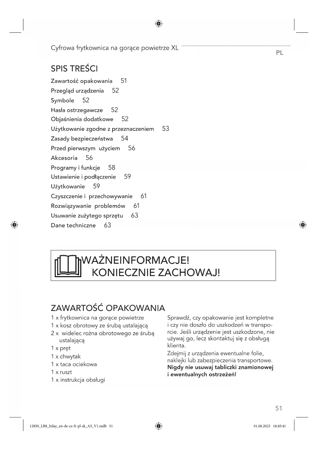 Zawartość opakowania 51 Przegląd urządzenia 52 Symbole 52 Hasła ostrzegawcze 52 Objaśnienia dodatkowe 52 Użytkowanie zgodne zprzeznaczeniem 53 Zasady bezpieczeństwa 54 Przed pierwszym użyciem 56 Akcesoria 56 Programy i funkcje 58 Ustawienie ipodłączenie 59 Użytkowanie 59 Czyszczenie i przechowywanie 61 Rozwiązywanie problemów 61 Usuwanie zużytego sprzętu 63 Dane techniczne 63 ZAWARTOŚĆ OPAKOWANIA 1 x frytkownica na gorące powietrze 1 x kosz obrotowy ze śrubą ustalającą 2 x widelec rożna obrotowego ze śrubą ustalającą 1 x pręt 1 x chwytak 1 x taca ociekowa 1 x ruszt 1 x instrukcja obsługi Sprawdź, czy opakowanie jest kompletne iczy nie doszło do uszkodzeń w transpo- rcie. Jeśli urządzenie jest uszkodzone, nie używaj go, lecz skontaktuj się zobsługą klienta. Zdejmij zurządzenia ewentualne folie, naklejki lub zabezpieczenia transportowe. Nigdy nie usuwaj tabliczki znamionowej i ewentualnych ostrzeżeń! WAŻNE INFORMACJE! KONIECZNIE ZACHOWAJ! 12850_LB8_Inlay_en-de-cz-fr-pl-sk_A5_V1.indb 5112850_LB8_Inlay_en-de-cz-fr-pl-sk_A5_V1.indb 51 01.06.2023 16:45:4101.06.2023 16:45:41PL