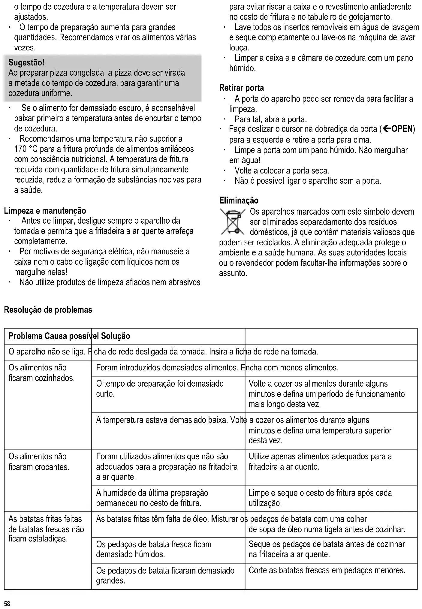 Używanie programów automatycznych, punkty 4-9. Porady dotyczące smażenia w termoobiegu ∙ Do przyrządzenia dania można użyć podstawowych programów automatycznych lub dostosować ustawienia do własnych potrzeb. ∙ Podane czasy gotowania mają charakter jedynie orientacyjny. W zależności od produktu spożywczego, czas gotowania i temperatura mogą wymagać dostosowania. ∙ Im większa ilość produktu spożywczego, tym dłuższy czas gotowania. Zaleca się częste odwarcanie przyrządzanych produktów. Wskazówka! Przy przygotowaniu pizzy mrożonej pizza po upływie połowy czasu musi zostać obrócona, aby zapewnić równomierną obróbkę termiczną. ∙ Jeżeli produkt jest zbyt przypieczony, lepiej najpierw obniżyć temperaturę, a dopiero potem w razie potrzeby czas gotowania. ∙ Aby smażyć jak najzdrowiej z zachowaniem jak największej ilości wartości odżywczych, proponujemy nie nagrzewać frytownicy do temperatury wyższej niż 170 °C przy smażeniu produktów skrobiowych tzn. produktów o ponad średniej zawartości skrobi. Zmniejszona temperatura smażenia, połączona z równie zmniejszoną ilością smażonej żywności zmniejsza z kolei do minimum wytwarzanie szkodliwych dla zdrowia substancji. Konserwacja i czyszczenie ∙ Przed każdym czyszczeniem wyjąć wtyczkę sieciową i poczekać na ostygnięcie frytkownicy na gorące powietrze. ∙ Ostrzeżenie! Aby nie narazić się na porażenie prądem, nie należy myć obudowy frytkownicy ani przewodu zasilającego wodą lub innymi płynami, ani zanurzać ich. ∙ Nie stosować ostrych lub trących środków czyszczących, aby nie zadrapać obudowy i powłoki zapobiegającej przywieraniu na koszu do smażenia w głębokim tłuszczu i blachy ociekowej. ∙ Wszystkie wyjmowane wkładki oczyścić środkiem do zmywania i dokładnie osuszyć lub wyczyścić w zmywarce do naczyń. ∙ Wytrzeć obudowę i przestrzeń obróbki termicznej wilgotną ściereczką. Zdejmowanie drzwiczek ∙ Dla ułatwienia czyszczenia możliwe jest zdejmowanie drzwiczek urządzenia. ∙ W tym celu otworzyć drzwiczki. ∙ Przesunąć suwak na zawiasie drzwiowym (OPEN) w lewo i zdjąć drzwiczki do góry. ∙ Wytrzeć drzwiczki na mokro. Nie zanurzać w wodzie! ∙ Ponownie włożyć suche drzwiczki. ∙ Urządzenia nie da się włączyć bez drzwiczek. Utylizacja Urządzenia oznaczone powyższym symbolem należy utylizować osobno, a nie wraz ze zwykłymi odpadkami z gospodarstwa domowego. Urządzenia takie zawierają bowiem cenne materiały, które można poddać recyklingowi. Odpowiednia utylizacja takich urządzeń pomaga w ochronie środowiska i zdrowia człowieka. Szczegółowych informacji na ten temat udzielają lokalne władze lub sklepy prowadzące sprzedaż detaliczną.64 142 x 208 mm Usuwanie błędów Problem Możliwa przyczyna Rozwiązanie Urządzenie nie włącza się. Wtyczka sieciowa nie jest podłączona. Włożyć wtyczkę sieciową do gniazdka. Żywność nie została poddana obróbce termicznej. Umieszczono zbyt dużą ilość żywności. Włożyć mniejszą ilość żywności. Czas przygotowywania był za krótki. Przeprowadzić dodatkową obróbkę termiczną żywności przez kilka minut i przy kolejnym razie ustawić dłuższy czas. Temperatura była za niska. Przeprowadzić dodatkową obróbkę termiczną żywności przez kilka minut i przy kolejnym razie ustawić wyższą temperaturę. Żywność nie jest chrupiąca. Zastosowano żywność, która nie jest odpowiednia do przygotowywania w frytkownicy na gorące powietrze. Stosować tylko żywność, która jest odpowiednia do frytkownicy na gorące powietrze. W koszyku do smażenia na głębokim tłuszczu pozostała wilgoć z poprzedniej obróbki termicznej. Po każdym użyciu oczyścić koszyk do smażenia na głębokim tłuszczu i osuszyć go. Frytki ze świeżych ziemniaków nie są chrupiące. We frytkach brakuje oleju. Przed przygotowaniem zmieszać kawałki ziemniaka z łyżką stołową oleju. Świeże kawałki ziemniaka były za mokre. Przed przygotowaniem we frytkownicy na gorące powietrze osuszyć świeże kawałki ziemniaka. Kawałki ziemniaka były za duże. Pokroić świeże ziemniaki na mniejsze kawałki.65 142 x 208 mm Αεροφριτέζα Οδηγίες χρήσης Πριν χρησιμοποιήσετε τη συσκευή, διαβάστε προσεκτικά τις ακόλουθες οδηγίες χρήσης και φυλάξτε το παρόν εγχειρίδιο για μελλοντική χρήση. Η συσκευή πρέπει να χρησιμοποιείται από άτομα που να γνωρίζουν αυτές τις