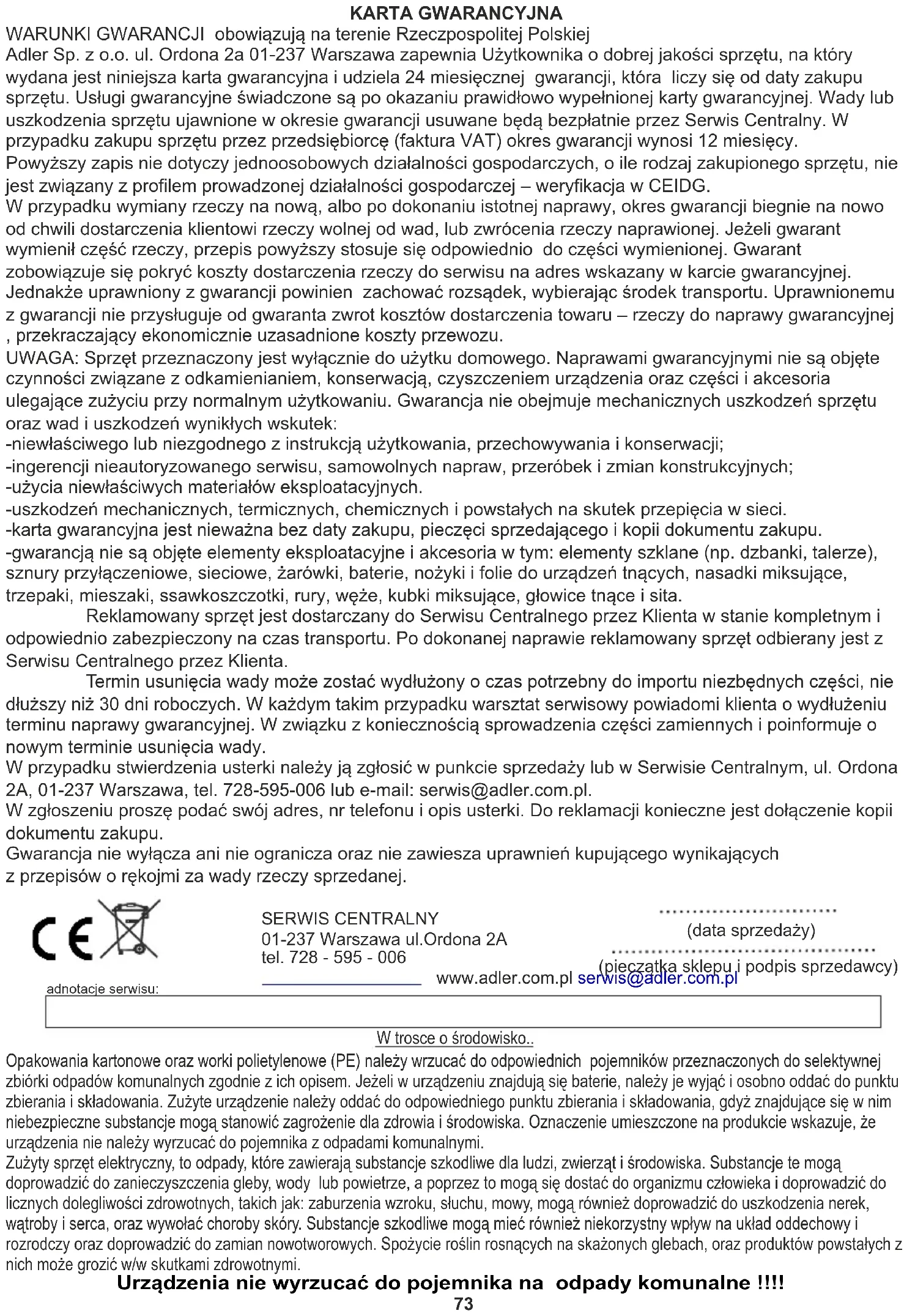 настрана да изсъхне. 5. Почистете корпуса на двигателя (6) с влажна кърпа и след това подсушете. Не потапяйте корпуса на двигателя (6) във вода или други течности. ЗАБЕЛЕЖКА: Не мийте части на блендера в съдомиялни машини. ТЕХНИЧЕСКИ ДАННИ Мощност: 1000W Напрежение: 220-240V~ 50/60Hz Препоръчително време за работа: 1 минута включен + 3 минути изключен. За да защитите околната си среда: моля, отделете картонените кутии и найлоновите торбички и ги изхвърлете в съответните кошчета за отпадъци. Използваният уред трябва да бъде доставен до специалните пунктове за събиране, които могат да повлияят на околната среда. Не изхвърляйте този уред в обикновен кош за отпадъци.73 KARTA GWARANCYJNA WARUNKI GWARANCJI obowiązują na terenie Rzeczpospolitej Polskiej Adler Sp. z o.o. ul. Ordona 2a 01-237 Warszawa zapewnia Użytkownika o dobrej jakości sprzętu, na który wydana jest niniejsza karta gwarancyjna i udziela 24 miesięcznej gwarancji, która liczy się od daty zakupu sprzętu. Usługi gwarancyjne świadczone są po okazaniu prawidłowo wypełnionej karty gwarancyjnej. Wady lub uszkodzenia sprzętu ujawnione w okresie gwarancji usuwane będą bezpłatnie przez Serwis Centralny. W przypadku zakupu sprzętu przez przedsiębiorcę (faktura VAT) okres gwarancji wynosi 12 miesięcy. Powyższy zapis nie dotyczy jednoosobowych działalności gospodarczych, o ile rodzaj zakupionego sprzętu, nie jest związany z profilem prowadzonej działalności gospodarczej – weryfikacja w CEIDG. W przypadku wymiany rzeczy na nową, albo po dokonaniu istotnej naprawy, okres gwarancji biegnie na nowo od chwili dostarczenia klientowi rzeczy wolnej od wad, lub zwrócenia rzeczy naprawionej. Jeżeli gwarant wymienił część rzeczy, przepis powyższy stosuje się odpowiednio do części wymienionej. Gwarant zobowiązuje się pokryć koszty dostarczenia rzeczy do serwisu na adres wskazany w karcie gwarancyjnej. Jednakże uprawniony z gwarancji powinien zachować rozsądek, wybierając środek transportu. Uprawnionemu z gwarancji nie przysługuje od gwaranta zwrot kosztów dostarczenia towaru – rzeczy do naprawy gwarancyjnej , przekraczający ekonomicznie uzasadnione koszty przewozu. UWAGA: Sprzęt przeznaczony jest wyłącznie do użytku domowego. Naprawami gwarancyjnymi nie są objęte czynności związane z odkamienianiem, konserwacją, czyszczeniem urządzenia oraz części i akcesoria ulegające zużyciu przy normalnym użytkowaniu. Gwarancja nie obejmuje mechanicznych uszkodzeń sprzętu oraz wad i uszkodzeń wynikłych wskutek: -niewłaściwego lub niezgodnego z instrukcją użytkowania, przechowywania i konserwacji; -ingerencji nieautoryzowanego serwisu, samowolnych napraw, przeróbek i zmian konstrukcyjnych; -użycia niewłaściwych materiałów eksploatacyjnych. -uszkodzeń mechanicznych, termicznych, chemicznych i powstałych na skutek przepięcia w sieci. -karta gwarancyjna jest nieważna bez daty zakupu, pieczęci sprzedającego i kopii dokumentu zakupu. -gwarancją nie są objęte elementy eksploatacyjne i akcesoria w tym: elementy szklane (np. dzbanki, talerze), sznury przyłączeniowe, sieciowe, żarówki, baterie, nożyki i folie do urządzeń tnących, nasadki miksujące, trzepaki, mieszaki, ssawkoszczotki, rury, węże, kubki miksujące, głowice tnące i sita. Reklamowany sprzęt jest dostarczany do Serwisu Centralnego przez Klienta w stanie kompletnym i odpowiednio zabezpieczony na czas transportu. Po dokonanej naprawie reklamowany sprzęt odbierany jest z Serwisu Centralnego przez Klienta. Termin usunięcia wady może zostać wydłużony o czas potrzebny do importu niezbędnych części, nie dłuższy niż 30 dni roboczych. W każdym takim przypadku warsztat serwisowy powiadomi klienta o wydłużeniu terminu naprawy gwarancyjnej. W związku z koniecznością sprowadzenia części zamiennych i poinformuje o nowym terminie usunięcia wady. W przypadku stwierdzenia usterki należy ją zgłosić w punkcie sprzedaży lub w Serwisie Centralnym, ul. Ordona 2A, 01-237 Warszawa, tel. 728-595-006 lub e-mail: serwis@adler.com.pl. W zgłoszeniu proszę podać swój adres, nr telefonu i opis usterki. Do reklamacji konieczne jest dołączenie kopii dokumentu zakupu. Gwarancja nie wyłącza ani nie ogranicza oraz nie zawiesza uprawnień kupującego wynikających z przepisów o rękojmi za wady rzeczy sprzedanej. SERWIS CENTRALNY 01-237 Warszawa ul.Ordona 2A tel. 728 - 595 - 006 www.adler.com.pl serwis@adler.com.pl (data sprzedaży) (pieczątka sklepu i podpis sprzedawcy) adnotacje serwisu: Urządzenia nie wyrzucać do pojemnika na odpady komunalne !!!! W trosce o środowisko.. Opakowania kartonowe oraz worki polietylenowe (PE) należy wrzucać do odpowiednich pojemników przeznaczonych do selektywnej zbiórki odpadów komunalnych zgodnie z ich opisem. Jeżeli w urządzeniu znajdują się baterie, należy je wyjąć i osobno oddać do punktu zbierania i składowania. Zużyte urządzenie należy oddać do odpowiedniego punktu zbierania i składowania, gdyż znajdujące się w nim niebezpieczne substancje mogą stanowić zagrożenie dla zdrowia i środowiska. Oznaczenie umieszczone na produkcie wskazuje, że urządzenia nie należy wyrzucać do pojemnika z odpadami komunalnymi. Zużyty sprzęt elektryczny, to odpady, które zawierają substancje szkodliwe dla ludzi, zwierząt i środowiska. Substancje te mogą doprowadzić do zanieczyszczenia gleby, wody lub powietrze, a poprzez to mogą się dostać