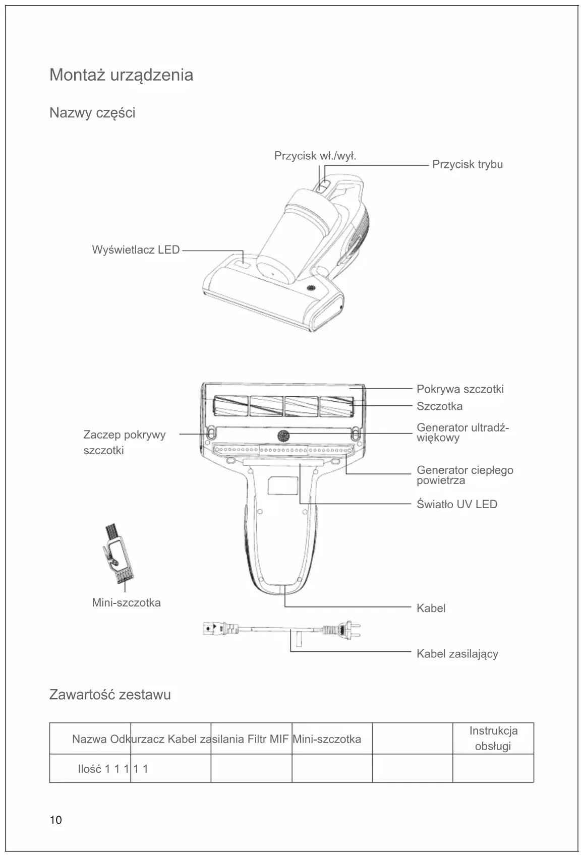 (Rys.12) Ostrzeżenia Prosimy o ostrożne zapoznanie się z instrukcją przed użyciem i zachowanie jej na przyszłość. Nie należy zostawiać działającego urządzenia bez nadzoru. Wyłącz zasilanie i odłącz kabel zasilania, jeśli urządzenie jest zostawiane bez nadzoru. Nie należy odłączać kabla mokrą ręką. Odłącz zasilanie od urządzenia, jeśli jest czyszczone lub nieużywane. Należy trzymać kabel z dala od ostrych obiektów. For safety reasons, please do not use the product to clean hot objects such as carbon, cigarette butts, sharp objects such as broken glass, corrosive liquids, ammable and explosive materials such as gasoline and alcohol. Otherwise it may cause product damage or re. Nie należy używać tego produktu do odkurzacza wody lub mokrego brudu. Nie zaleca się używać w wilgotnych pomieszczeniach (łazienkach, toalecie). Nie należy kłaść urządzenia w pobliżu urządzeń grzejących ani nie należy zostawiać go na słońcu. Produkt należy trzymać poza zasięgiem dzieci. Nie należy używać urządzenia, jeśli wlot jest zablokowany. Produkt korzysta ze światła UV. Dla bezpieczeństwa, nie należy patrzeć bezpośrednio na spód urządzenia gdy jest włączone.14 Nie należy używać urządzenia na roślinach. Nadmierne światło UV może je uszkodzić. Nie należy siadać na urządzeniu – może to doprowadzić do zranień i uszkodzenia produktu. Nie należy zdejmować pokrywy szczotki lub otwierać jej gdy urządzenie pracuje. Produkt może być używany tylko do czyszczenia tkanin, materacy, kocy, poduszek oraz sof. Jeśli kabel posiada widoczne uszkodzenia, skontaktuj się z serwisem w celu naprawy.15 Rozwiązywanie problemów Wypróbuj poniższe rozwiązania, zanim oddasz urządzenie do serwisu. Problem Możliwa przyczyna Rozwiązanie Brak zasilania Kabel zasilania nie jest poprawnie podłączony. Podłącz kabel jeszcze raz po- prawnie. Gniazdko nie jest zasilane. Sprawdź stan gniazdka. Przycisk zasilania nie jest naciśnięty. Naciśnij przycisk on/off. Słaba moc ssania Wlot zatkany. Wyczyść wlot. Na ltrze uzbierał się kurz. Wyczyść zbiornik oraz ltr MIF. Na cyklonie zebrał się kurz. Wyczyść cyklon. UV tube failure Problem z tubą