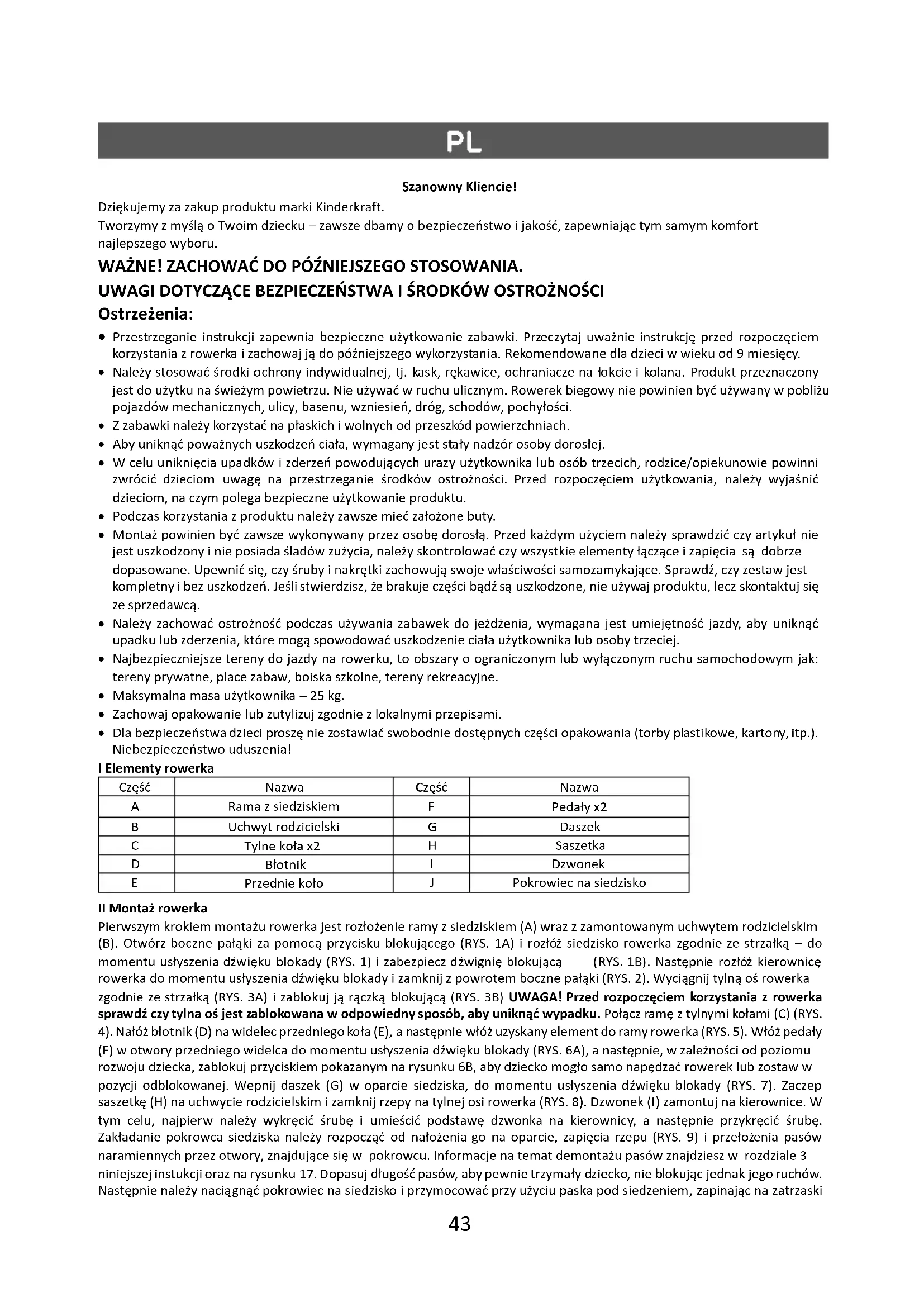 Pokrowiec na siedzisko II Montaż rowerka Pierwszym krokiem montażu rowerka jest rozłożenie ramy z siedziskiem (A) wraz z zamontowanym uchwytem rodzicielskim (B). Otwórz boczne pałąki za pomocą przycisku blokującego (RYS. 1A) i rozłóż siedzisko rowerka zgodnie ze strzałką – do momentu usłyszenia dźwięku blokady (RYS. 1) i zabezpiecz dźwignię blokującą (RYS. 1B). Następnie rozłóż kierownicę rowerka do momentu usłyszenia dźwięku blokady i zamknij z powrotem boczne pałąki (RYS. 2). Wyciągnij tylną oś rowerka zgodnie ze strzałką (RYS. 3A) i zablokuj ją rączką blokującą (RYS. 3B) UWAGA! Przed rozpoczęciem korzystania z rowerka sprawdź czy tylna oś jest zablokowana w odpowiedny sposób, aby uniknąć wypadku. Połącz ramę z tylnymi kołami (C) (RYS. 4). Nałóż błotnik (D) na widelec przedniego koła (E), a następnie włóż uzyskany element do ramy rowerka (RYS. 5). Włóż pedały (F) w otwory przedniego widelca do momentu usłyszenia dźwięku blokady (RYS. 6A), a następnie, w zależności od poziomu rozwoju dziecka, zablokuj przyciskiem pokazanym na rysunku 6B, aby dziecko mogło samo napędzać rowerek lub zostaw w pozycji odblokowanej. Wepnij daszek (G) w oparcie siedziska, do momentu usłyszenia dźwięku blokady (RYS. 7). Zaczep saszetkę (H) na uchwycie rodzicielskim i zamknij rzepy na tylnej osi rowerka (RYS. 8). Dzwonek (I) zamontuj na kierownice. W tym celu, najpierw należy wykręcić śrubę i umieścić podstawę dzwonka na kierownicy, a następnie przykręcić śrubę. Zakładanie pokrowca siedziska należy rozpocząć od nałożenia go na oparcie, zapięcia rzepu (RYS. 9) i przełożenia pasów naramiennych przez otwory, znajdujące się w pokrowcu. Informacje na temat demontażu pasów znajdziesz w rozdziale 3 niniejszej instukcji oraz na rysunku 17. Dopasuj długość pasów, aby pewnie trzymały dziecko, nie blokując jednak jego ruchów. Następnie należy naciągnąć pokrowiec na siedzisko i przymocować przy użyciu paska pod siedzeniem, zapinając na zatrzaski44 z obu stron (RYS. 10) W kolejnym kroku należy przypiąć pokrowiec na zatrzaski znajdujące się z tyłu siedziska (RYS.11). Rowerek z poprawnie założonym pokrowcem został pokazany na rysunku 12. III Regulacja rowerka: Położenie daszka – długość daszka jest regulowana. Daszek posiada dodatkową ochronę przeciwsłoneczną, którą można wyciągnąć spod spodu (RYS. 13). Podnóżek – w zależności od poziomu rozwoju dziecka, podnóżek można rozłożyć albo złożyć. W celu rozłożenia/złożenia należy odciągnąć dźwignię (RYS. 14), a następnie ustawić podpórki stóp w wygodnej pozycji. UWAGA! Zawsze, kiedy zamontowany jest uchwyt rodzica, a podnóżek jest rozłożony, należy rozłączyć blokadę koła w taki sposób, aby pedały swobodnie kręciły się bez wprawiania koła w ruch (napęd wyłączony). Bez rozłączenia blokady może dojść do zmiażdżenia bądź zranienia stóp! Po zdemontowaniu uchwytu rodzica należy złożyć podnóżek i połączyć blokadę koła tak, aby pedały wprawiały koło w ruch (napęd włączony). Kierownica - w zależności od poziomu rozwoju dziecka, kierownicę można połączyć albo odłączyć od przedniego koła. Aby połączyć kierownicę z przednim kołem, podnieś przycisk na błotniku do momentu zablokowania - wówczas zostanie w górnej pozycji (RYS. 15). Pasy zabezpieczające – dopasuj długość, aby pewnie trzymały dziecko, nie blokując jednak jego ruchów. Regulacja długości uchwytu rodzicielskiego – odblokuj plastikową dźwignię i wciśnij metalowy zatrzask, aby móc zmienić długość uchwytu rodzicielskiego (RYS. 16). Pamiętaj, że po ustawieniu długości, dźwignia i zatrzask powinny być zabezpieczone. Rowerek można przystosować dla dzieci starszych (RYS. 19) poprzez demontażu daszku, bocznych osłon (RYS. 18), pasów i uchwytu rodzicielskiego oraz złożenie podnóżka. Demontaż pasów jest pokazany na rysunku 17, pasy należy zdemontować najpierw przy klamrze zabezpieczającej z przodu rowerka, a następnie przeciągnąć uwolnione końca przez otwory w oparciu. W celu demontażu pasa krokowego należy wykręcić śrubę mocującą siedzisko, a następnie wykręcić śrubę mocującą pas pod spodem siedziska. Hamulec – rowerek posiada hamulec tylnego koła (RYS. 20). IV Złożenie i transport W celu złożenia rowerka otwórz boczne pałąki za pomocą przycisku blokującego, podciągnij dźwignię znajdującą się na kierownicy i złóż kierownicę zgodnie ze strzałką na rysunku 21. Następnie odblokuj i podciągnij dźwignię blokującą na uchwycie rodzicielskim składając oparcie siedziska na ramie (RYS. 22A) i przełóż daszek w stronę tylnych kół zgodnie ze strzałką (RYS. 22B). Zamknij z powrotem boczne pałąki. Pręty stelaża daszku mogą być nieco ściśnięte. Podciągnij rączkę blokującą i złóż tylną oś pod spodem ramy rowerka, aż się zablokuje (RYS. 23). Upewnij się wcześniej, że podnóżek jest złożony. Zdemontuj przednie koło za pomocą przycisku na ramie rowerka (RYS. 24). Jeśli zajdzie potrzeba, tylne koła można demontować wciskając srebrne przyciski na tylnej osi. Rowerek można transportować w dwa sposoby: