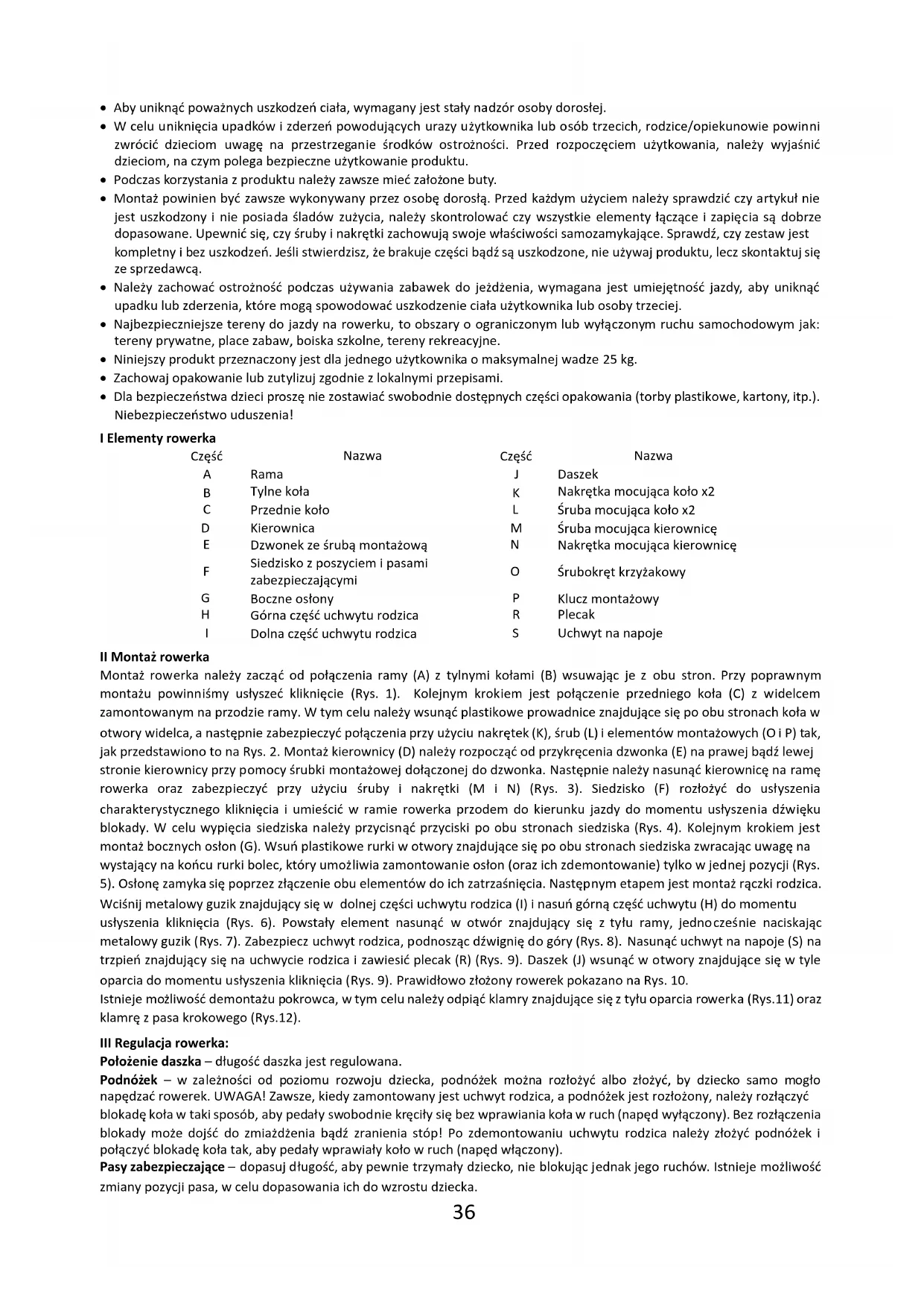 - Należy stosować środki ochrony indywidualnej, tj. kask, rękawice, ochraniacze na łokcie i kolana. Produkt przeznaczony jest do użytku na świeżym powietrzu. Nie używać w ruchu ulicznym. Rowerek biegowy nie powinien być używany w pobliżu pojazdów mechanicznych, ulicy, basenu, wzniesień, dróg, schodów, pochyłości.
