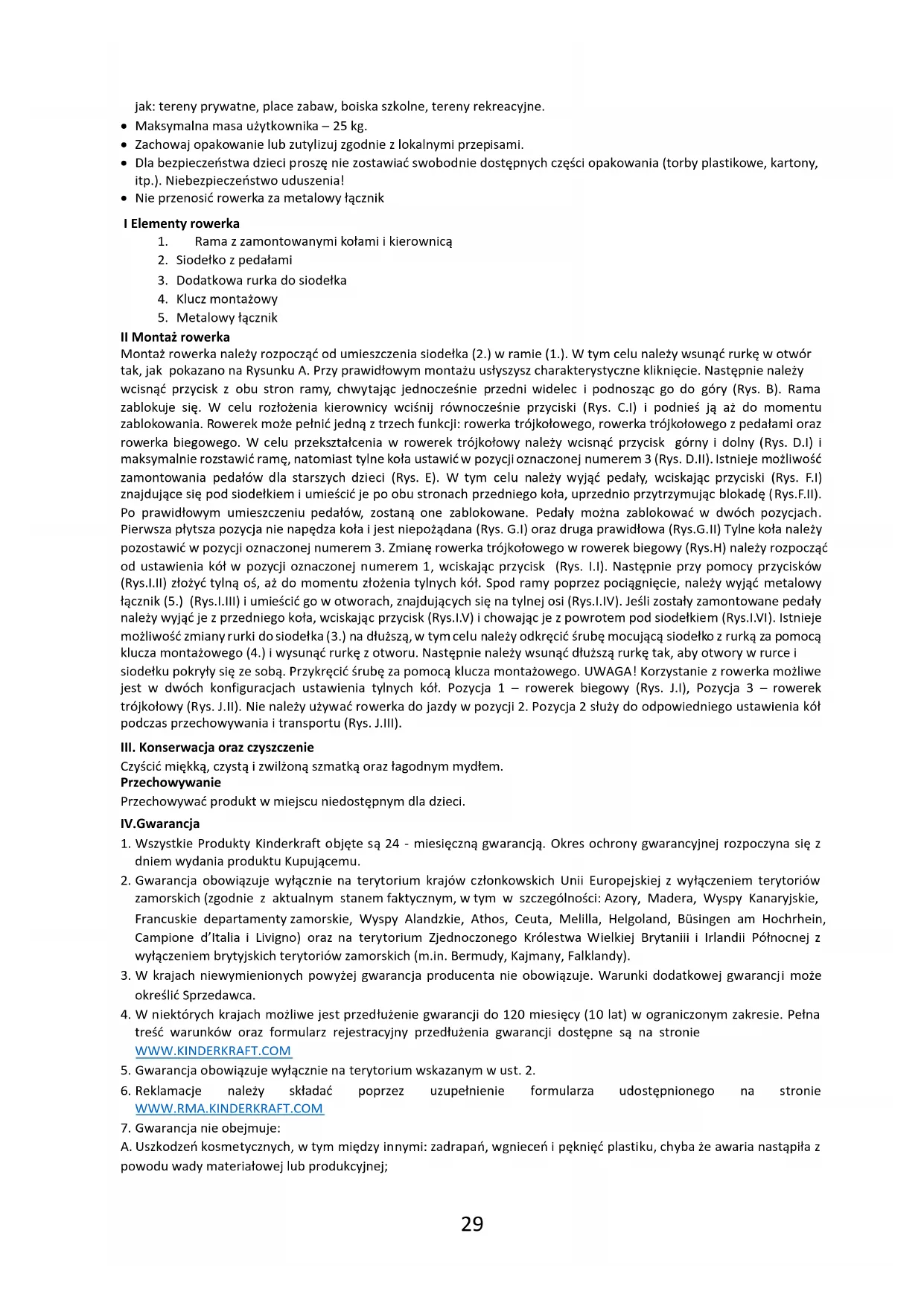II Montaż rowerka Montaż rowerka należy rozpocząć od umieszczenia siodełka (2.) w ramie (1.). W tym celu należy wsunąć rurkę w otwór tak, jak pokazano na Rysunku A. Przy prawidłowym montażu usłyszysz charakterystyczne kliknięcie. Następnie należy wcisnąć przycisk z obu stron ramy, chwytając jednocześnie przedni widelec i podnosząc go do góry (Rys. B). Rama zablokuje się. W celu rozłożenia kierownicy wciśnij równocześnie przyciski (Rys. C.I) i podnieś ją aż do momentu zablokowania. Rowerek może pełnić jedną z trzech funkcji: rowerka trójkołowego, rowerka trójkołowego z pedałami oraz rowerka biegowego. W celu przekształcenia w rowerek trójkołowy należy wcisnąć przycisk górny i dolny (Rys. D.I) i maksymalnie rozstawić ramę, natomiast tylne koła ustawić w pozycji oznaczonej numerem 3 (Rys. D.II). Istnieje możliwość zamontowania pedałów dla starszych dzieci (Rys. E). W tym celu należy wyjąć pedały, wciskając przyciski (Rys. F.I) znajdujące się pod siodełkiem i umieścić je po obu stronach przedniego koła, uprzednio przytrzymując blokadę (Rys.F.II). Po prawidłowym umieszczeniu pedałów, zostaną one zablokowane. Pedały można zablokować w dwóch pozycjach. Pierwsza płytsza pozycja nie napędza koła i jest niepożądana (Rys. G.I) oraz druga prawidłowa (Rys.G.II) Tylne koła należy pozostawić w pozycji oznaczonej numerem 3. Zmianę rowerka trójkołowego w rowerek biegowy (Rys.H) należy rozpocząć od ustawienia kół w pozycji oznaczonej numerem 1, wciskając przycisk (Rys. I.I). Następnie przy pomocy przycisków (Rys.I.II) złożyć tylną oś, aż do momentu złożenia tylnych kół. Spod ramy poprzez pociągnięcie, należy wyjąć metalowy łącznik (5.) (Rys.I.III) i umieścić go w otworach, znajdujących się na tylnej osi (Rys.I.IV). Jeśli zostały zamontowane pedały należy wyjąć je z przedniego koła, wciskając przycisk (Rys.I.V) i chowając je z powrotem pod siodełkiem (Rys.I.VI). Istnieje możliwość zmiany rurki do siodełka (3.) na dłuższą, w tym celu należy odkręcić śrubę mocującą siodełko z rurką za pomocą klucza montażowego (4.) i wysunąć rurkę z otworu. Następnie należy wsunąć dłuższą rurkę tak, aby otwory w rurce i siodełku pokryły się ze sobą. Przykręcić śrubę za pomocą klucza montażowego. UWAGA! Korzystanie z rowerka możliwe jest w dwóch konfiguracjach ustawienia tylnych kół. Pozycja 1 – rowerek biegowy (Rys. J.I), Pozycja 3 – rowerek trójkołowy (Rys. J.II). Nie należy używać rowerka do jazdy w pozycji 2. Pozycja 2 służy do odpowiedniego ustawienia kół podczas przechowywania i transportu (Rys. J.III).