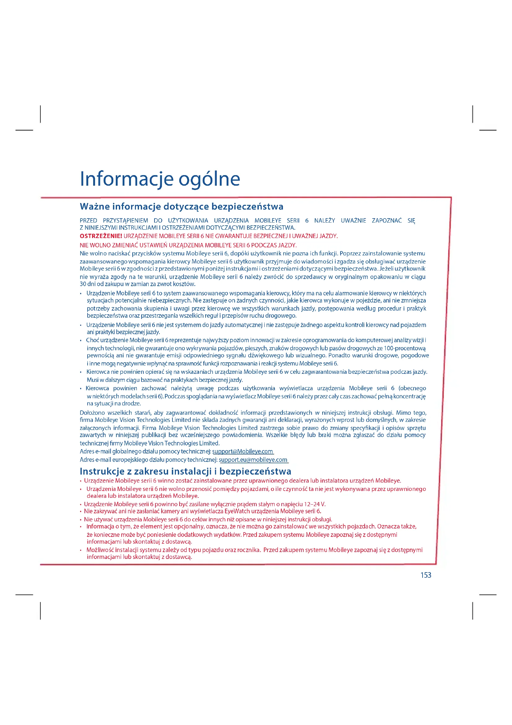 - Kierowca powinien zachować należytą uwagę podczas użytkowania wyświetlacza urządzenia Mobileye serii 6 (obecnego w niektórych modelach serii 6). Podczas spoglądania na wyświetlacz Mobileye serii 6 należy przez cały czas zachować pełną koncentrację na sytuacji na drodze. Dołożono wszelkich starań, aby zagwarantować dokładność informacji przedstawionych w niniejszej instrukcji obsługi. Mimo tego, rma Mobileye Vision Technologies Limited nie składa żadnych gwarancji ani deklaracji, wyrażonych wprost lub domyślnych, w zakresie załączonych informacji. Firma Mobileye Vision Technologies Limited zastrzega sobie prawo do zmiany specykacji i opisów sprzętu zawartych w niniejszej publikacji bez wcześniejszego powiadomienia. Wszelkie błędy lub braki można zgłaszać do działu pomocy technicznej rmy Mobileye Vision Technologies Limited. Adres e-mail globalnego działu pomocy technicznej: support@Mobileye.com Adres e-mail europejskiego działu pomocy technicznej: support.eu@mobileye.com Instrukcje z zakresu instalacji i bezpieczeństwa