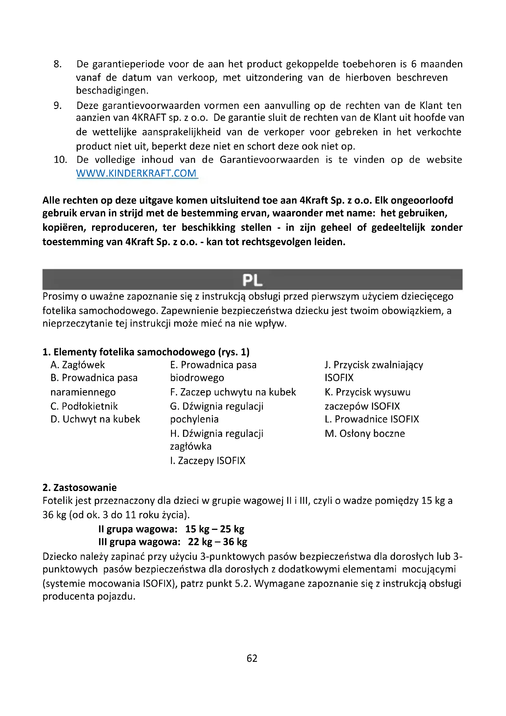 Wszelkie prawa do niniejszego opracowania należą w całości do 4Kraft Sp. z o.o. Jakiekolwiek ich nieuprawnione użycie niezgodnie z ich przeznaczeniem, w tym szczególności: używanie, kopiowanie, powielanie, udostępnianie – w całości lub części bez zgody 4Kraft Sp. z o.o. może skutkować konsekwencjami natury prawnej.69 Por favor, leia atentamente as instruções antes de usar a cadeirinha infantil pela primeira vez. Manter a sua criança segura é da sua responsabilidade e não ler este manual poderá afeta-la.