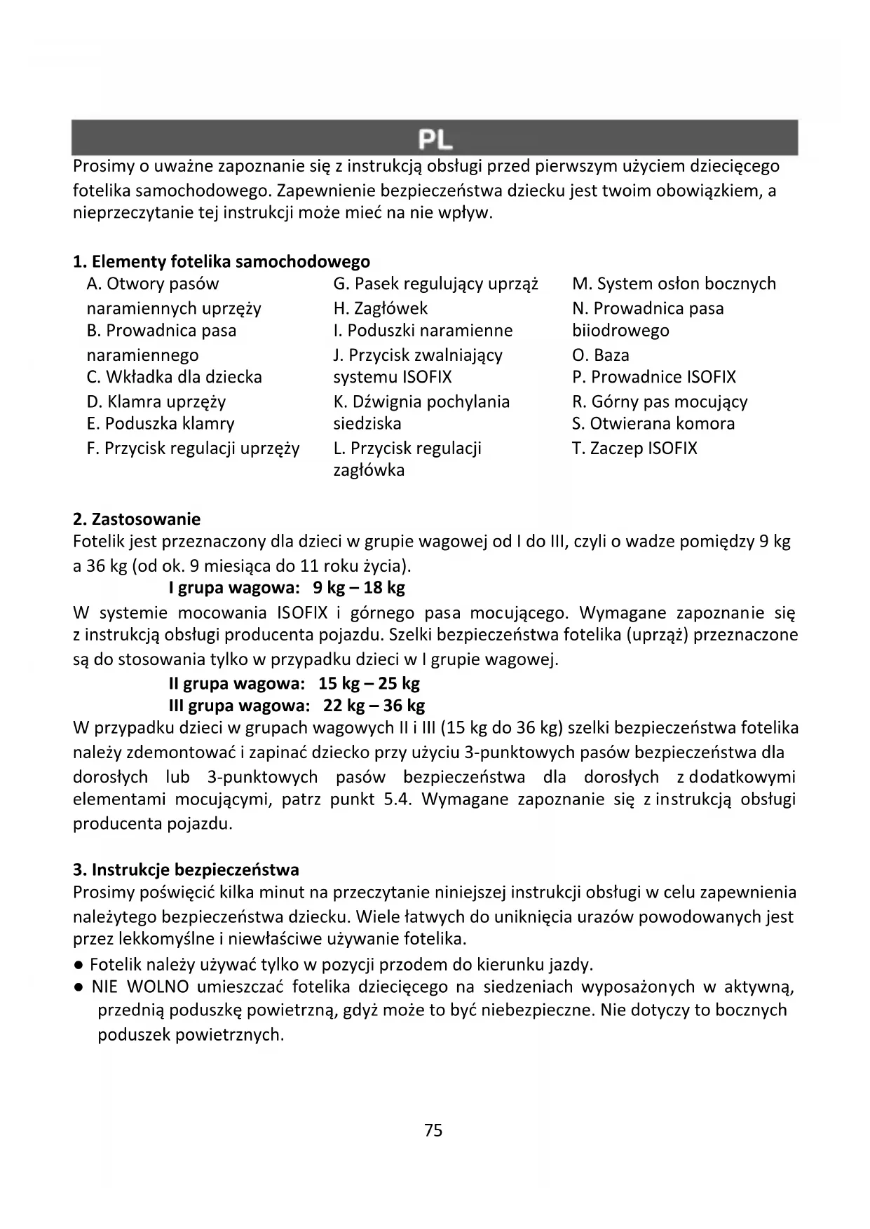 Prosimy poświęcić kilka minut na przeczytanie niniejszej instrukcji obsługi w celu zapewnienia należytego bezpieczeństwa dziecku. Wiele łatwych do uniknięcia urazów powodowanych jest przez lekkomyślne i niewłaściwe używanie fotelika. ● Fotelik należy używać tylko w pozycji przodem do kierunku jazdy. ● NIE WOLNO umieszczać fotelika dziecięcego na siedzeniach wyposażonych w aktywną, przednią poduszkę powietrzną, gdyż może to być niebezpieczne. Nie dotyczy to bocznych poduszek powietrznych.76 ● W przypadku zamontowania fotelika na przednim siedzeniu, należy wyłączyć poduszkę powietrzną lub przesunąć fotel pasażera jak najbardziej do tyłu (sprawdź instrukcję obsługi samochodu). ● Zaleca się montowanie fotelika jedynie na tylnych siedzeniach samochodu. ● Wskazówki na temat przydatności siedzenia samochodu do użycia z fotelikiem dziecięcym można znaleźć w podręczniku użytkowania samochodu. ● Nadaje się do instalacji jedynie wówczas, gdy homologowane pojazdy wyposażone są w trzypunktowe, wyposażone w zwijacz pasy bezpieczeństwa, które uzyskały homologację zgodnie z regulaminem ONZ/EKG nr 16 lub innymi równoważnymi normami. ● Pamiętaj, aby wszelkie pasy mocujące fotelik do pojazdu były napięte; szelki przytrzymujące dziecko były dopasowane do budowy jego ciała oraz by pasy/szelki nie były poskręcane. ● Fotelik należy wymienić, jeśli został on poddany gwałtownym obciążeniom działającym podczas wypadku drogowego. ● Fotelika nie wolno poddawać żadnym modyfikacjom. ● Fotelik dziecięcy należy chronić przed bezpośrednim działaniem słońca, inaczej nagrzane elementy mogą oparzyć twoje dziecko. ● Nigdy nie zostawiaj dziecka w foteliku bez opieki. ● Należy zwrócić uwagę na to, aby bagaże i inne przedmioty były wystarczająco zabezpieczone, w szczególności na półce pod tylną szybą, gdyż w razie zderzenia mogą one spowodować obrażenia ciała. ● Fotelik nie może być używany bez tapicerki. ● Nie należy używać zamiennych tapicerek, innych niż te, rekomendowane przez producenta, ponieważ stanowi ona integralną częścią systemu bezpieczeństwa fotelika. ● Zaleca się zachowanie instrukcji obsługi fotelika przez cały okres jego użytkowania. ● Nie należy stosować innych punktów mocowań, niż punkty opisane w instrukcji i oznaczone na foteliku dla dzieci. ● Wszystkie twarde elementy oraz plastikowe części fotelika dla dzieci należy umieścić i zainstalować w taki sposób, by w normalnych warunkach eksploatacji pojazdu nie mogły zostać uwięzione przez przesuwne siedzenie lub drzwi pojazdu. ● Regularnie sprawdzaj stan techniczny szelek bezpieczeństwa, szczególną uwagę zwróć na punkty mocowania, szwy, oraz elementy regulujące. ● Zaprzestań korzystać z fotelika, jeżeli jego części uległy uszkodzeniu lub obluzowaniu po wypadku. ● W przypadku wystąpienia sytuacji awaryjnej ważne jest szybkie rozpięcie pasów bezpieczeństwa. Oznacza to, że przycisk zwalniający szelki nie jest w pełni zabezpieczony, dopilnuj, aby twoje dziecko wiedziało, że nie wolno bawić się klamrą. ● Nie korzystaj z fotelika w domu. Nie jest przystosowany do użytku domowego i należy go używać jedynie podczas podróży samochodem. ● Tył oparcia fotelika musi opierać się płasko o oparcie fotela samochodu. Należy przy tym zwrócić uwagę, aby poprzez zagłówek samochodowy nie doszło do powstania niechcianego odstępu między oparciem fotelika a oparciem fotela pojazdu. Niektóre77 zagłówki samochodowe stanowią przeszkodę przy montażu fotelika samochodowego i dlatego należy je najpierw zdemontować. ● Klamra pasa bezpieczeństwa dla dorosłych nie może znajdować się zbyt blisko spodu podłokietnika fotelika. W przypadku wątpliwości odnośnie tego punktu, skontaktuj się z producentem fotelika. ● Należy dawać dziecku dobry przykład i zawsze przypinać się pasami. Zagrożenie dla dziecka może stanowić również osoba dorosła nieprzypięta pasami bezpieczeństwa. ● Przed każdą podróżą samochodem upewnij się, że fotelik jest poprawnie przymocowany. ● Fotelik należy zabezpieczyć także wtedy, gdy nie jest używany. Niezamocowany fotelik może nawet przy awaryjnym hamowaniu spowodować obrażenia ciała pasażerów.