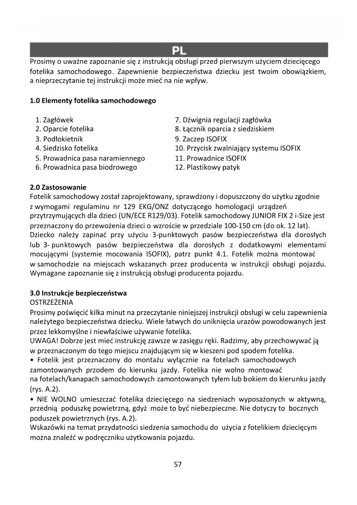 Fotelik samochodowy został zaprojektowany, sprawdzony i dopuszczony do użytku zgodnie z wymogami regulaminu nr 129 EKG/ONZ dotyczącego homologacji urządzeń przytrzymujących dla dzieci (UN/ECE R129/03). Fotelik samochodowy JUNIOR FIX 2 i-Size jest przeznaczony do przewożenia dzieci o wzroście w przedziale 100-150 cm (do ok. 12 lat). Dziecko należy zapinać przy użyciu 3-punktowych pasów bezpieczeństwa dla dorosłych lub 3- punktowych pasów bezpieczeństwa dla dorosłych z dodatkowymi elementami mocującymi (systemie mocowania ISOFIX), patrz punkt 4.1. Fotelik można montować w samochodzie na miejscach wskazanych przez producenta w instrukcji obsługi pojazdu. Wymagane zapoznanie się z instrukcją obsługi producenta pojazdu.