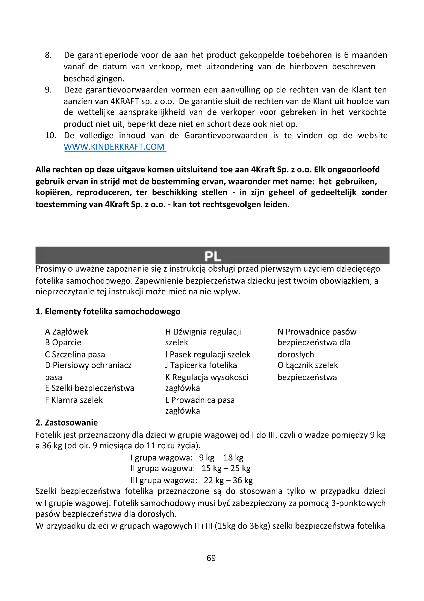 Wszelkie prawa do niniejszego opracowania należą w całości do 4Kraft Sp. z o.o. Jakiekolwiek ich nieuprawnione użycie niezgodnie z ich przeznaczeniem, w tym szczególności: używanie, kopiowanie, powielanie, udostępnianie – w całości lub części bez zgody 4Kraft Sp. z o.o. może skutkować konsekwencjami natury prawnej. Por favor, leia atentamente as instruções antes de usar a cadeirinha infantil pela primeira vez. Manter a sua criança segura é da sua responsabilidade e não ler este manual poderá afeta-la.