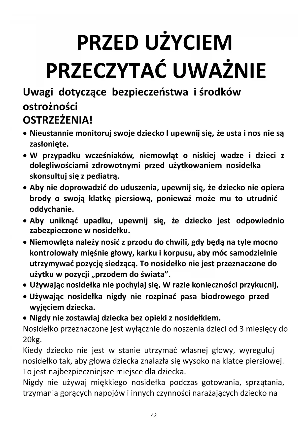 - Nigdy nie zostawiaj dziecka bez opieki z nosidełkiem. Nosidełko przeznaczone jest wyłącznie do noszenia dzieci od 3 miesięcy do 20kg. Kiedy dziecko nie jest w stanie utrzymać własnej głowy, wyreguluj nosidełko tak, aby głowa dziecka znalazła się wysoko na klatce piersiowej. To jest najbezpieczniejsze miejsce dla dziecka. Nigdy nie używaj miękkiego nosidełka podczas gotowania, sprzątania, trzymania gorących napojów i innych czynności narażających dziecko na43 poparzenie lub działanie substancji chemicznych. Zachowaj ostrożność podczas picia gorących napojów, aby uniknąć poparzenia dziecka gorącym płynem, gdy jest w nosidełku. Nosidełko służy do przenoszenia tylko jednego dziecka. Twoje ruchy, jak i ruchy dziecka, mogą mieć wpływ na twoją równowagę. Zachowaj ostrożność podczas pochylania się do przodu lub wychylania na boki. Nosidełko nie nadaje się do używania podczas zajęć sportowych m.in.: bieganie, jazda rowerem, pływanie i jazda na nartach. Nie używać nosidełka, jeśli jakikolwiek jego element został uszkodzony, rozerwany lub zgubiony. Nie montować na nosidełku akcesoriów, części zamiennych oraz elementów, które nie zostały dostarczone przez producenta. Użytkownicy powinni mieć świadomość, że wraz ze wzrostem aktywności dziecka, ryzyko upadku wzrasta.