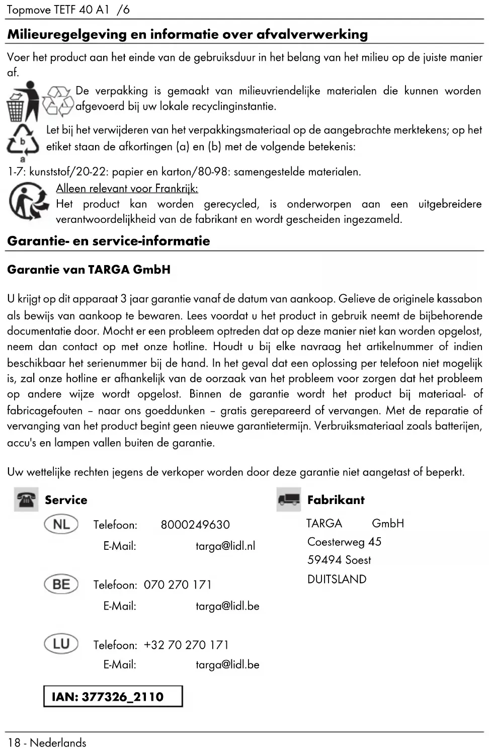 - uchwyt na parasol lub laskę (na zewnątrz torby). Czyszczenie i przechowywanie Do czyszczenia wózka na zakupy należy używać lekko zwilżonej ściereczki. W żadnym wypadku nie wolno używać rozpuszczalników ani środków czyszczących, które mogłyby uszkodzić plastik. W przypadku uporczywych zanieczyszczeń należy nanieść na wilgotną ściereczkę niewielką ilość detergentu. Następnie wysuszyć wózek na zakupy suchą ściereczką.Topmove TETF 40 A1 /6 Polski – 21 Jeśli wózek na zakupy nie będzie używany przez dłuższy czas, należy go całkowicie opróżnić. Wózek na zakupy należy przechowywać w czystym, suchym miejscu z dala od bezpośredniego światła słonecznego. Przepisy dotyczące ochrony środowiska oraz informacje o utylizacji produktu Po zakończeniu okresu użytkowania, w trosce o środowisko naturalne, produkt należy zutylizować w odpowiedni sposób. Opakowanie zostało wykonane z materiałów przyjaznych dla środowiska, które mogą być zutylizowane w lokalnym centrum recyklingu. Należy zwrócić uwagę na oznaczenia na materiale opakowaniowym przed jego utylizacją; umieszczone są na nim etykiety zawierające skróty (a) i numery (b), których znaczenie jest następujące: 1–7: tworzywa sztuczne / 20–22: papier i tektura / 80–98: materiały kompozytowe. Dotyczy tylko Francji: Produkt nadaje się do recyclingu, jest objęty rozszerzoną odpowiedzialnością producenta i podlega odrębnej zbiórce. Informacje dotyczące gwarancji i serwisu Gwarancja firmy TARGA GmbH Niniejszy produkt jest objęty trzyletnią gwarancją od daty zakupu. Należy zachować oryginalny kwit kasowy jako dowód zakupu. Przed uruchomieniem produktu prosimy dokładnie zapoznać się z załączoną dokumentacją. W razie wystąpienia problemu, którego nie można rozwiązać w ten sposób, prosimy skontaktować się z naszą infolinią pomocy technicznej. Przy każdym kontakcie z infolinią pomocy technicznej należy mieć pod ręką numer artykułu lub numer seryjny, jeśli jest dostępny. W przypadku, gdy rozwiązanie problemu przez telefon nie będzie możliwe, w zależności od przyczyny usterki nasza infolinia pomocy technicznej zorganizuje inną formę serwisowania. W razie stwierdzenia wad materiałowych lub produkcyjnych produktu, zostanie on bezpłatnie naprawiony lub wymieniony na nowy, wedle naszego swobodnego uznania. Zgodnie z art. 581 §1 polskiego kodeksu cywilnego wraz z wymianą produktu lub jego istotnej części rozpoczyna się nowy okres gwarancyjny. Gwarancja nie obejmuje części zużywających się, jak baterie, akumulatory czy elementy oświetlenia. Niniejsza gwarancja nie narusza ani nie ogranicza ustawowych praw użytkownika względem sprzedawcy.